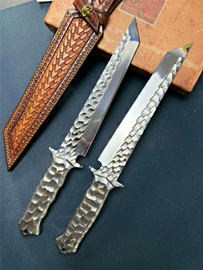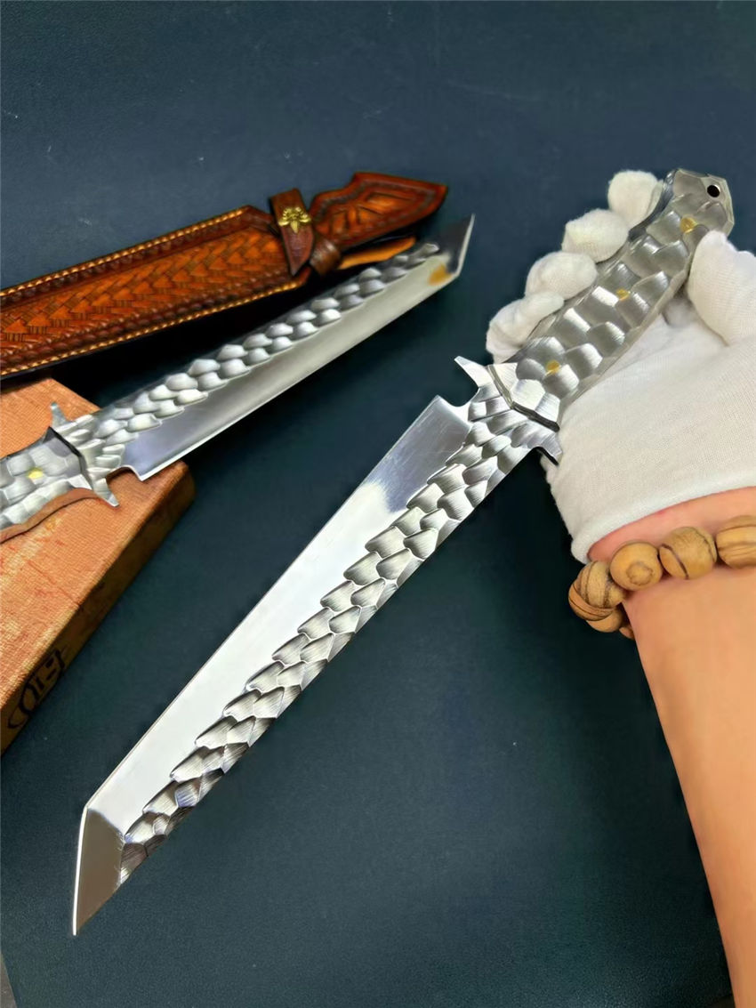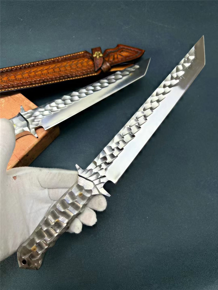 冰魄神兵直刀 总长:33cm 刃长:20cm 手柄:11.5cm 刃厚:4.5mm 钢材:日本AUS-10、一体龙骨结构 硬度:60HRC 表面工艺:手工雕刻制作 皮套:意大利高端手工皮套 日本AUS-10钢材一体龙骨手工雕刻(凹凸陨石凿石坑刀面效果),手工开刃极度锋利钢口,皮套/意大利进口手工制作、高端图案雕花皮套 、百分百纯手工打造