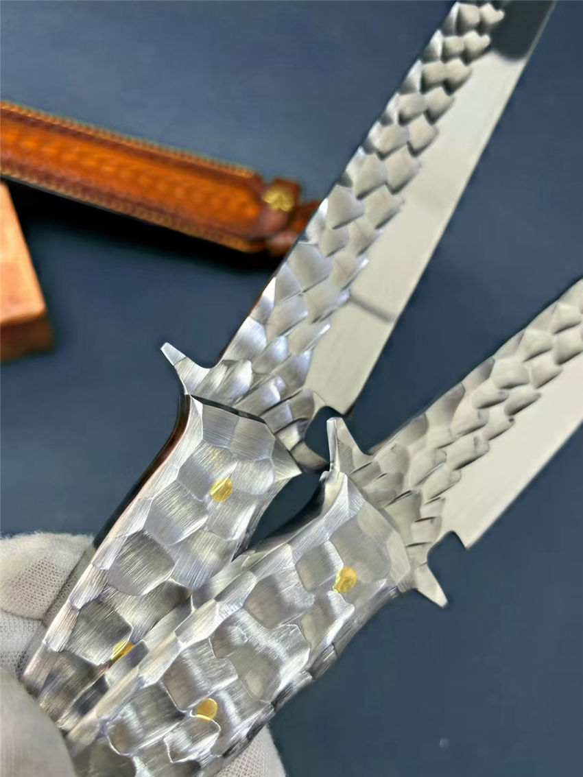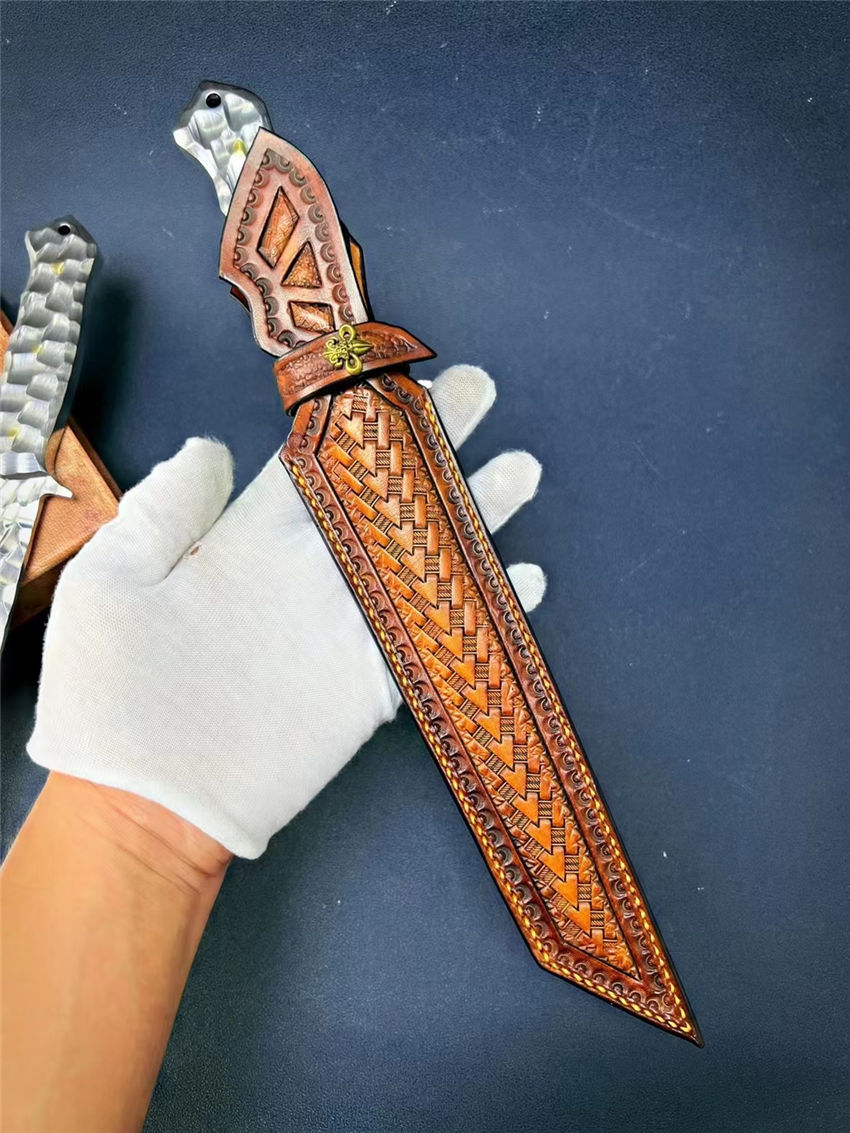 日本AUS-10钢材一体龙骨手工雕刻(凹凸陨石凿石坑刀面效果),手工开刃极度锋利钢口,皮套/意大利进口手工制作、高端图案雕花皮套 、百分百纯手工打造