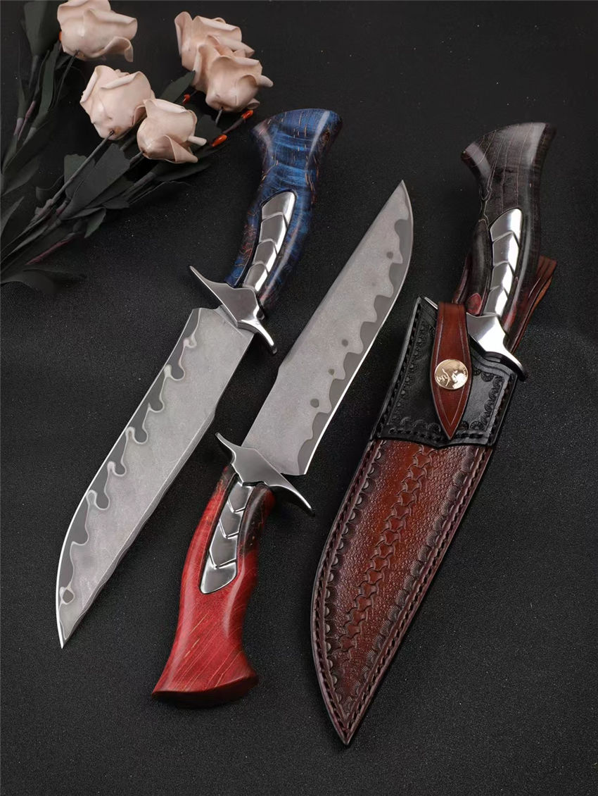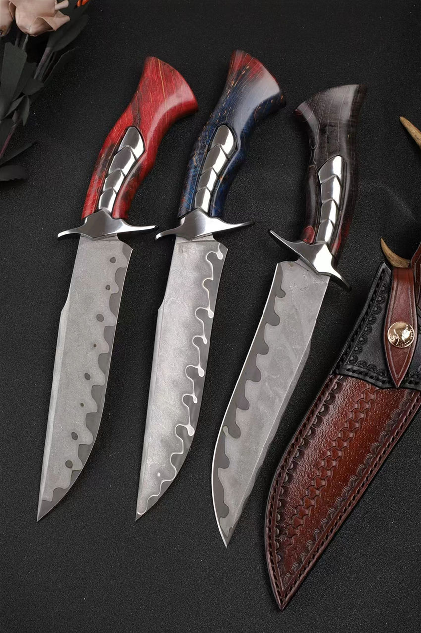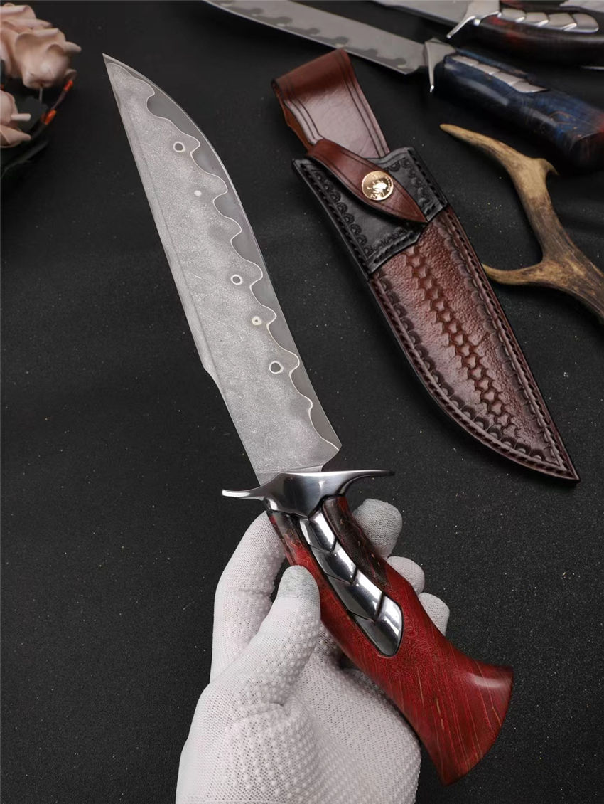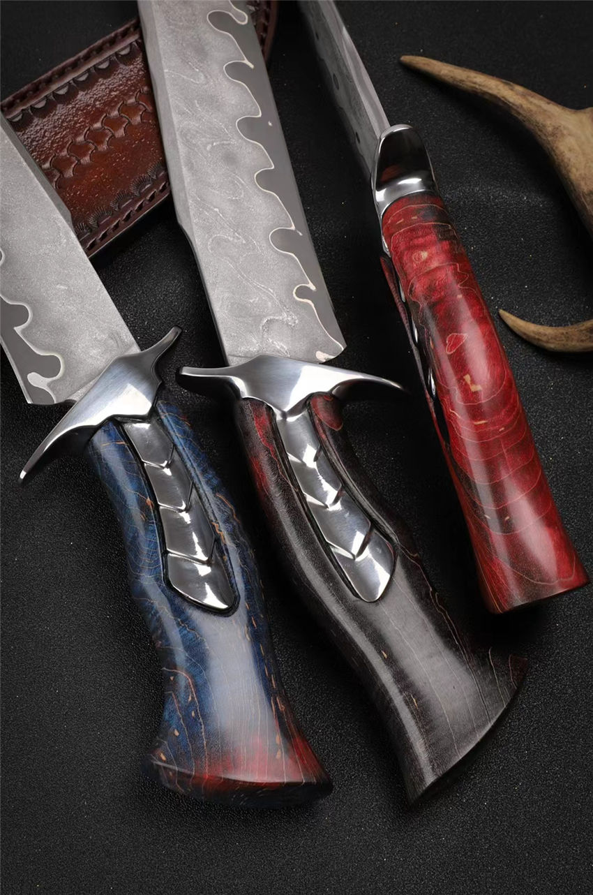 大马士革麒麟大博弈直刀 总长:37cm 刃长:24cm 手柄:13.5cm 刃宽:4.5MM 厚度:6MM 刃材:进口俄罗斯锻造大马士革钢 硬度:60-61HRC 柄材:一体不锈钢雕刻麒麟纹+七叶枫木固化木材 皮套:阿根廷进口植鞣革/手工制作高端皮套