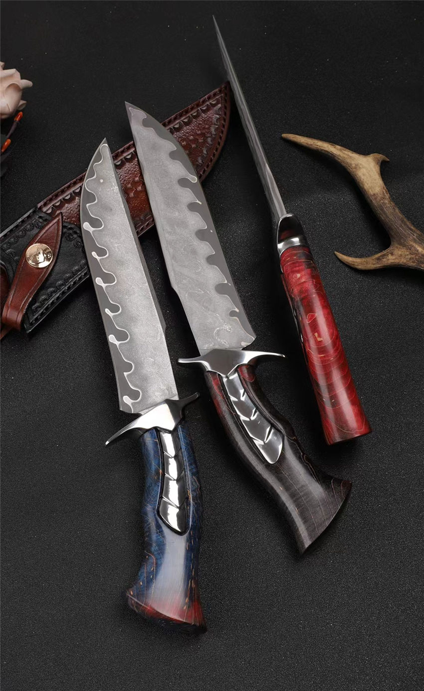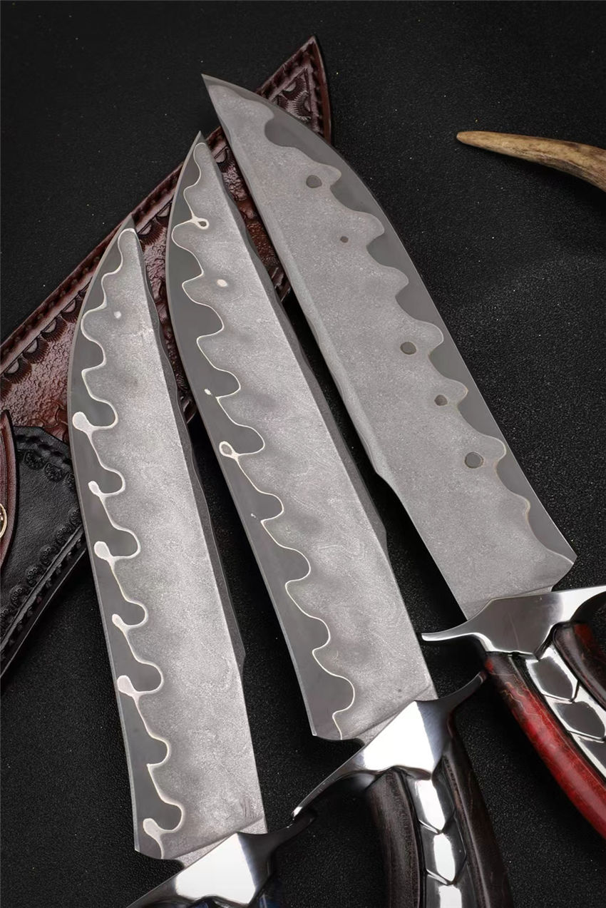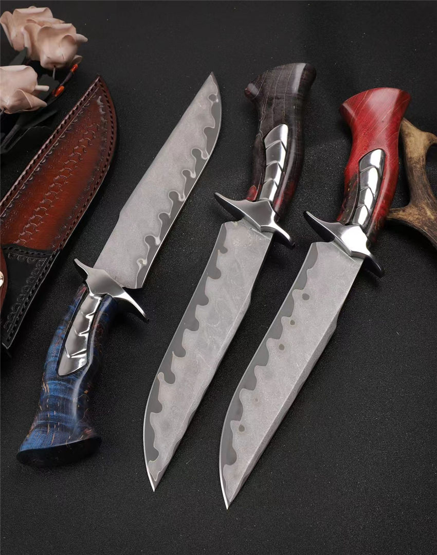 大马士革麒麟大博弈直刀 总长:37cm 刃长:24cm 手柄:13.5cm 刃宽:4.5MM 厚度:6MM 刃材:进口俄罗斯锻造大马士革钢 硬度:60-61HRC 柄材:一体不锈钢雕刻麒麟纹+七叶枫木固化木材 皮套:阿根廷进口植鞣革/手工制作高端皮套