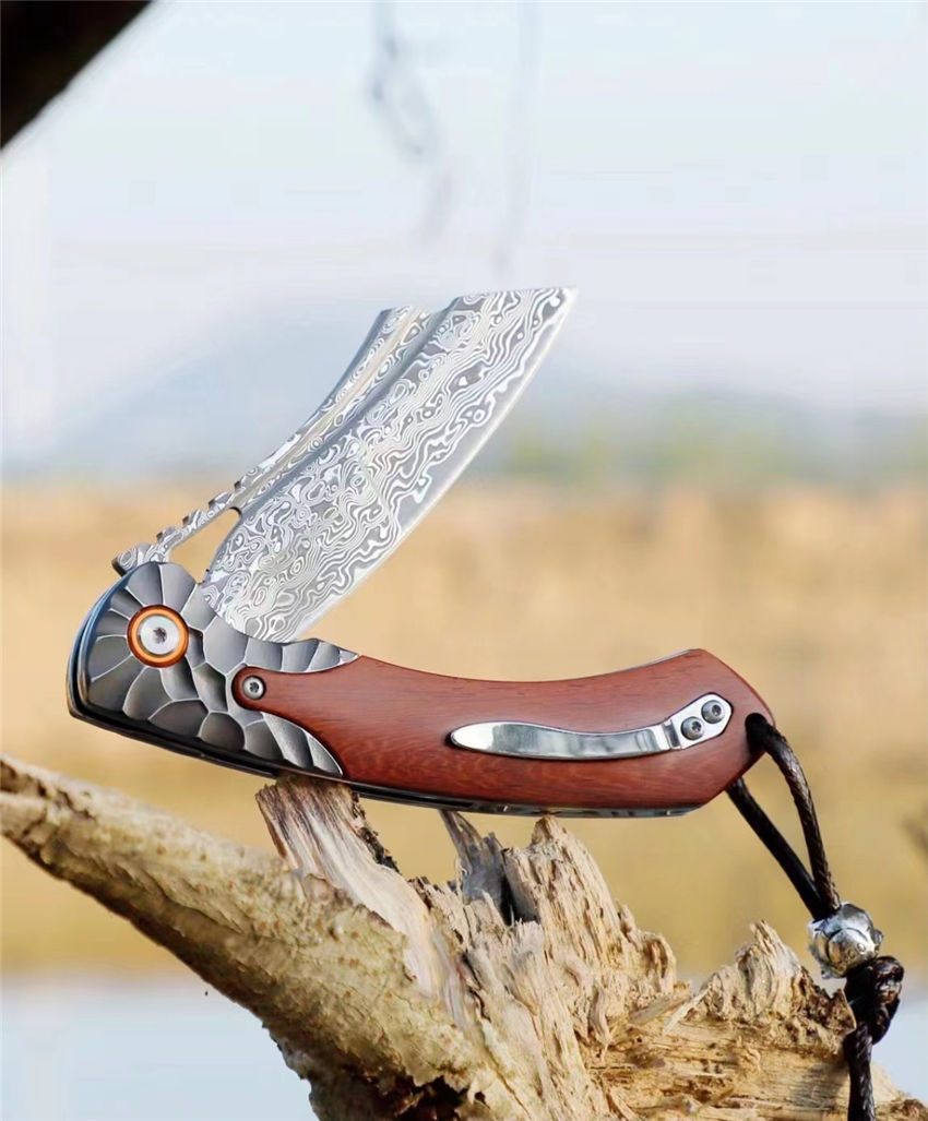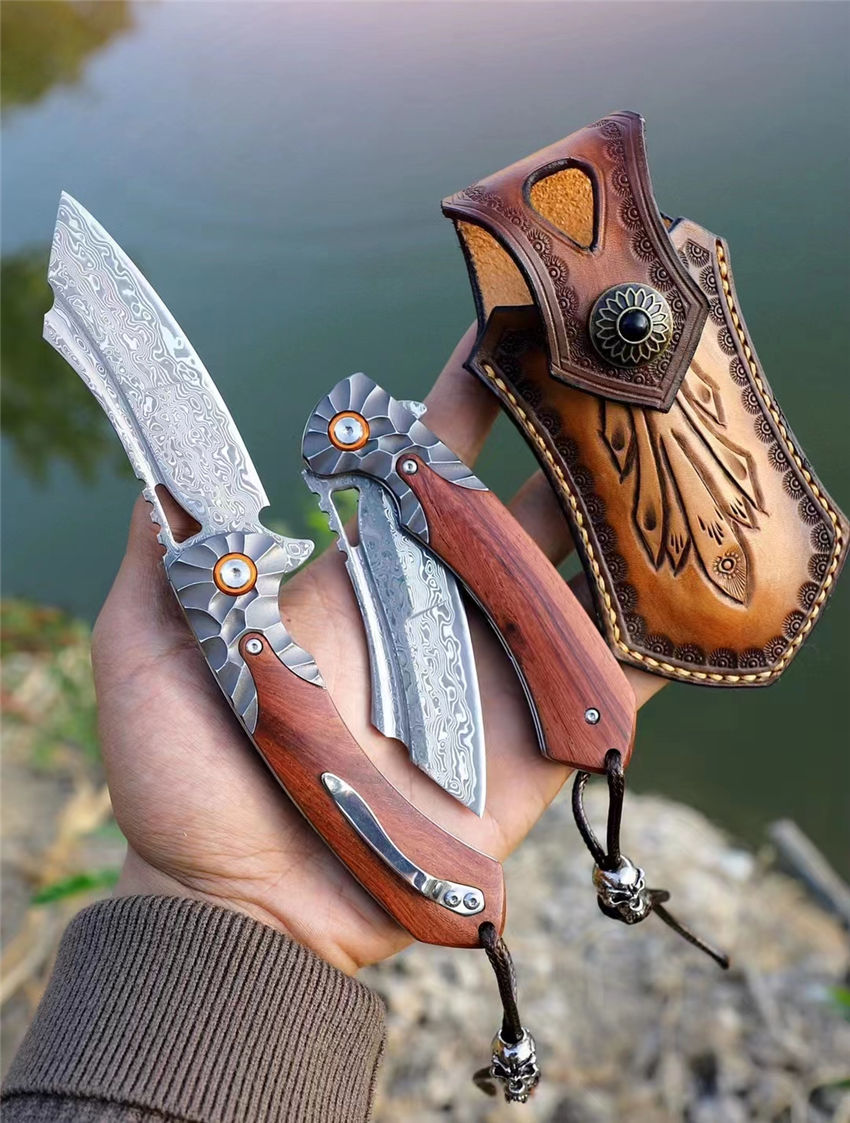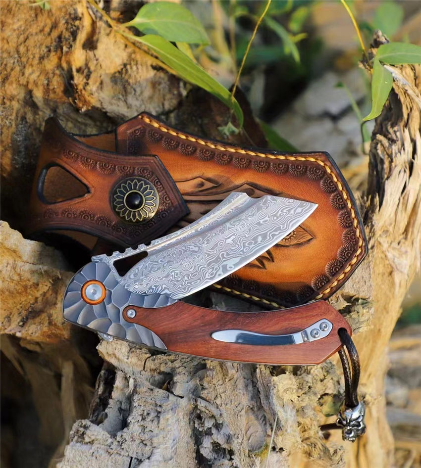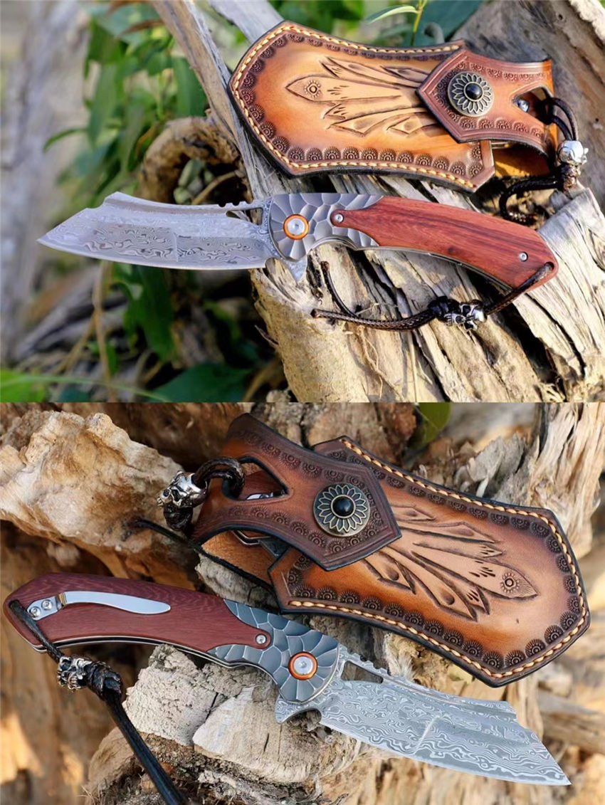 大马士革云翼快开折刀 总长:20.5cm 刀刃:8.9cm 手柄:11.8cm 厚度:3.4MM 宽度:2.5cm 材质:日本大马士革钢 硬度:60HRC 热处理:真空热处理 系统:陶瓷钢球轴承 柄材:钛合金铜圈+精雕钢头+红酸枝木 重量:180g 皮套:意大利植鞣皮,纯手工雕花制作 包装:骷髅吊坠+手工皮套+礼品盒包装