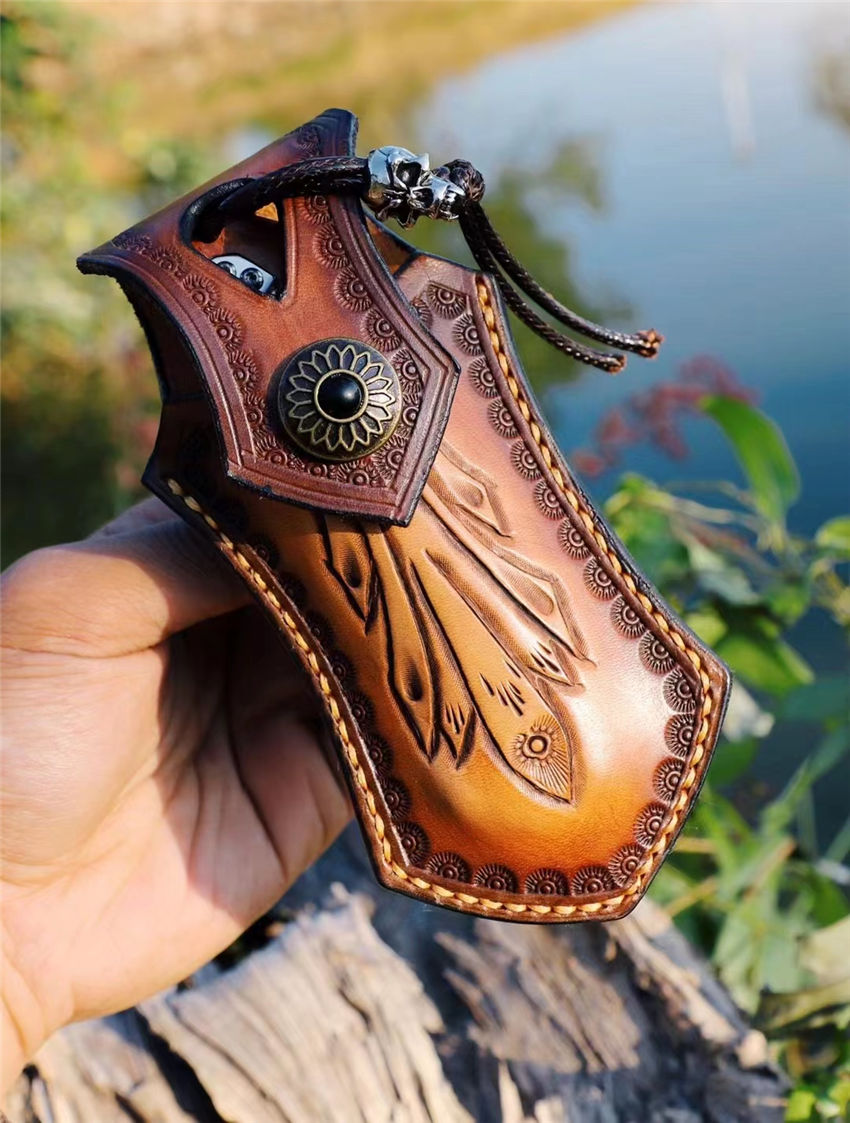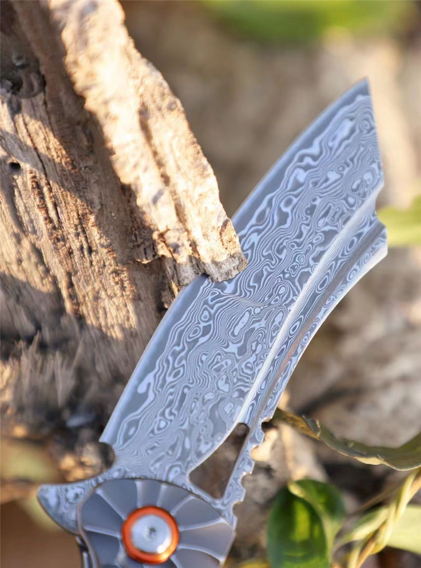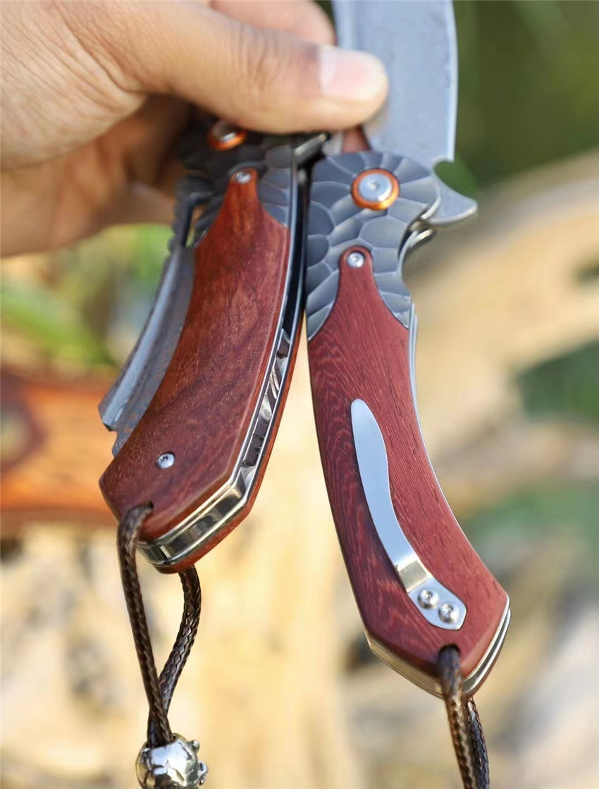 大马士革云翼快开折刀 总长:20.5cm 刀刃:8.9cm 手柄:11.8cm 厚度:3.4MM 宽度:2.5cm 材质:日本大马士革钢 硬度:60HRC 热处理:真空热处理 系统:陶瓷钢球轴承 柄材:钛合金铜圈+精雕钢头+红酸枝木 重量:180g 皮套:意大利植鞣皮,纯手工雕花制作 包装:骷髅吊坠+手工皮套+礼品盒包装