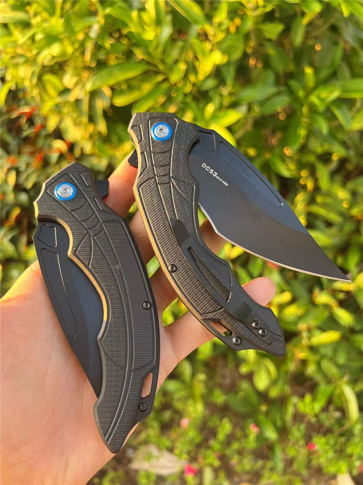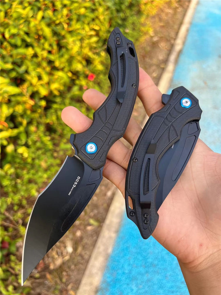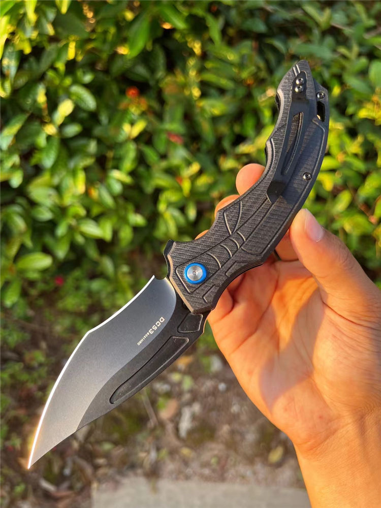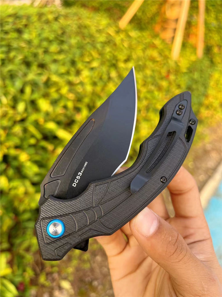 DC53黑蜘蛛快开折刀 全长:22.5cm 刃长:10cm 柄长:13.cm 刃宽:3.6cm(最宽处) 刃厚:3.5mm 刃材:DC53合金钢 硬度:60HRC 刀柄:g10 表面:CNC数控开磨 开关方式:快开,内置陶瓷轴承,非常锋利,适用户外,求生,防卫等 刀重:155g 快开中型大折刀,陶瓷滚珠轴承开刀系统,DC53合金钢制造,正品材料保证假一赔十,进口G10材料手柄,可户外野营️携带,多功能性使用,不锈钢口袋背夹