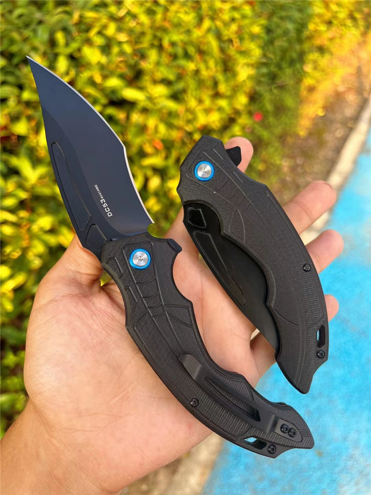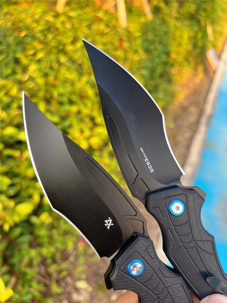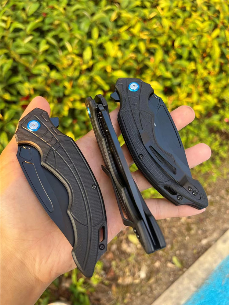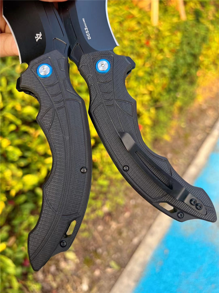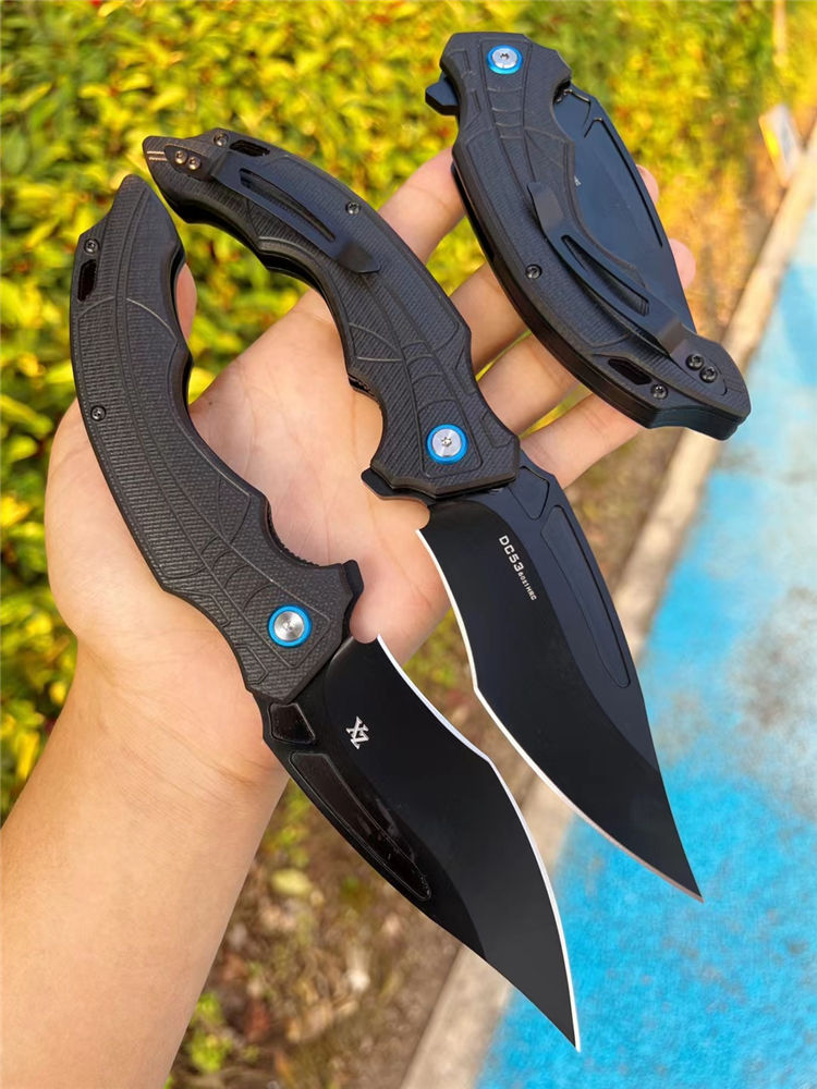 DC53黑蜘蛛快开折刀 全长:22.5cm 刃长:10cm 柄长:13.cm 刃宽:3.6cm(最宽处) 刃厚:3.5mm 刃材:DC53合金钢 硬度:60HRC 刀柄:g10 表面:CNC数控开磨 开关方式:快开,内置陶瓷轴承,非常锋利,适用户外,求生,防卫等 刀重:155g 快开中型大折刀,陶瓷滚珠轴承开刀系统,DC53合金钢制造,正品材料保证假一赔十,进口G10材料手柄,可户外野营️携带,多功能性使用,不锈钢口袋背夹