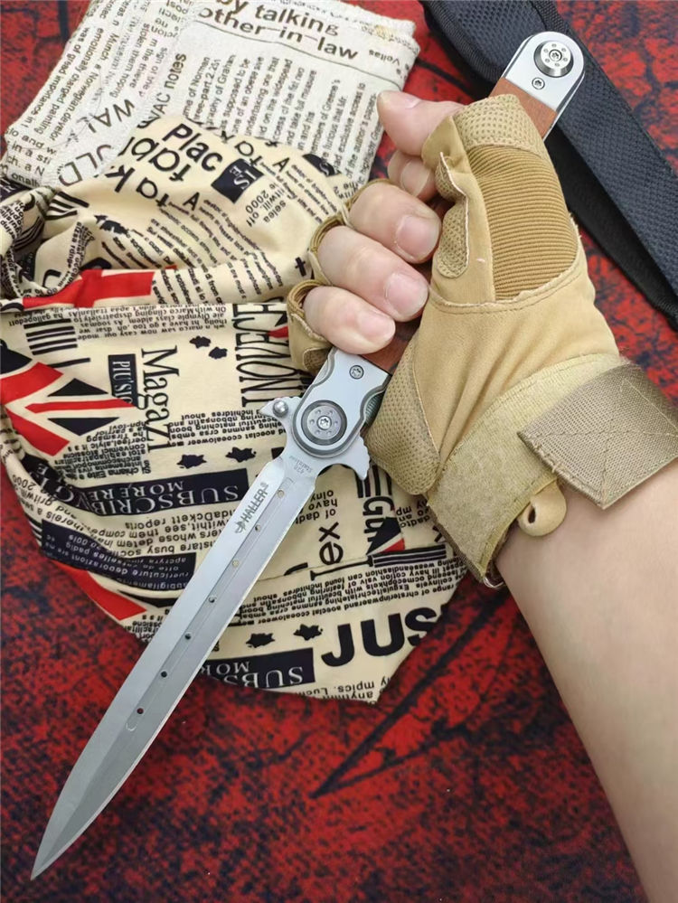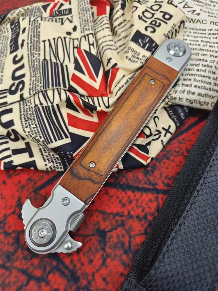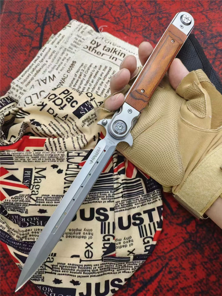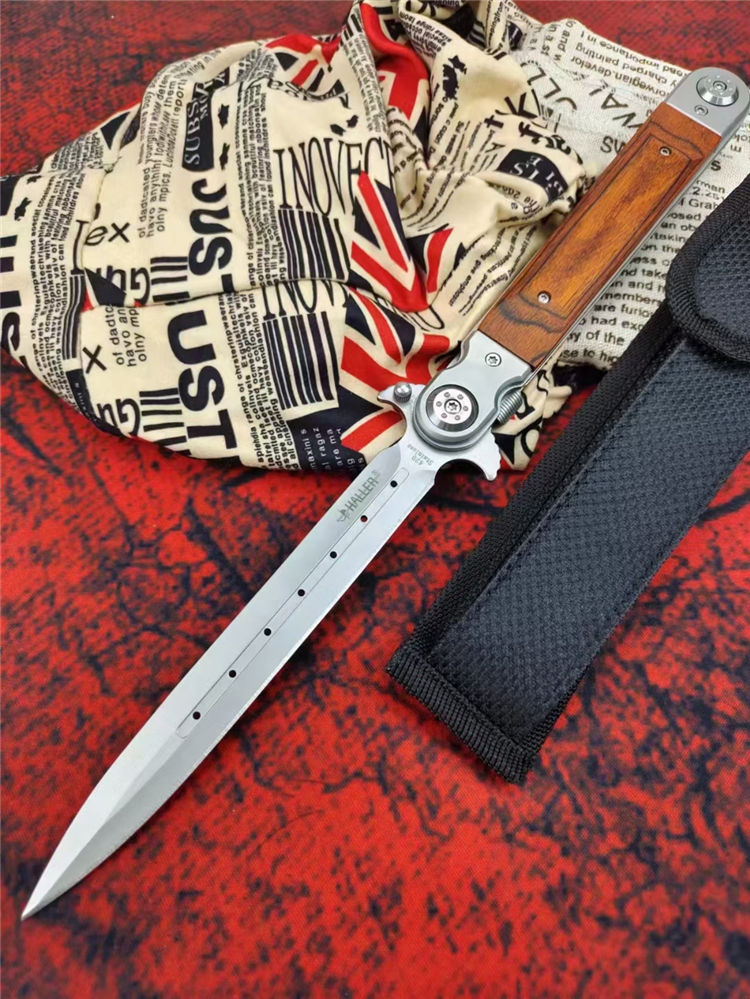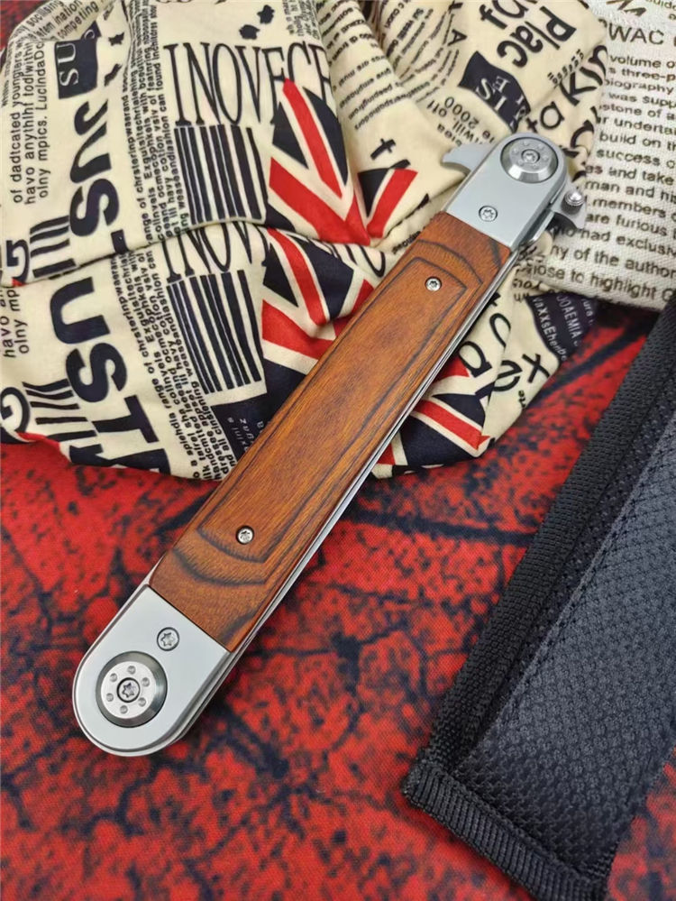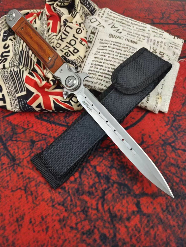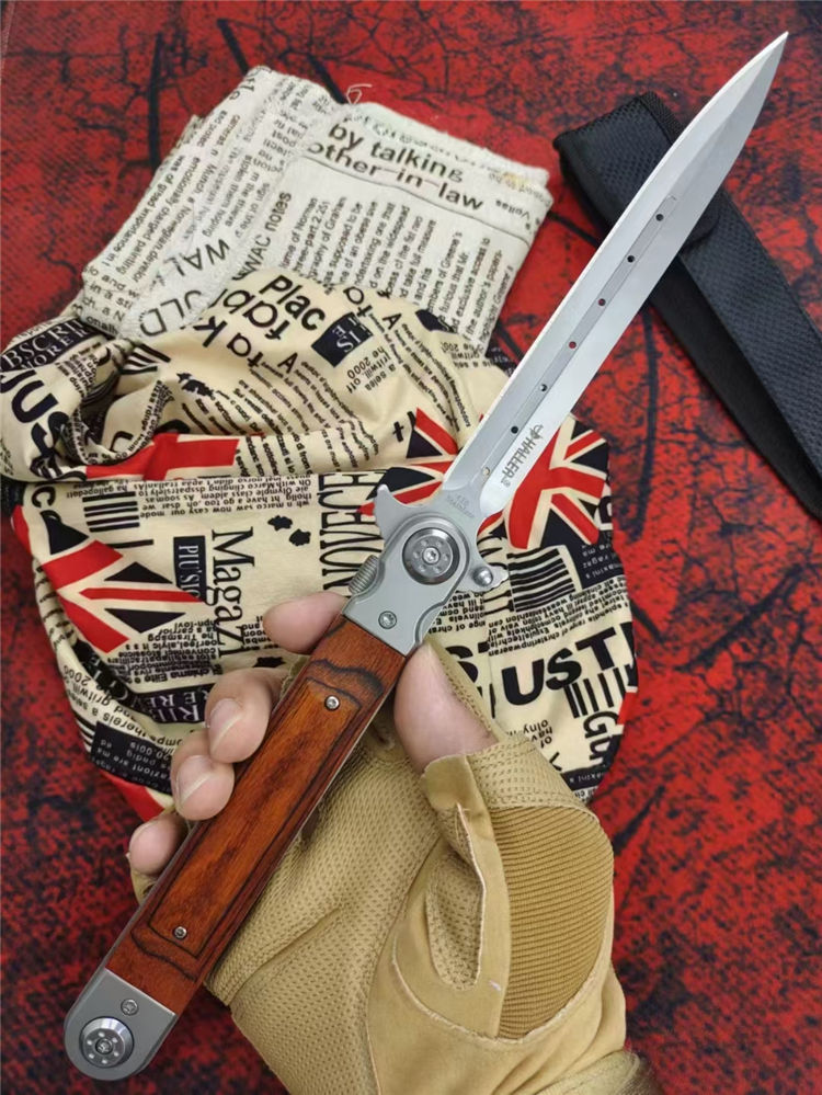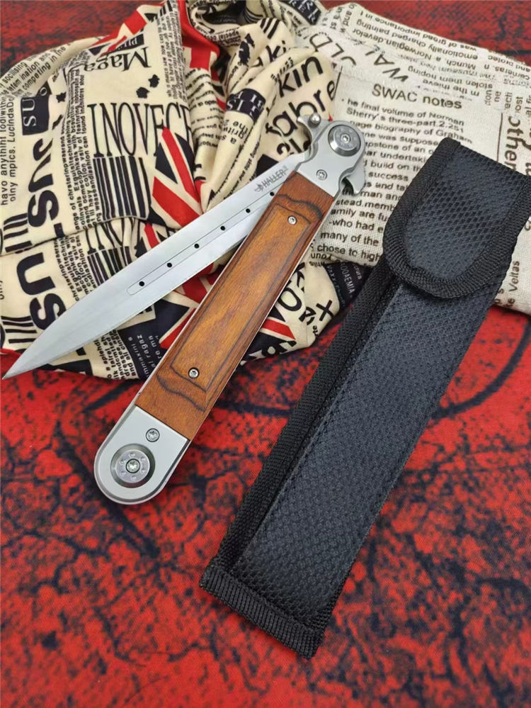 红缨折刀 全长:329MM 刃长:150MM 叠长:177CM 刃厚:3MM 刃材:420马氏体不锈钢 柄材:红木+钢头 硬度:58HRC 净重:约233克 其他:尼龙套