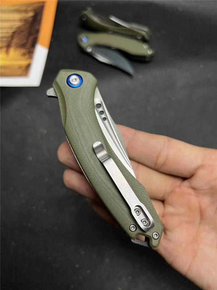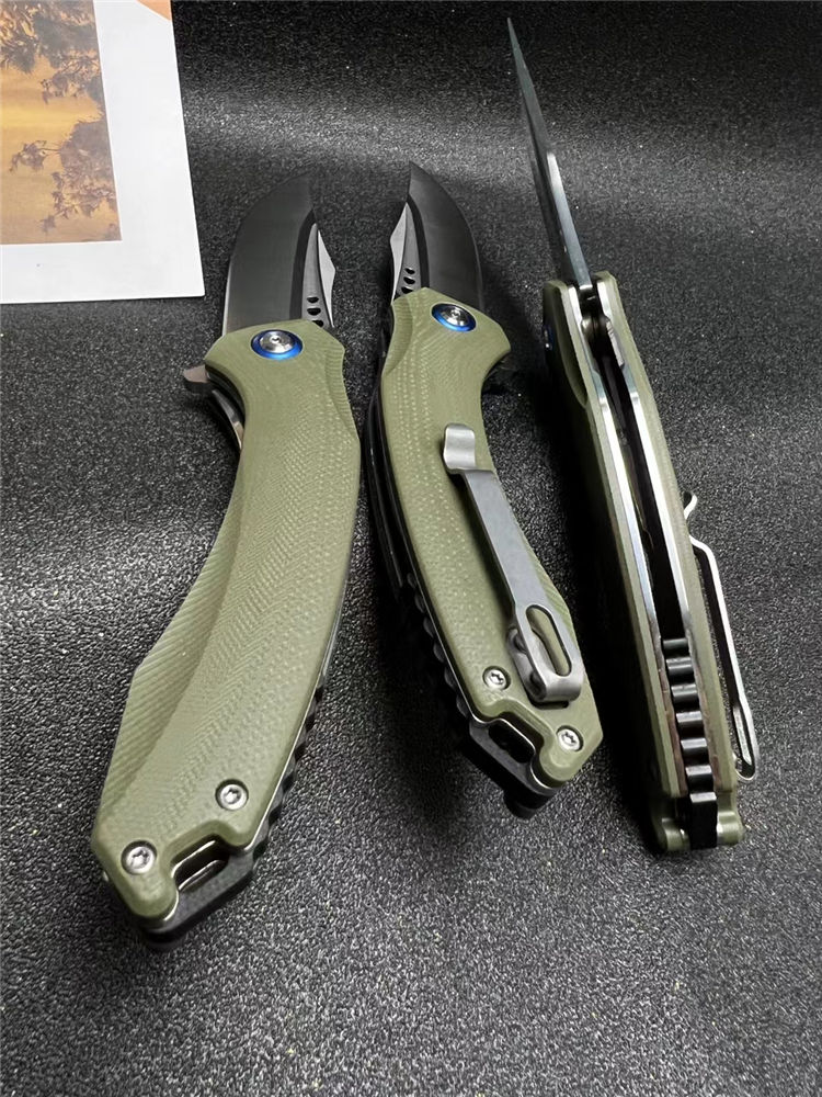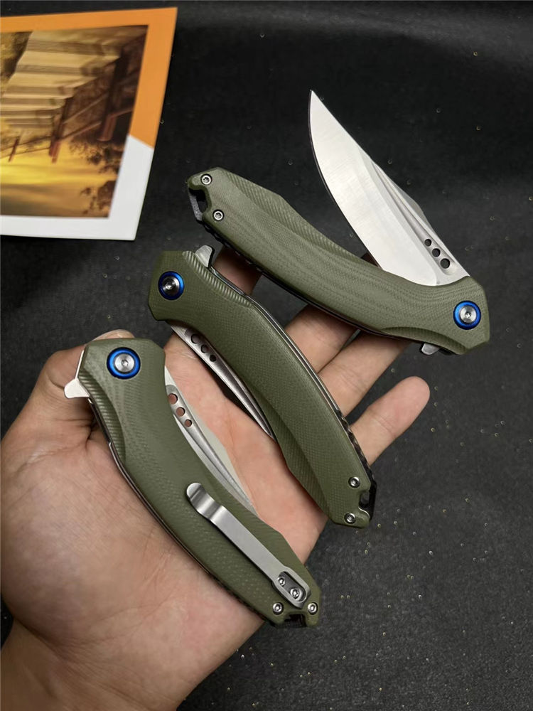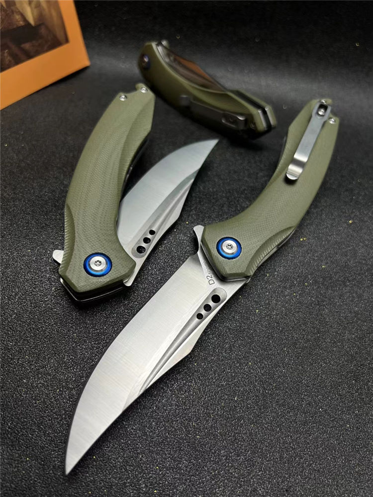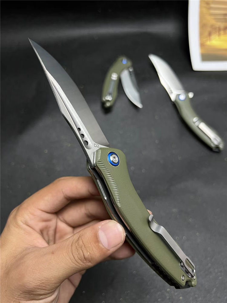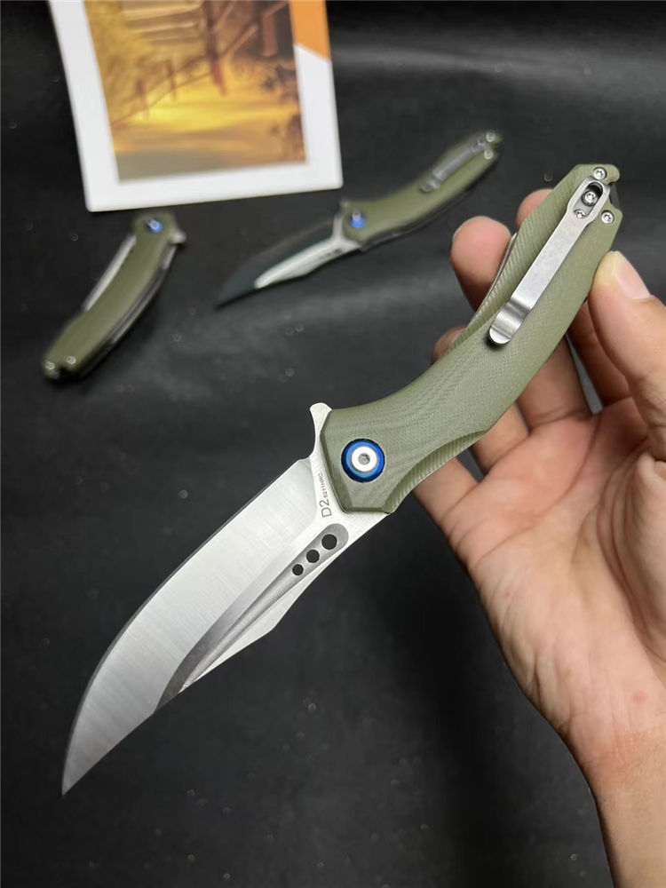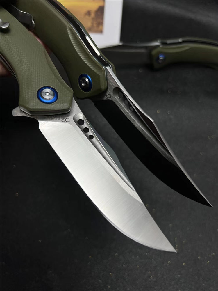 MinoGo快开折刀 全长:20cm 刃长:8.7cm 柄长:11.3cm 刃宽:2.5cm 刃厚:2.8mm 刃材:正品D2钢(刀刃数控磨工处理) 刀重:116g 硬度:60-61HRC 表面:石洗 柄材:G10+钢衬 刀夹:亚光钢夹 螺丝:所有螺丝420不锈钢材料 结构:线锁结构、钢珠定位珠、内置平面滚珠轴承垫片