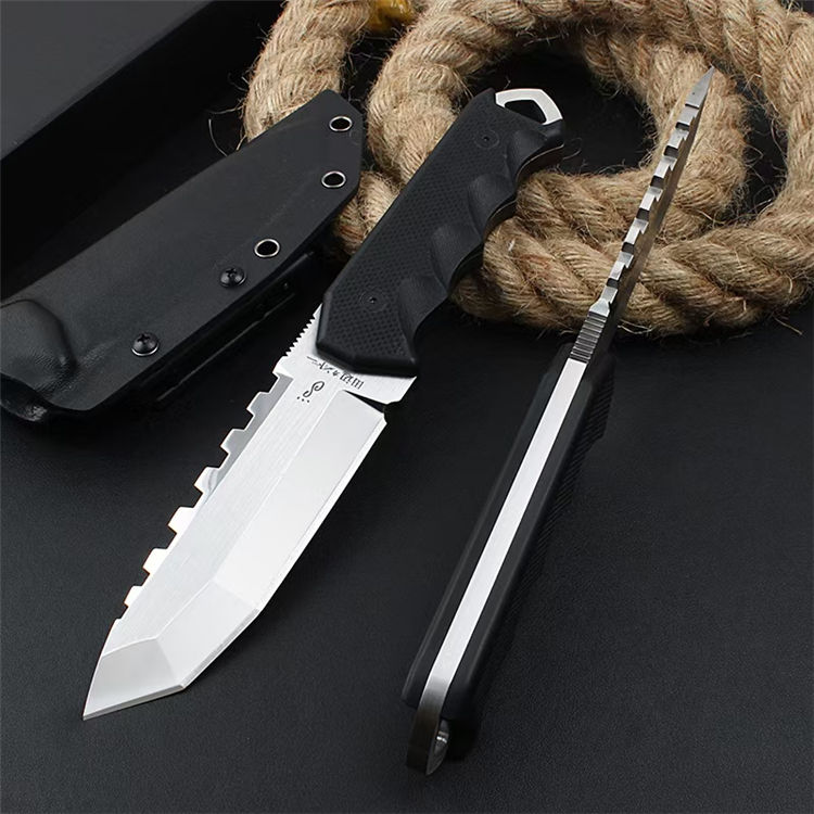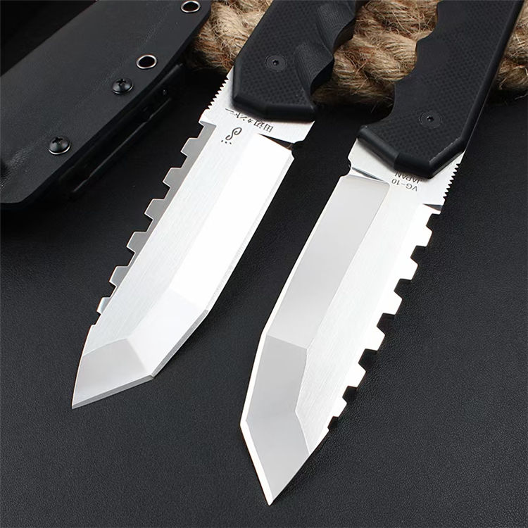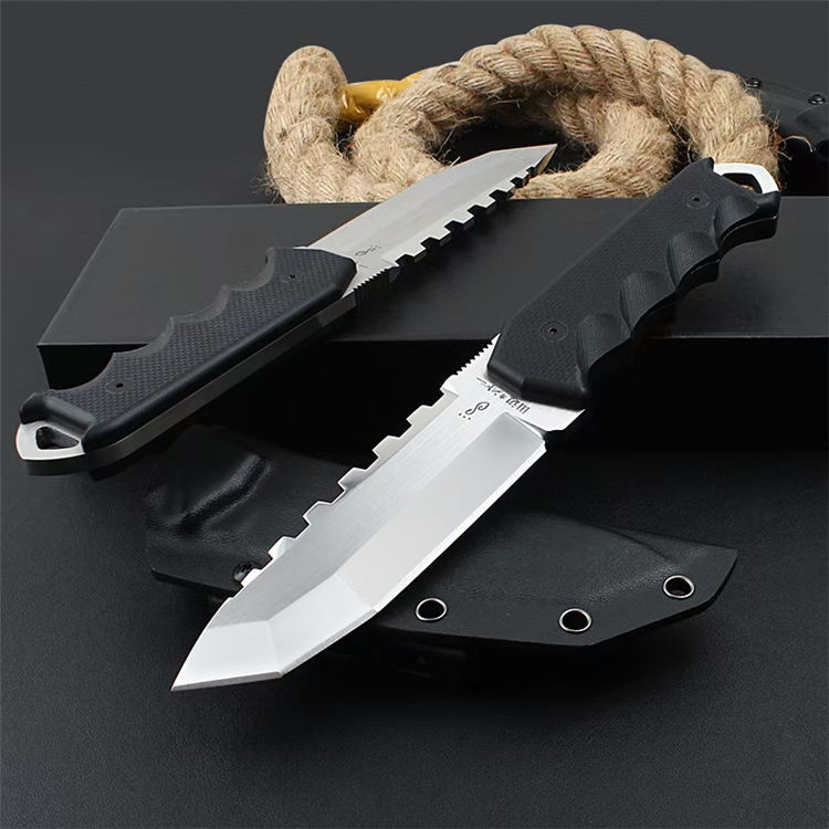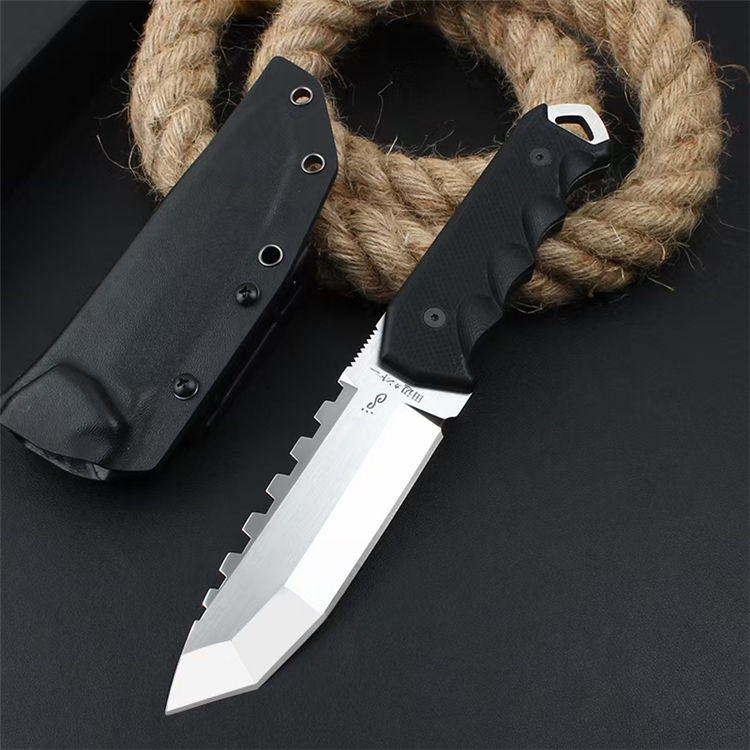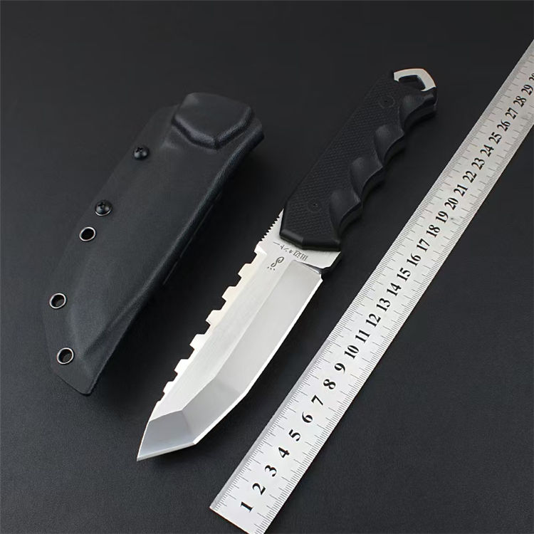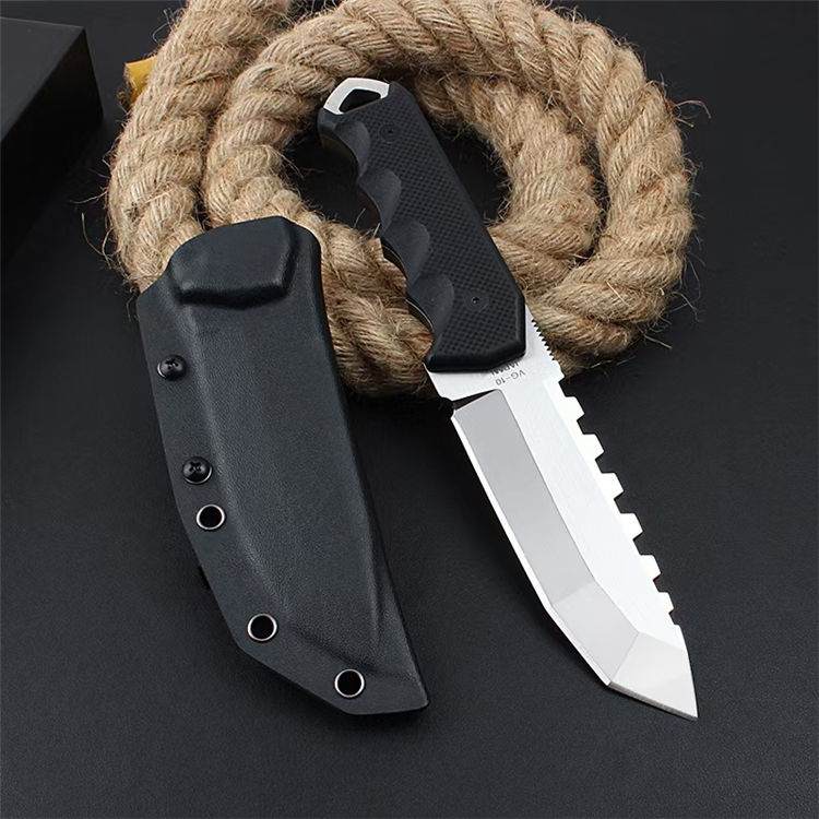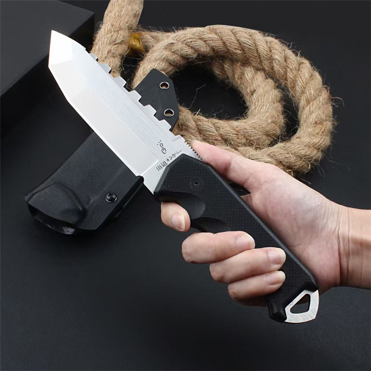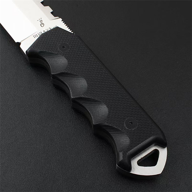 田边一筹硬汉直刀 全长:26.8CM 刀长:12.8CM 柄长:14CM 刃厚:加厚6MM 刃材:VG10钢材 柄材:G10刀片 表面:镜光+锻光 硬度:60-62HRC 净重:417克 包装:礼盒