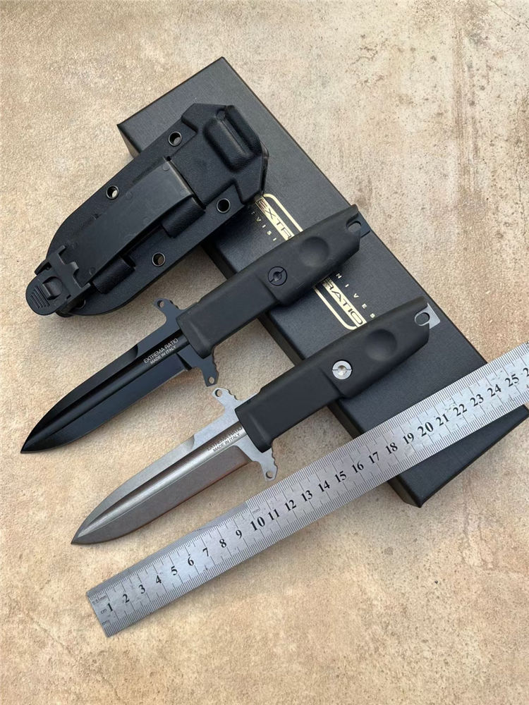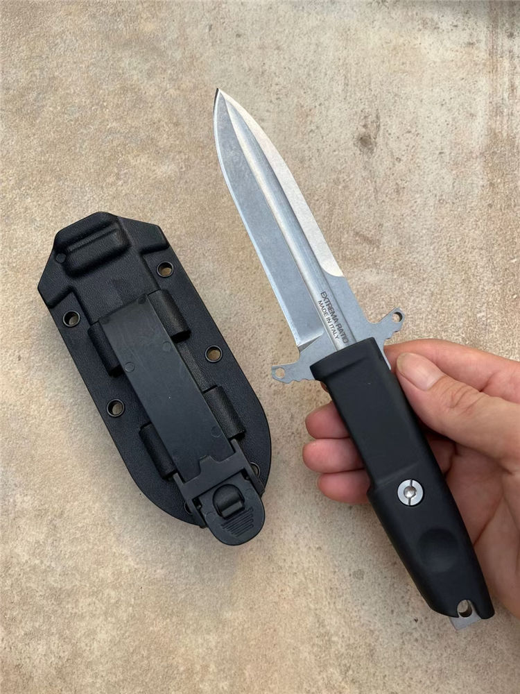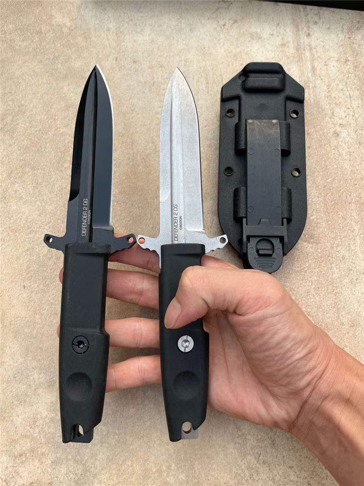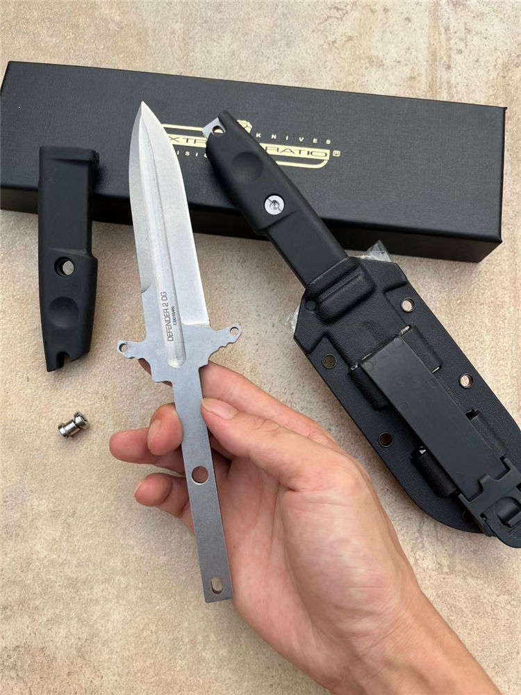 极端武力防御者直刀 全长:23.5cm 刃长:11.5cm 厚度:5cm 钢材:D2 全刀重量非常轻盈,握感非常舒适,在战术刀里,它也属于迷你型小尺寸,让你携带非常隐秘而轻便,刀鞘战术K鞘