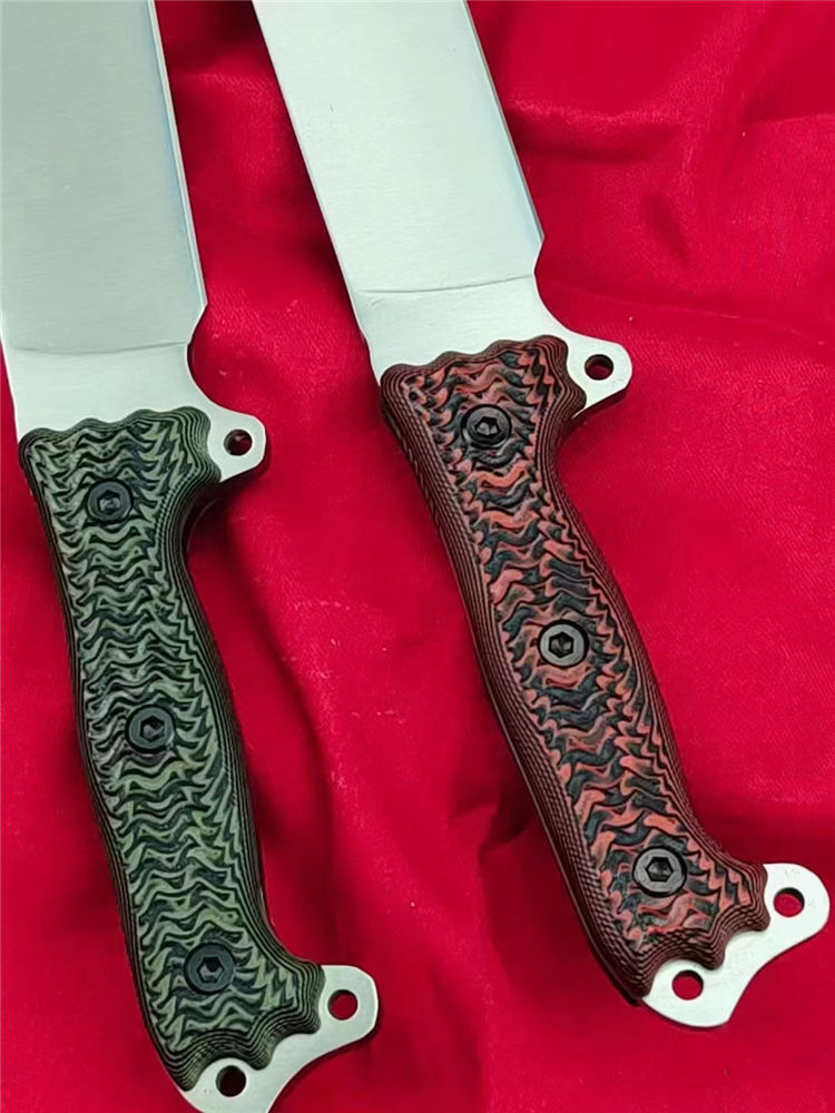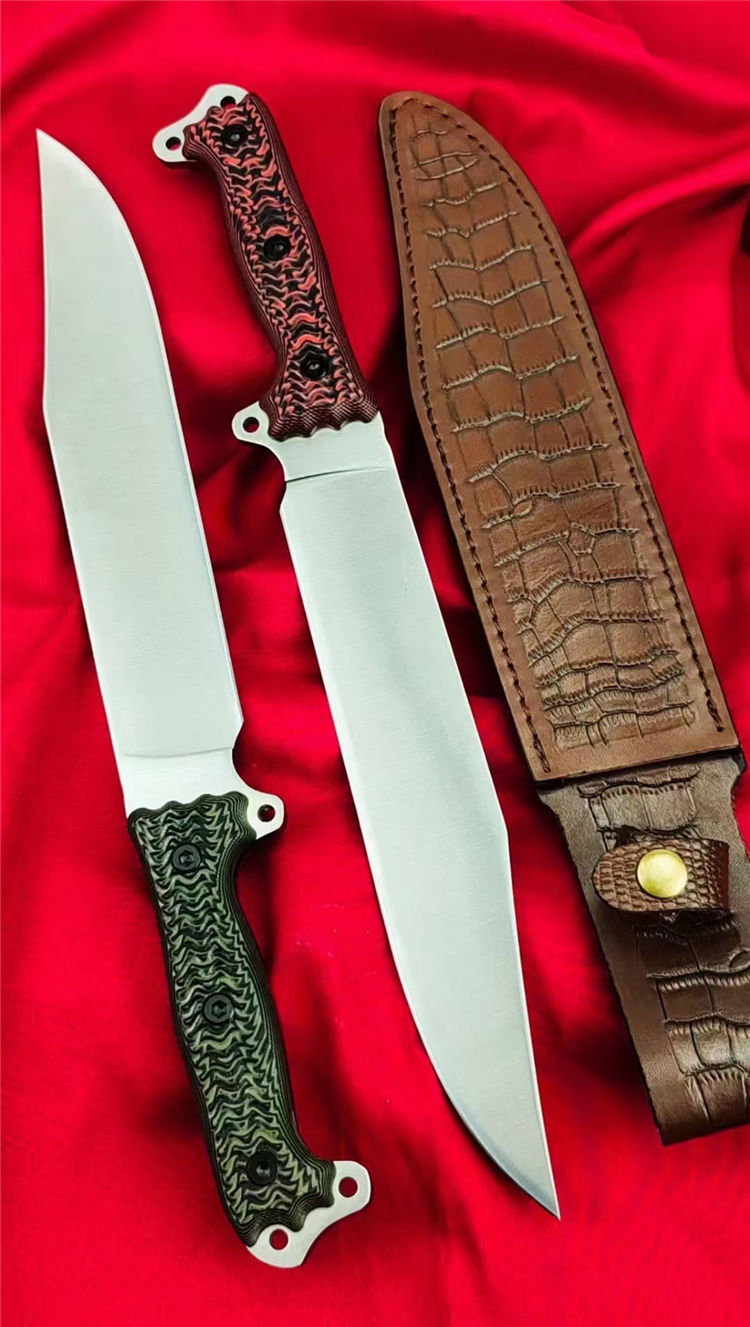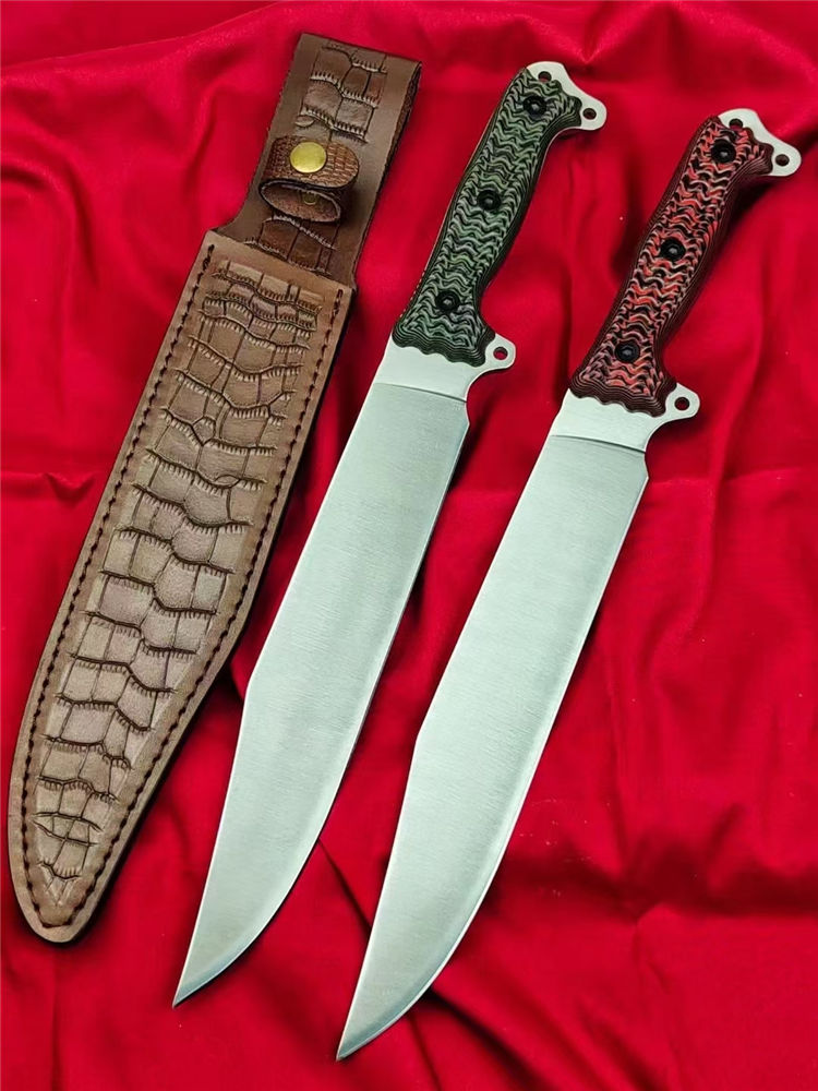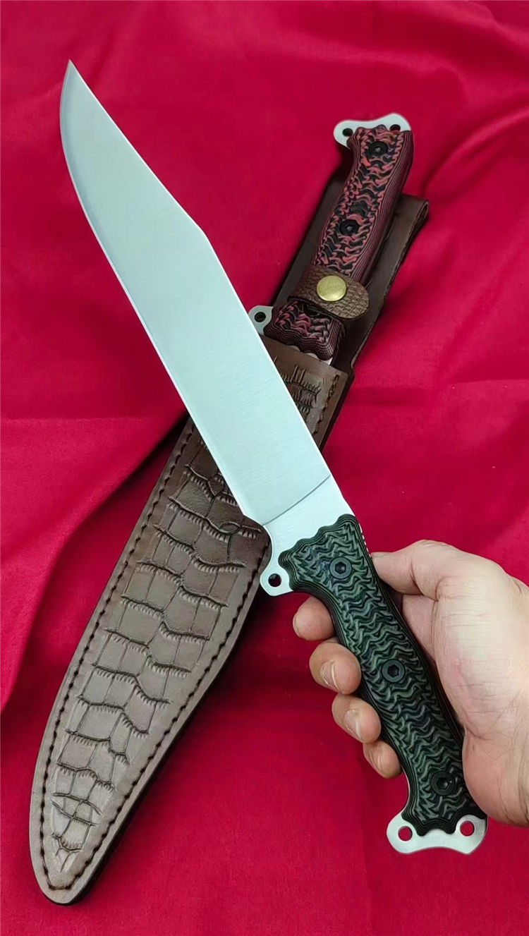 巴斯博弈直刀 品名:巴斯博弈 全长:415mm 刃长:250mm 柄长:145mm 刃宽:45mm 刃厚:5.8mm 刃材:N690合金钢深冷处理 刀重:553g 毛重:660g (含鞘) 硬度:59-61HRC 表面:手工砂光 柄材:米克塔人工体学防滑 结构:一体龙骨 配套:进口压花手工牛皮套