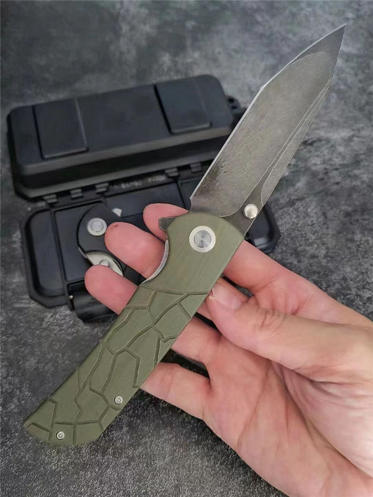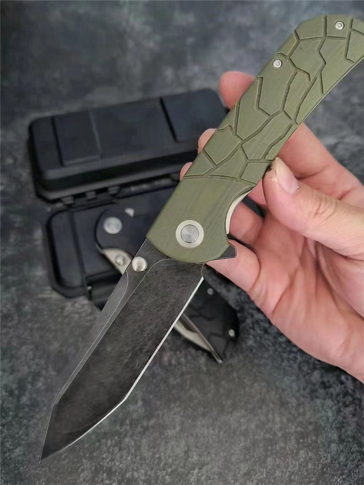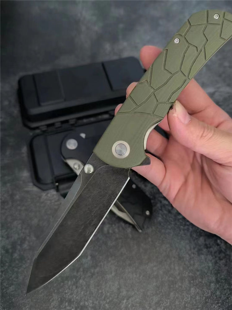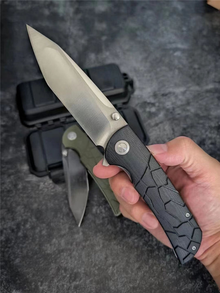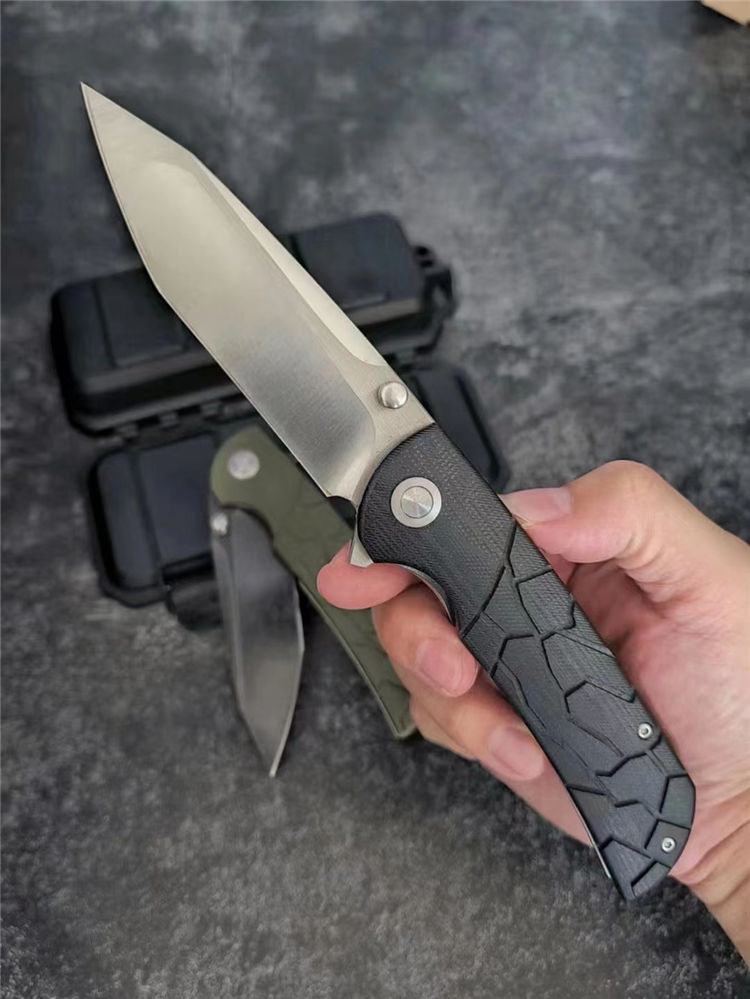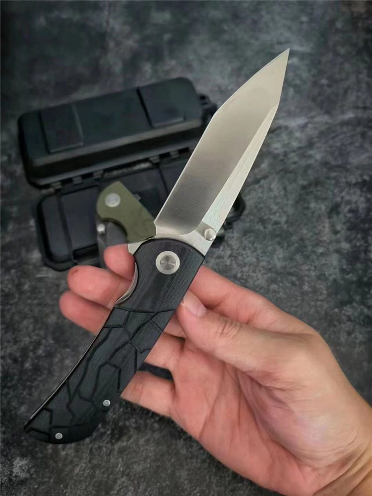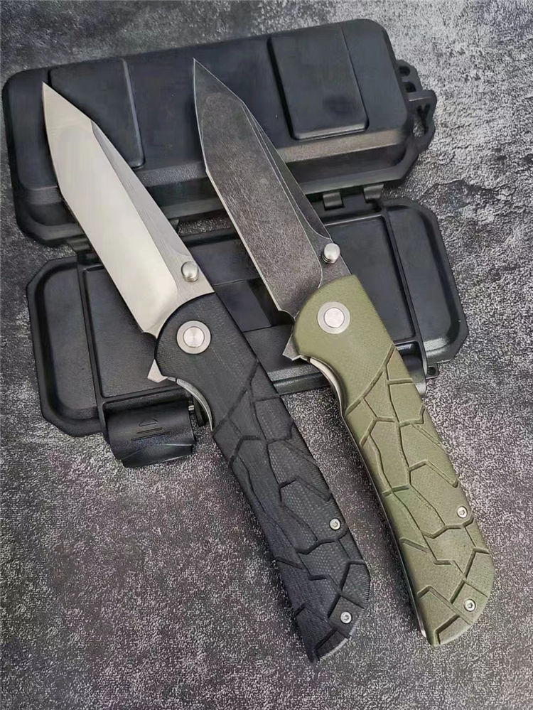 坦克TANK重折刀 全长:21.8m 刃长:9.5m 柄长:12.3cm 刃宽:2.8cm 刃厚:0.41mm 刃材:9CR18MOV钢材 刀重:183G 硬度:59HRC 表面:拉丝处理 柄材:G10甲骨文 刀夹:亚光背夹 螺丝:所有螺丝420不锈钢硬度HRC45,全CNC精雕加工 结构:钢珠定位珠、内置平面轴承垫片 其他:黑色盒装,全CNC工艺