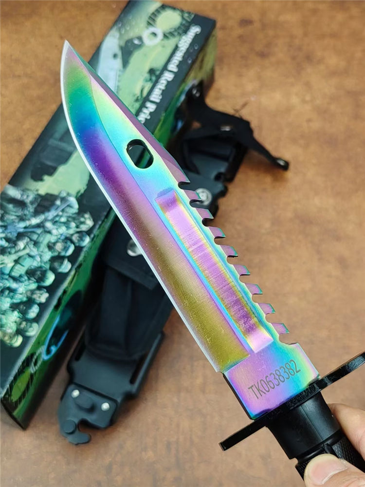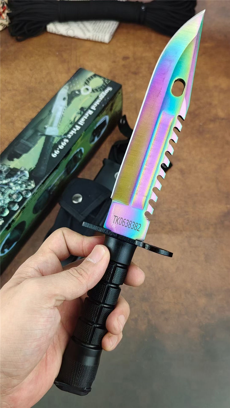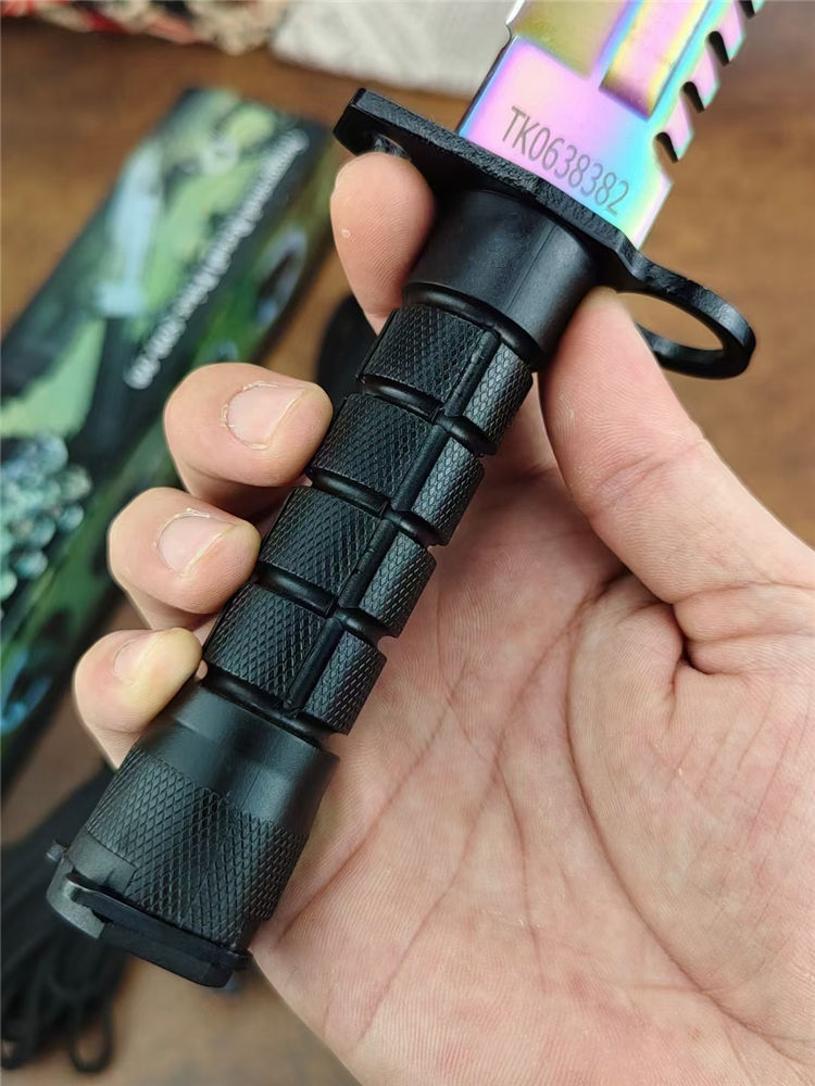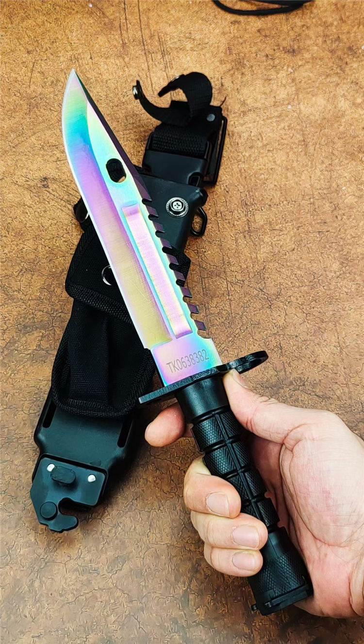 彩钛版D80纪念刀 全长:325mm 刃长:175mm 柄长:128mm 刃宽:40mm 刃厚:5.8mm 刃材:7Cr14Mov高碳军用特种钢 刀重:306g/590含鞘 硬度:58HRC 表面:彩钛 柄材:高级工程ABS+铸件 结构:一体龙骨 包装:D80K鞘带磨刀石