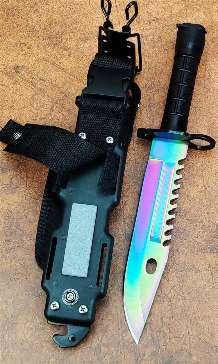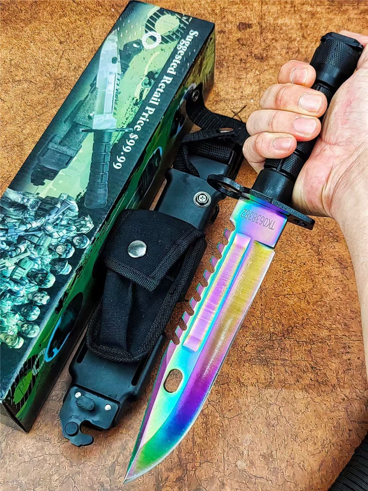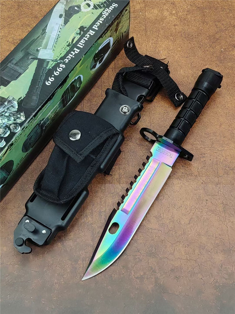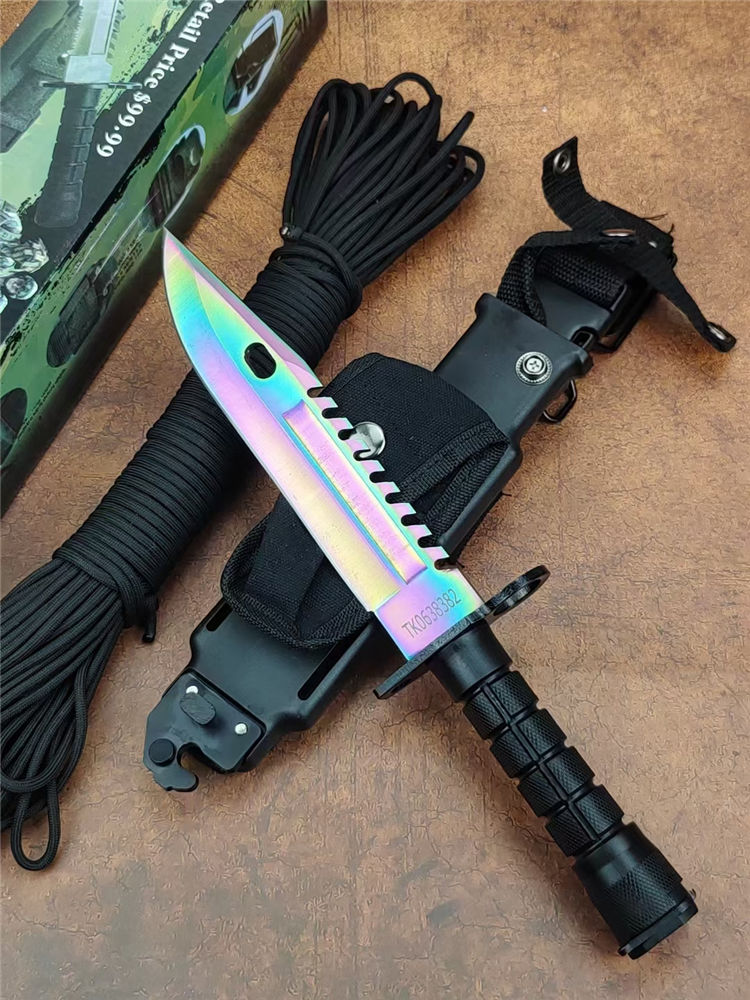 彩钛版D80纪念刀 全长:325mm 刃长:175mm 柄长:128mm 刃宽:40mm 刃厚:5.8mm 刃材:7Cr14Mov高碳军用特种钢 刀重:306g/590含鞘 硬度:58HRC 表面:彩钛 柄材:高级工程ABS+铸件 结构:一体龙骨 包装:D80K鞘带磨刀石