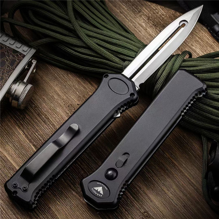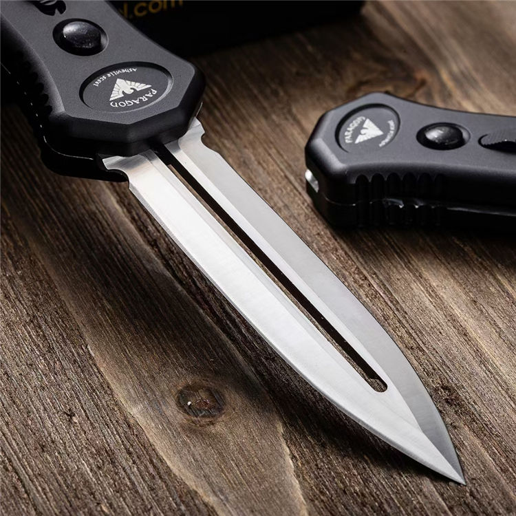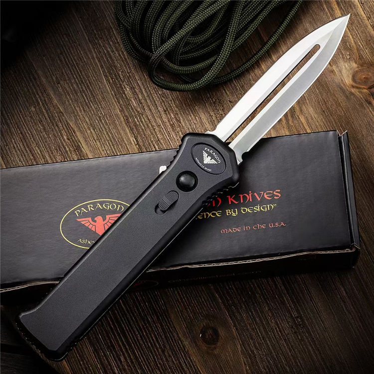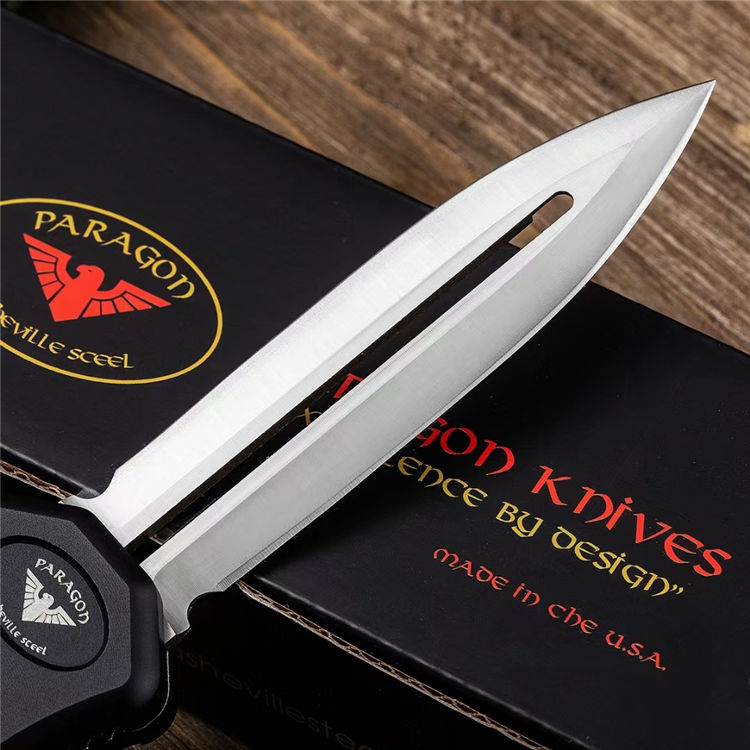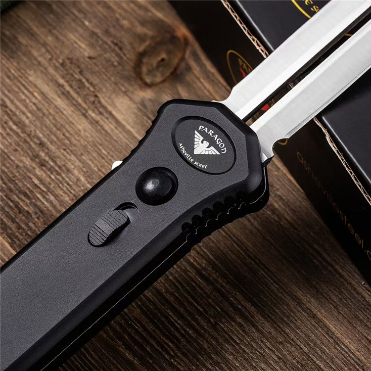 PARAGON凤凰直出跳刀 全长:223MM 刃长:90MM 厚度:3MM 刃材:高速D2钢 硬度:60-62HRC 重量:125g 表面:刀片精细数控磨面钢本色+拉丝+手柄氧化涂层处理 柄材:T6航空铝合金柄 工艺:本产品手柄采用精密数控CNC加工,刀片采用数控水磨二次精磨而成 备注:本产品为直出跳刀,解开保险锁按下开关自动弹出刀片,收回时按定开关拉下刀片收刀。产品自带保险锁安全装置