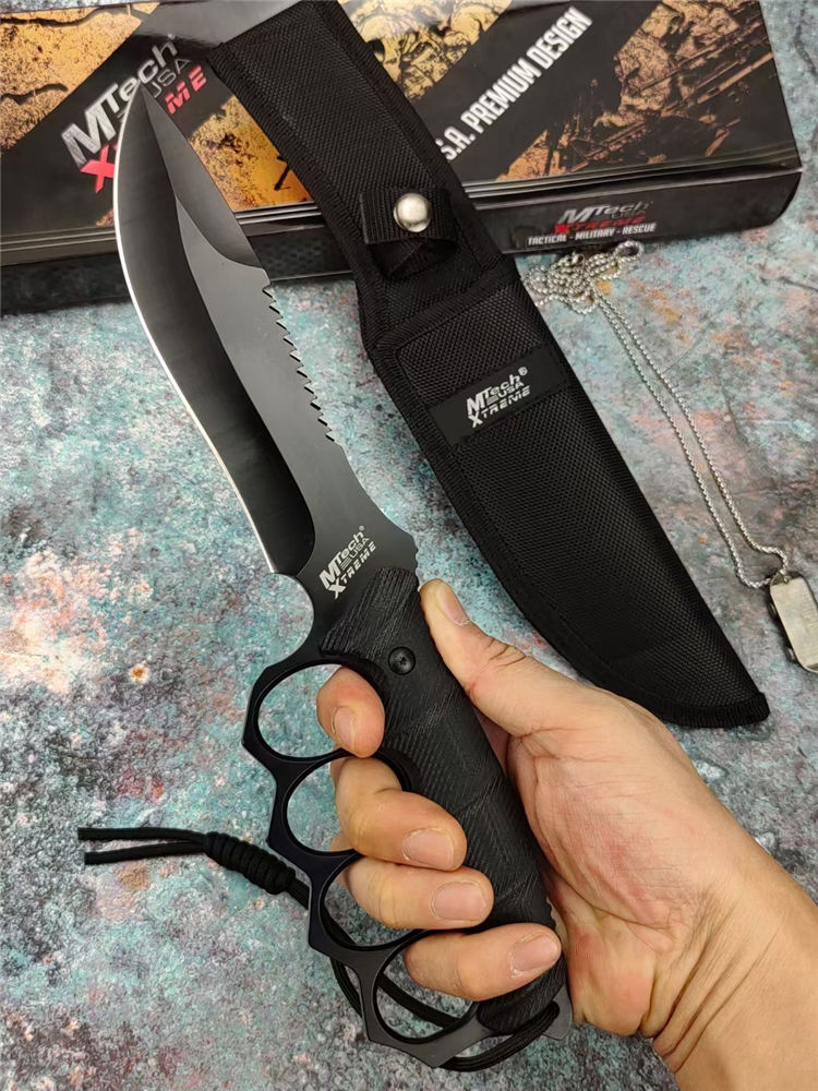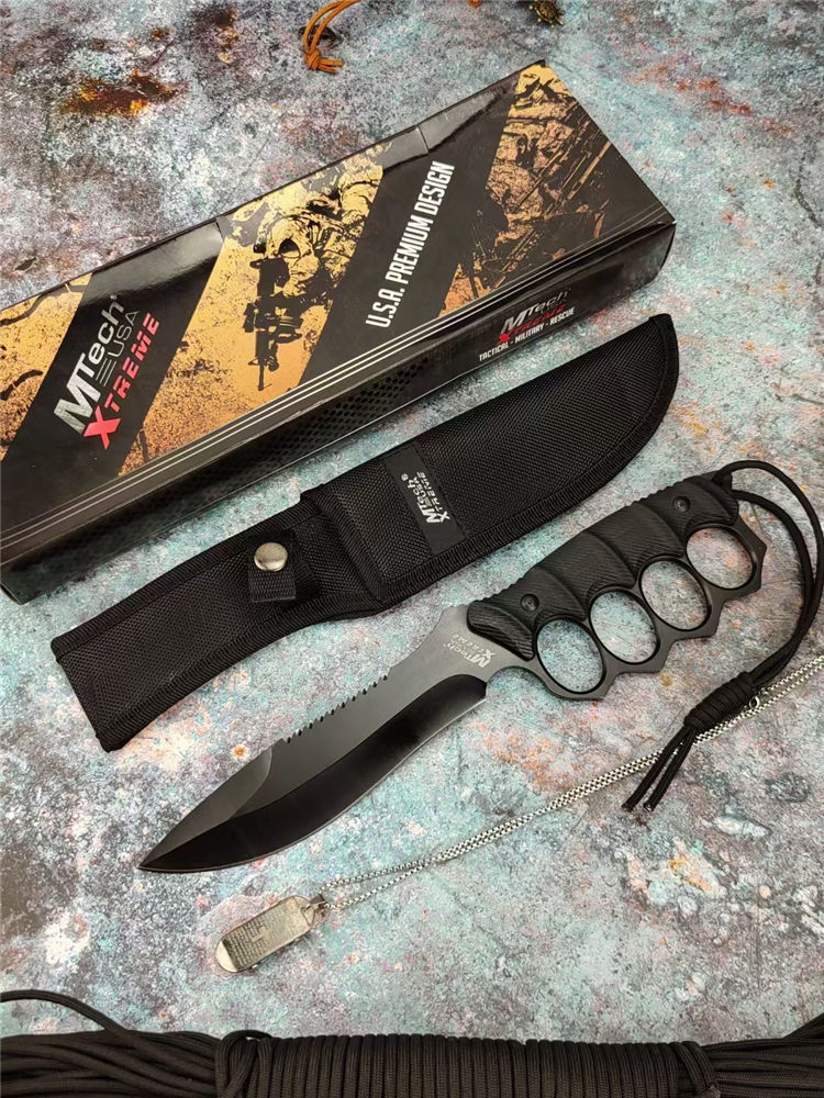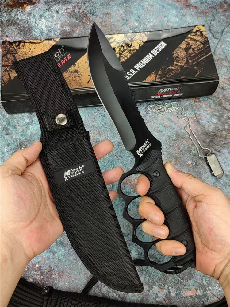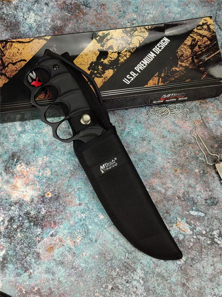 MT高压线手环直刀 全长:315mm 刃长:165mm 柄长:145mm 刃宽:40mm 刃厚:4.8mm 刃材:440c钢 刀重:476g含套 毛重:600g含套含包装 硬度:58HRC 表面:黑钛 柄材:一体钢+G10 结构:一体龙骨 包装:尼龙刀套