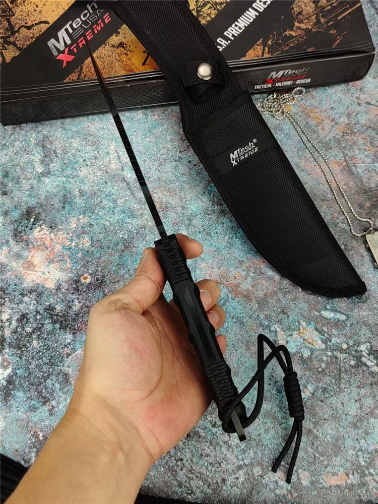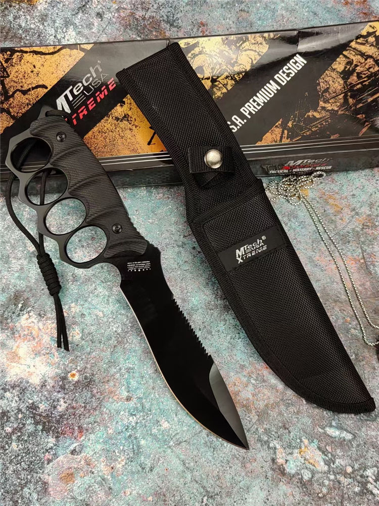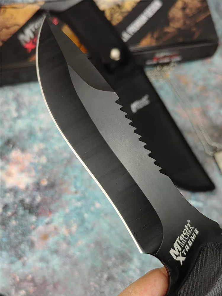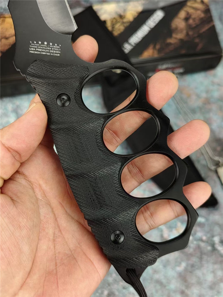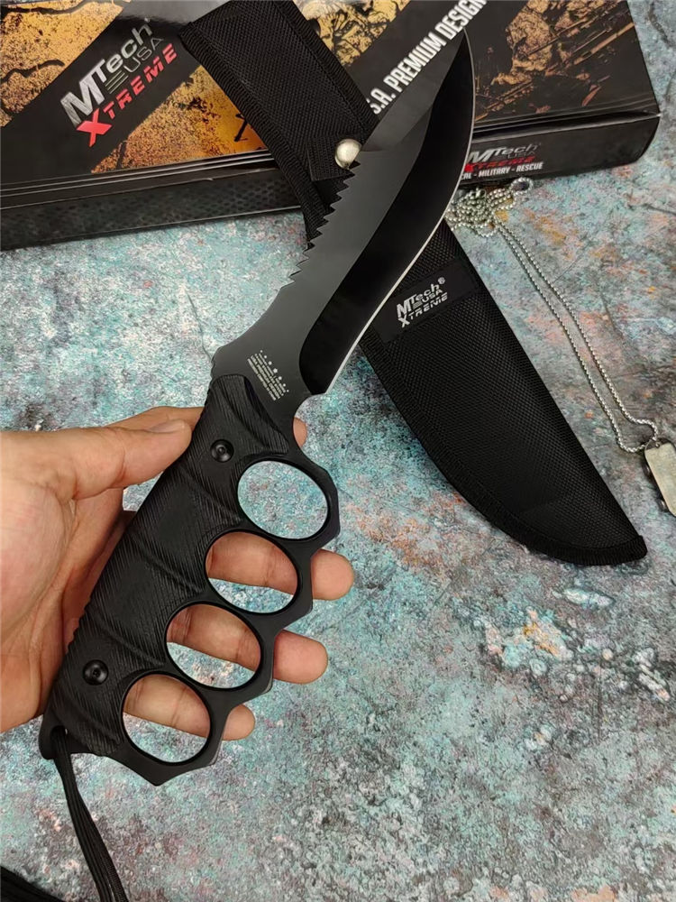 MT高压线手环直刀 全长:315mm 刃长:165mm 柄长:145mm 刃宽:40mm 刃厚:4.8mm 刃材:440c钢 刀重:476g含套 毛重:600g含套含包装 硬度:58HRC 表面:黑钛 柄材:一体钢+G10 结构:一体龙骨 包装:尼龙刀套