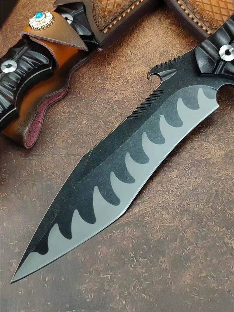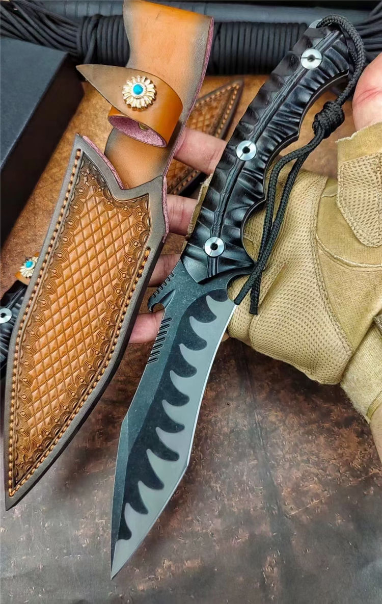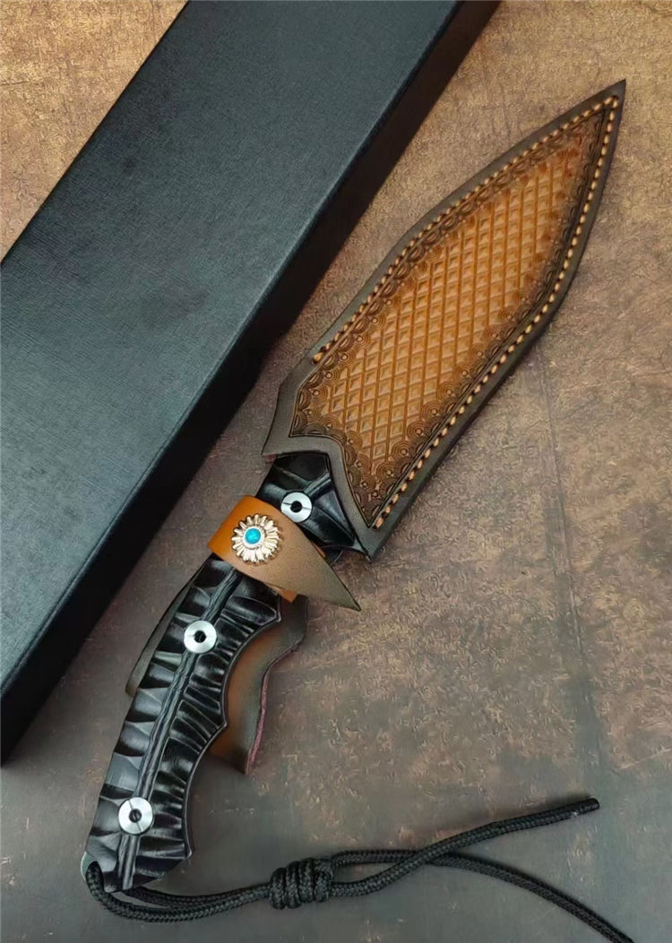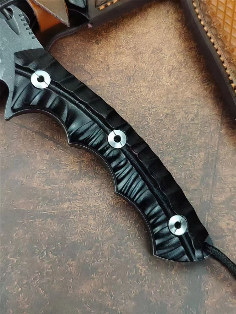DC53魔爪直刀 全长:310mm 刃长:160mm 柄长:150mm 刃宽:40mm最宽处 刃厚:4.5mm 刃材:DC53真空油淬热处理 刀重:305g 净重:377g含刀鞘 毛量:505g(含K鞘包装盒) 硬度:60+HRC 表面:腐蚀+喷砂+发黑(虎纹色) 柄材:黑檀木精雕CNC 结构:一体龙骨 配套:尼龙玻纤K鞘 包装:礼盒