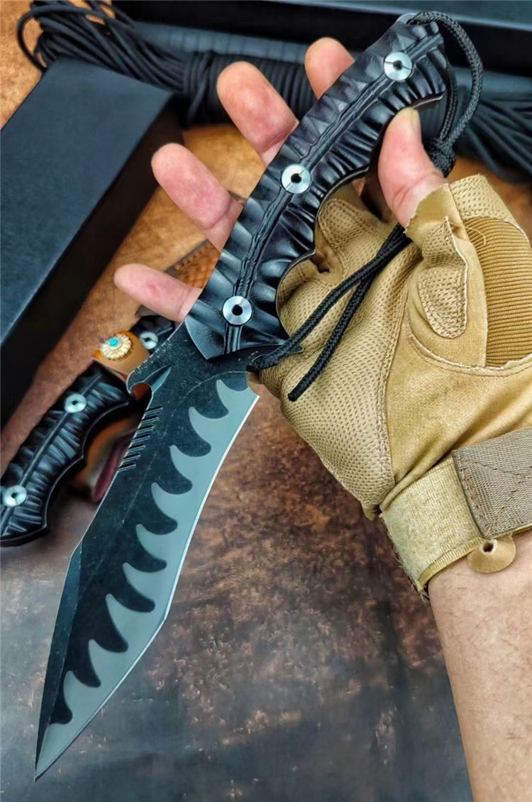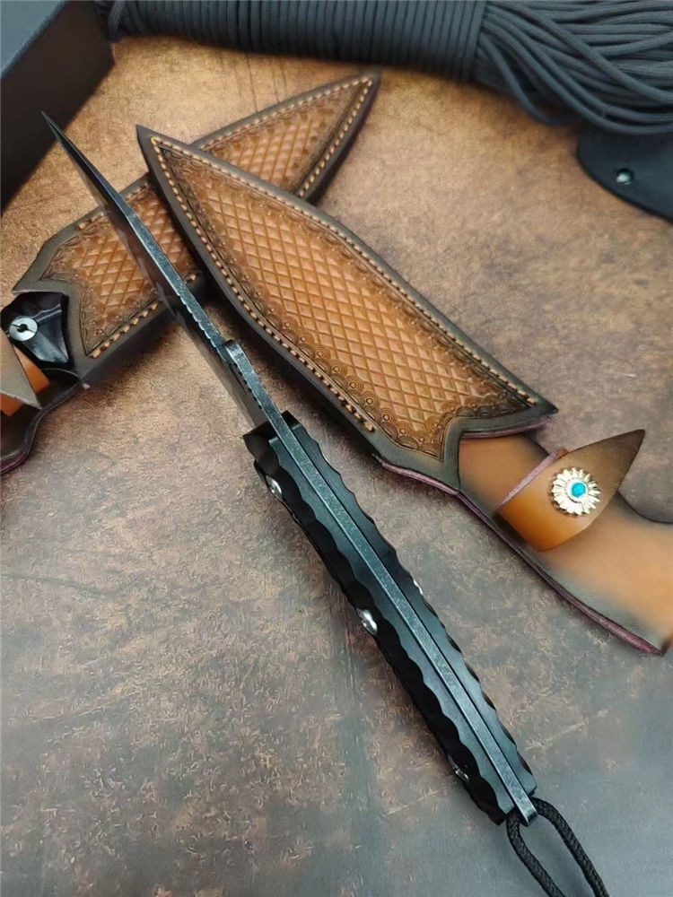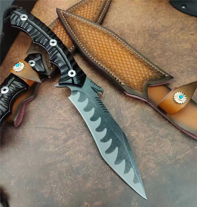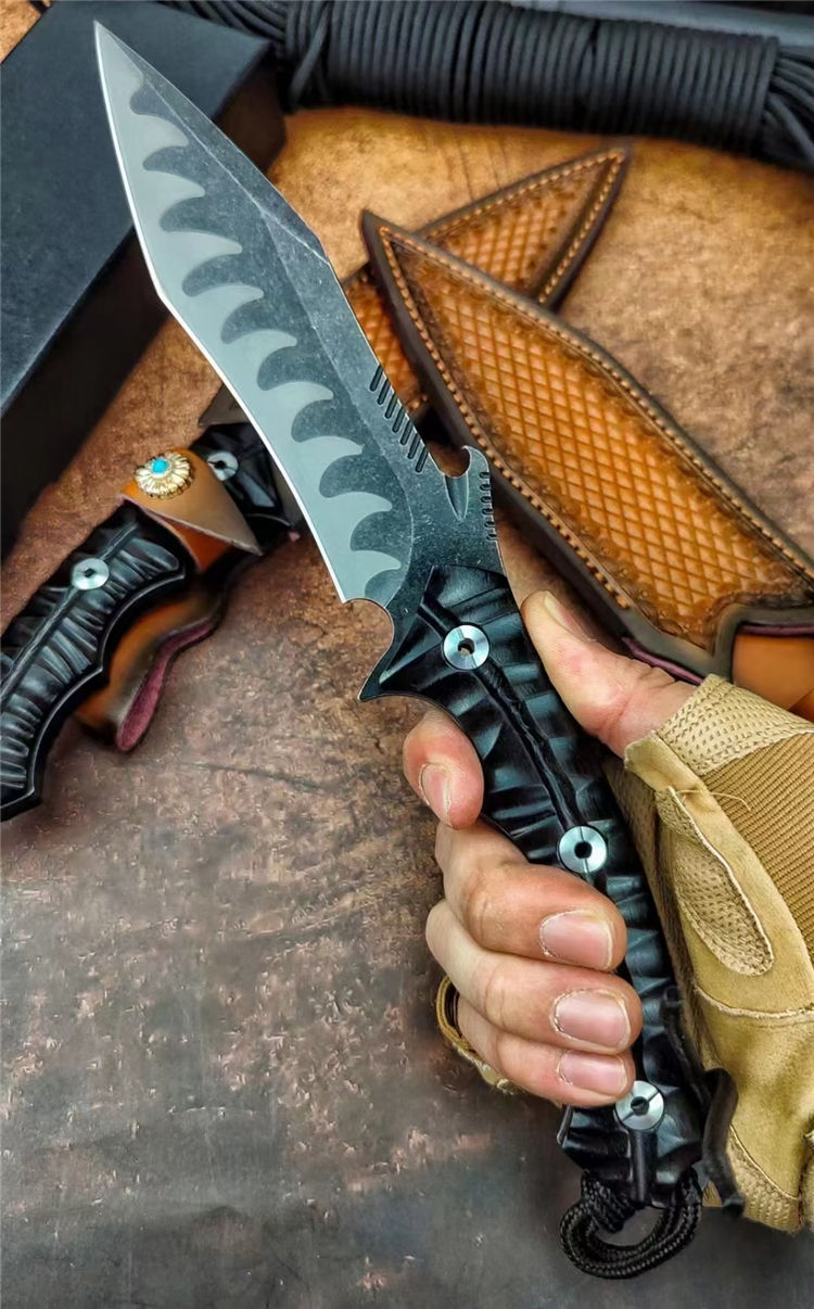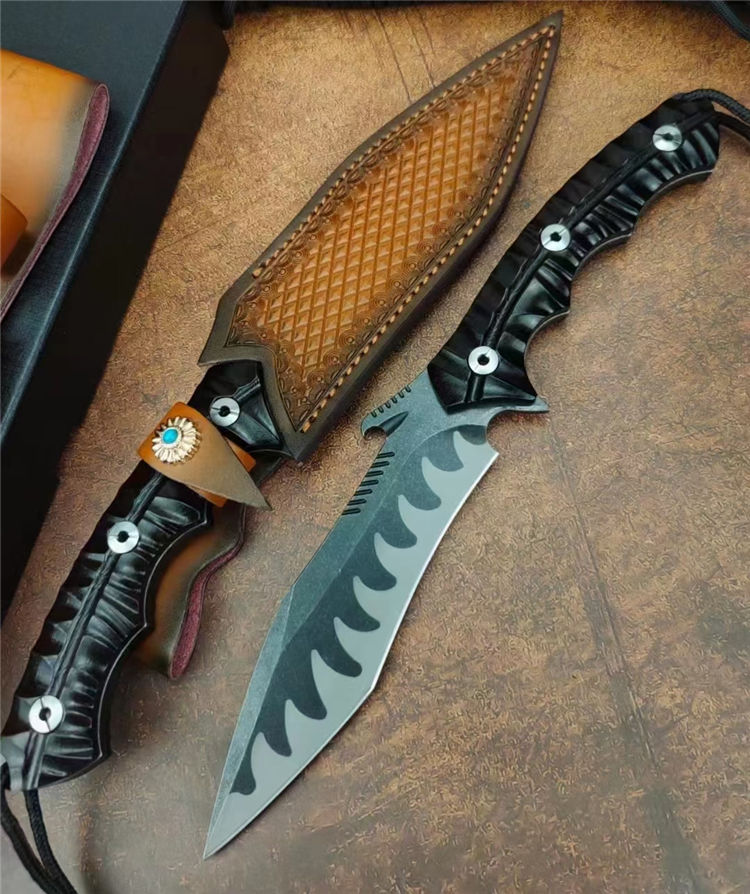 DC53魔爪直刀 全长:310mm 刃长:160mm 柄长:150mm 刃宽:40mm最宽处 刃厚:4.5mm 刃材:DC53真空油淬热处理 刀重:305g 净重:377g含刀鞘 毛量:505g(含K鞘包装盒) 硬度:60+HRC 表面:腐蚀+喷砂+发黑(虎纹色) 柄材:黑檀木精雕CNC 结构:一体龙骨 配套:尼龙玻纤K鞘 包装:礼盒