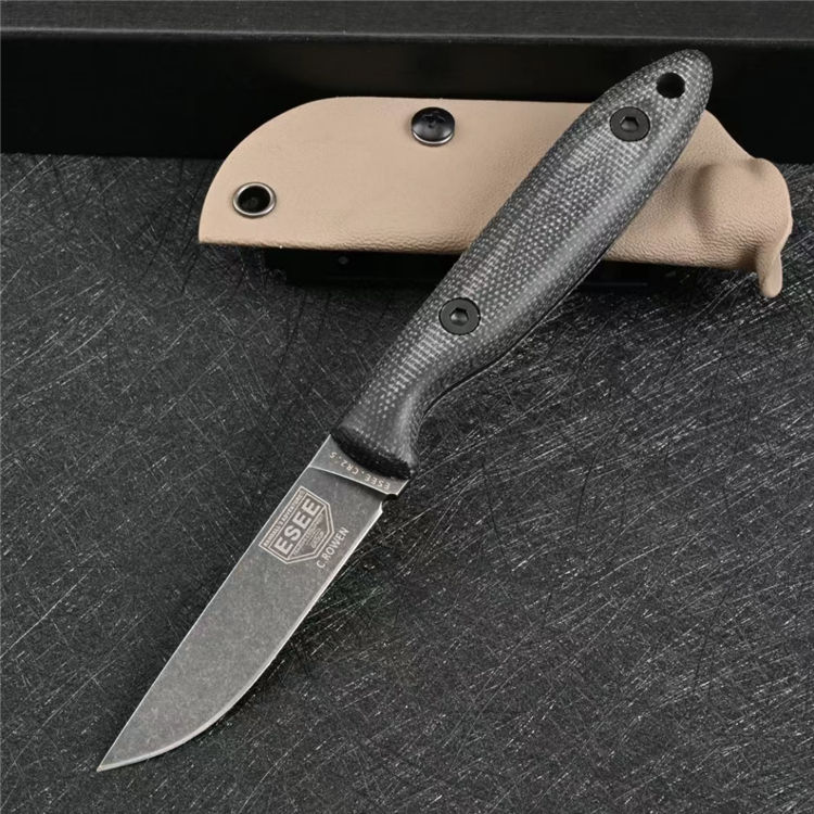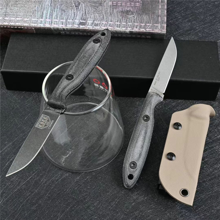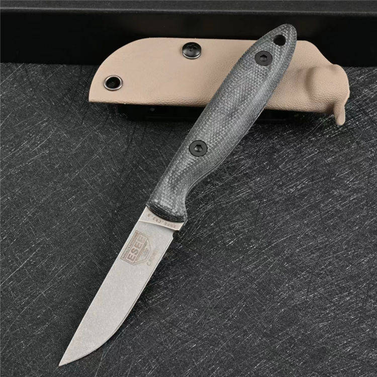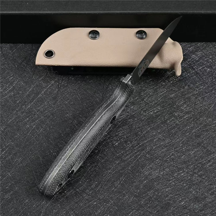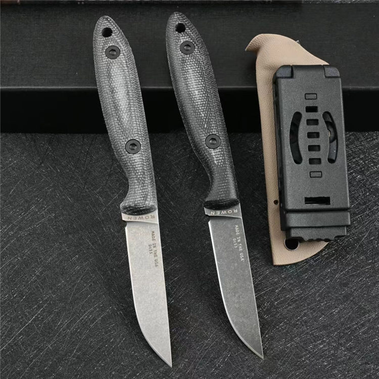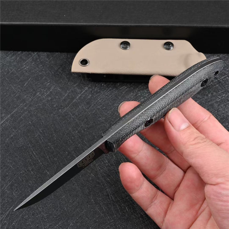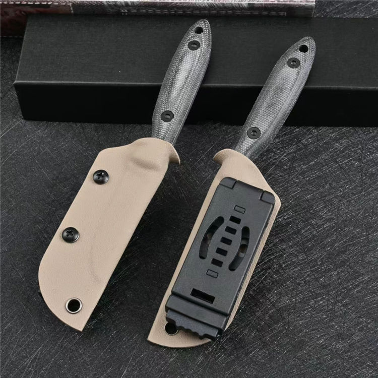 DC53钢亚麻柄直刀 全长:18.1cm 刃长:6.8cm 柄长:10.7cm 刃厚:0.33cm 刃宽:1.6cm 刀重:82g(单刀) 毛重:200g 钢材:DC53钢 柄材:亚麻 硬度:56-57HRC 表面:石洗/黑色石洗 包装:礼盒 刀鞘:Kydex鞘