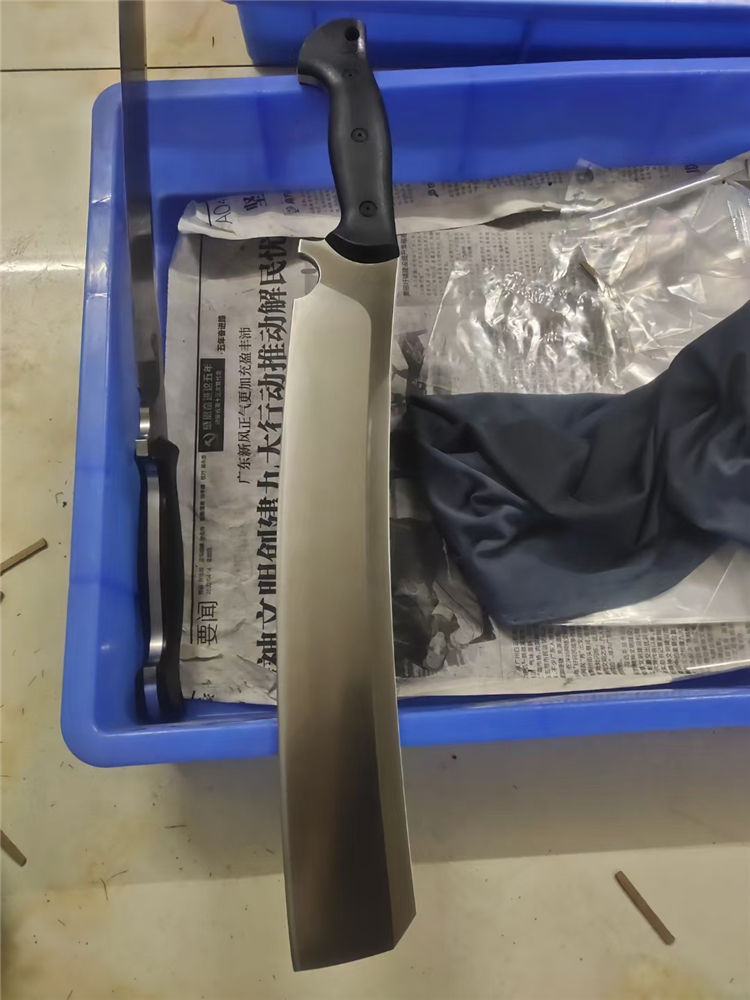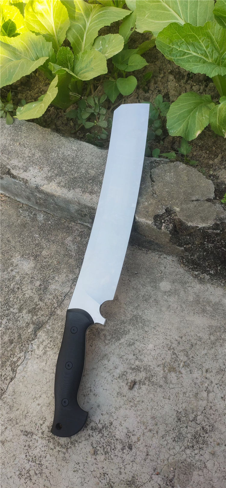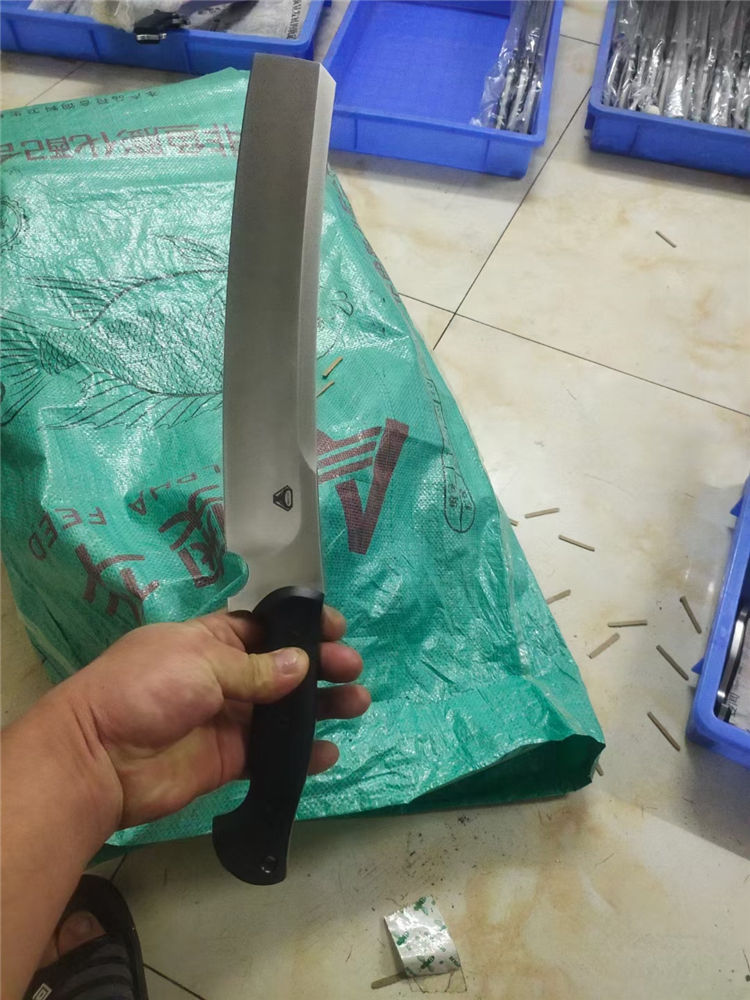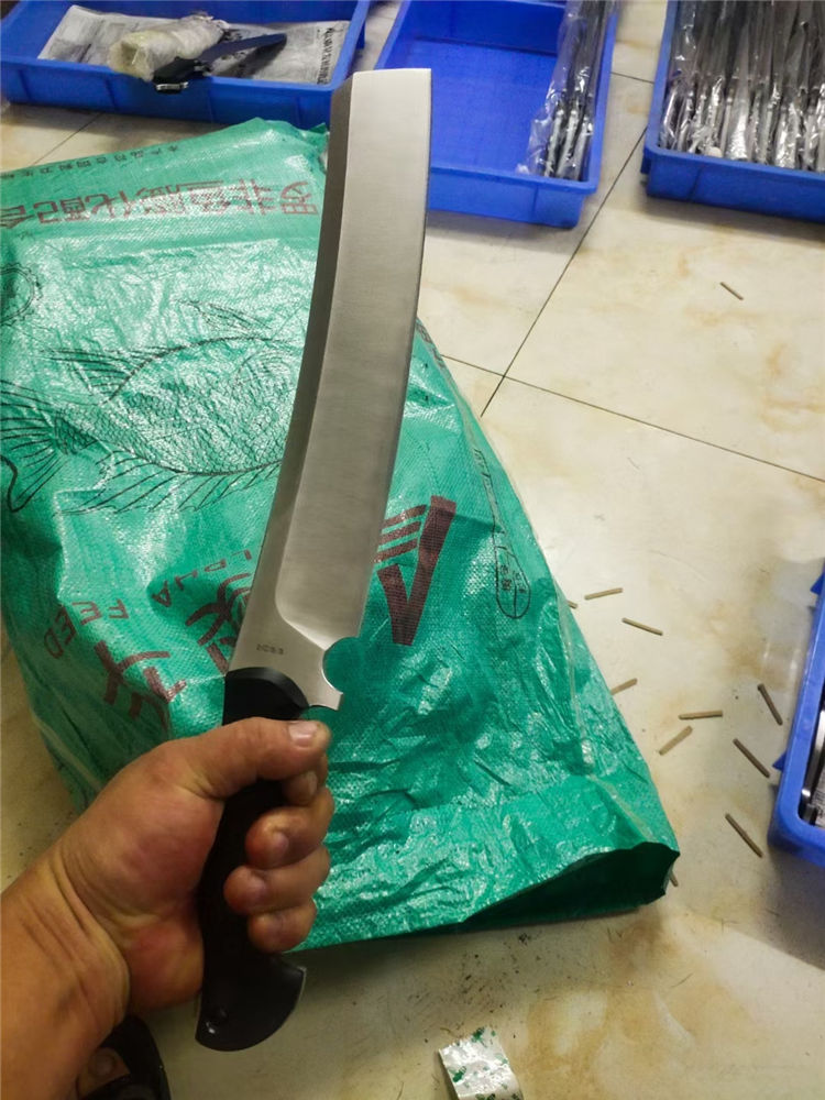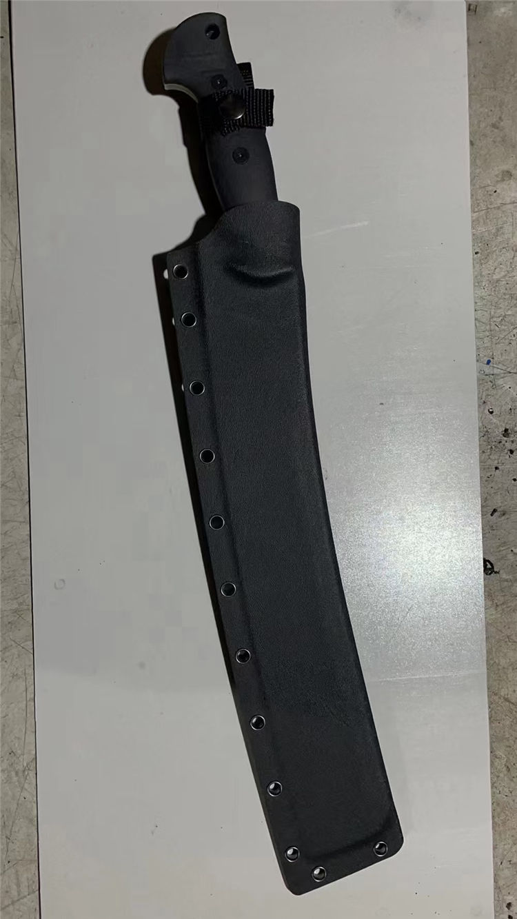 野牛蜜獾排障刀 全长:480mm 刃宽:54mm 柄长:130mm 刃长:350mm 厚度:6.0mm 刃材:DC53 热处理:真空油淬深冷热处理 硬度:60HRC 表面:钢本色精细砂光 手柄:黑G10 刀体:CNC精密加工+数控V磨 刀鞘:2.0美产K鞘
