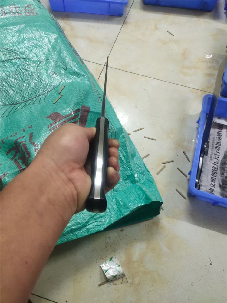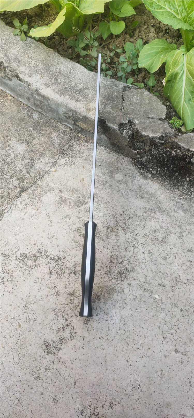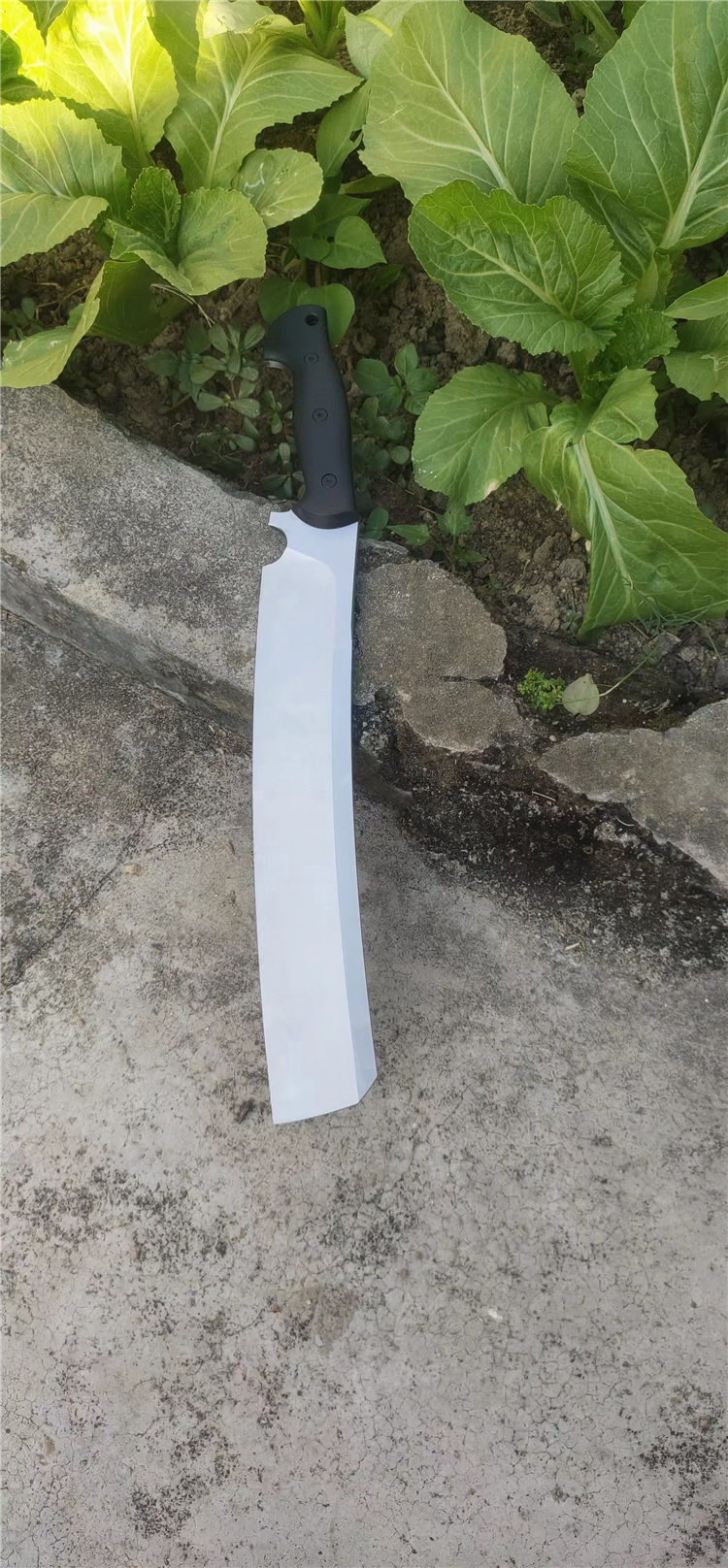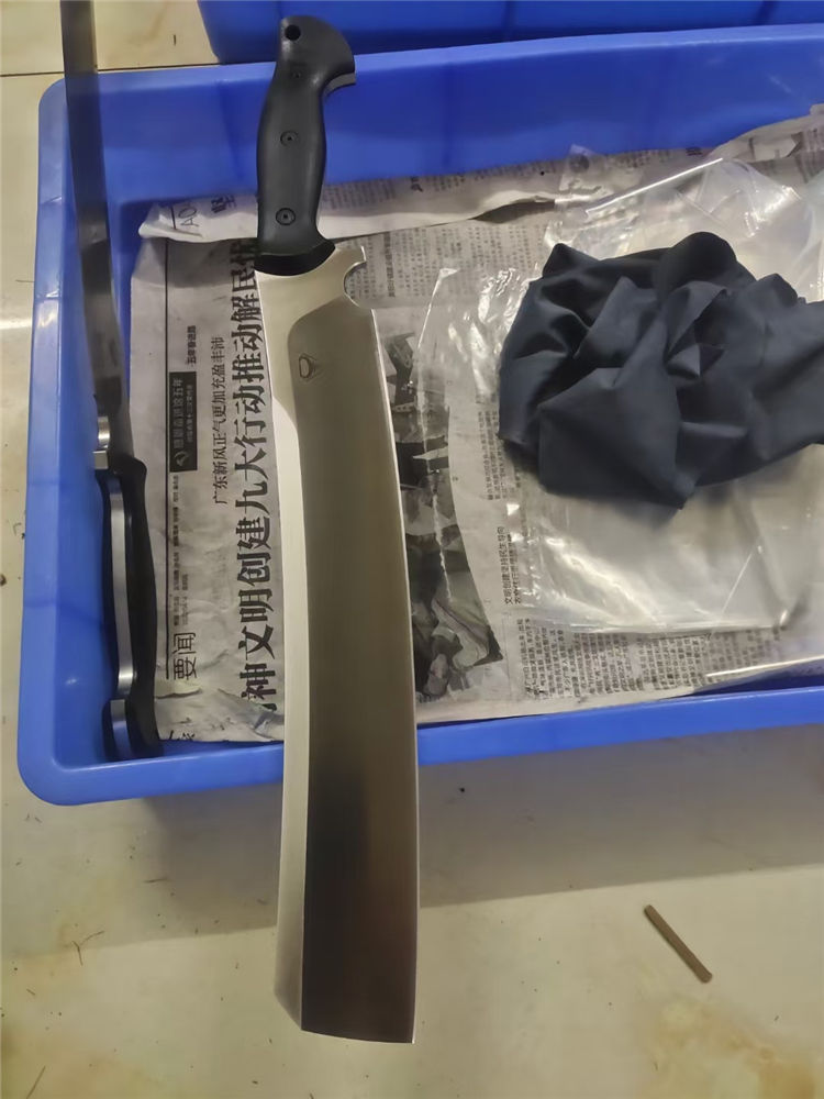 野牛蜜獾排障刀 全长:480mm 刃宽:54mm 柄长:130mm 刃长:350mm 厚度:6.0mm 刃材:DC53 热处理:真空油淬深冷热处理 硬度:60HRC 表面:钢本色精细砂光 手柄:黑G10 刀体:CNC精密加工+数控V磨 刀鞘:2.0美产K鞘