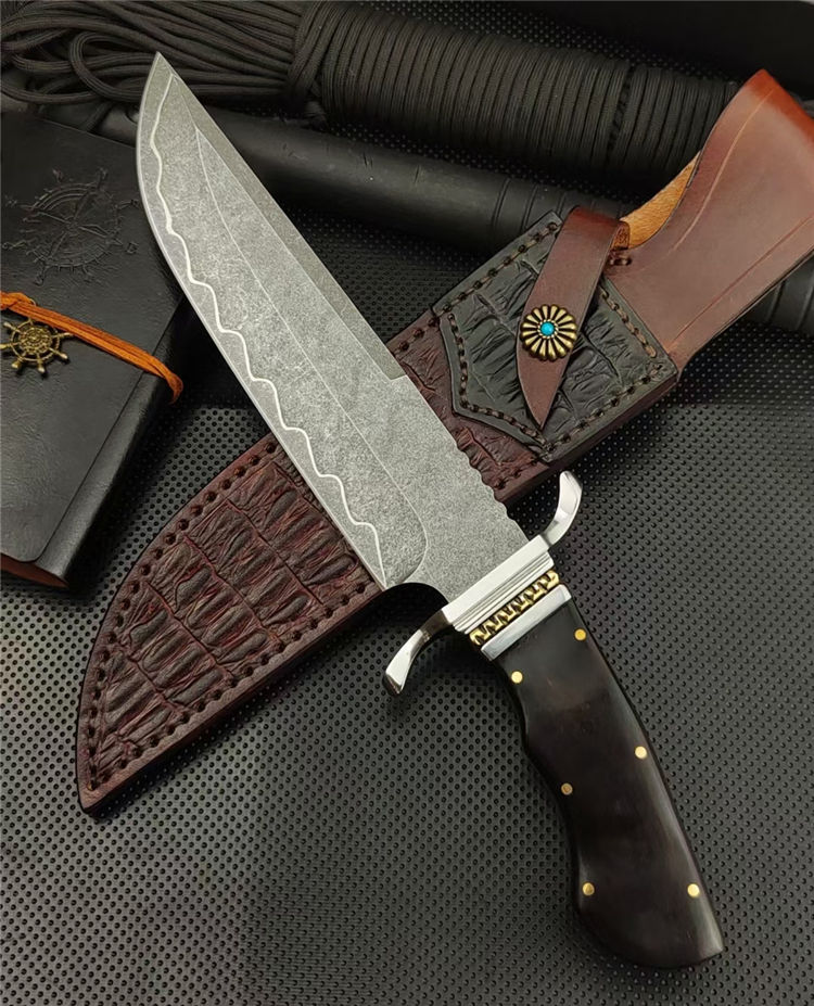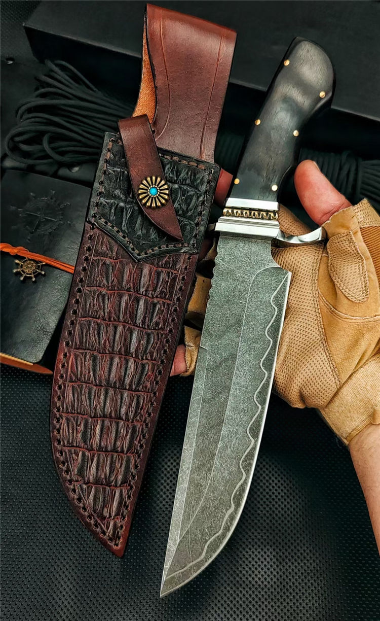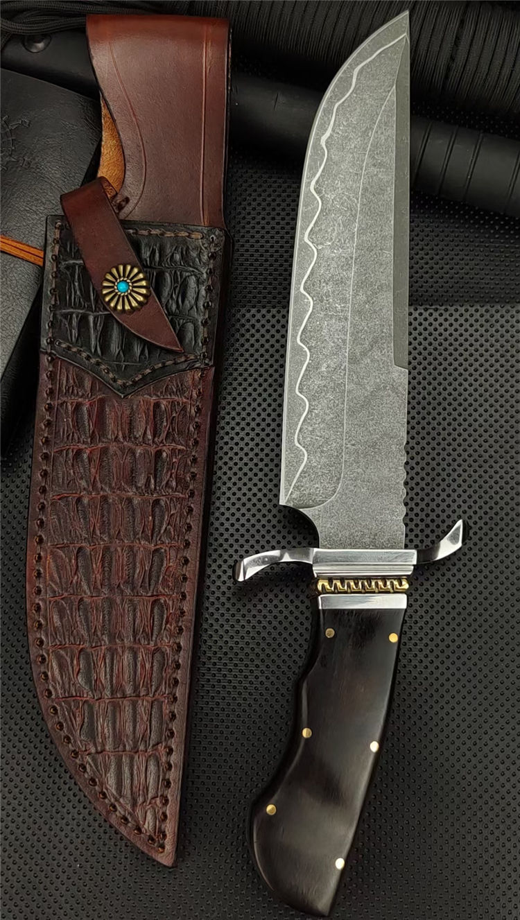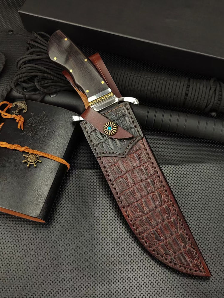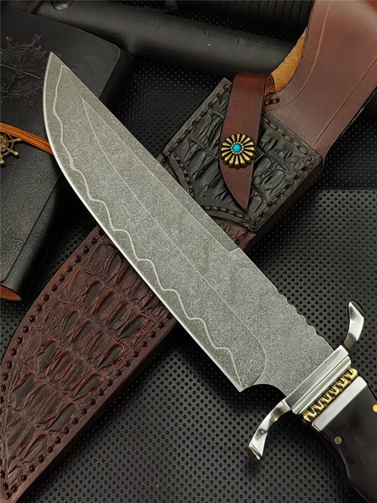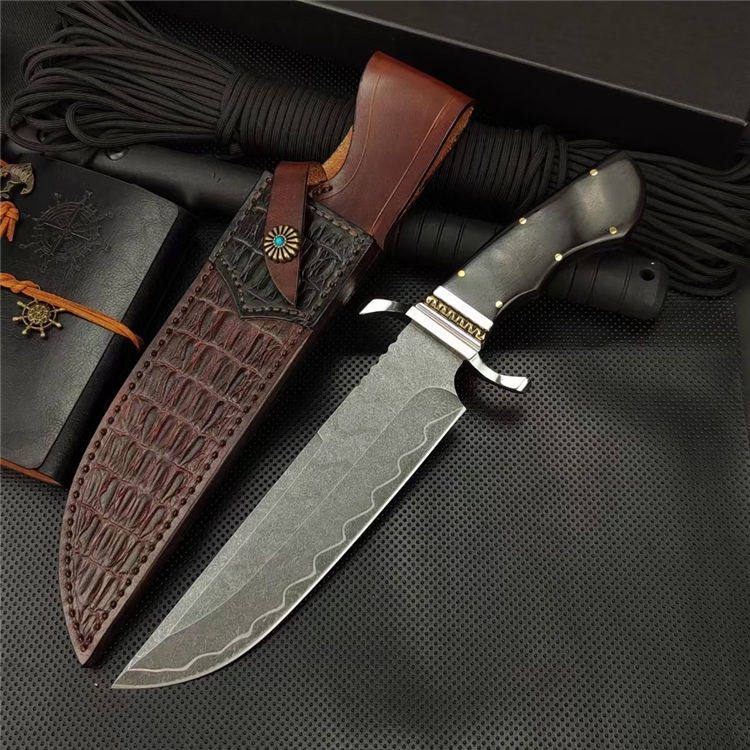 麒麟之刃直刀 全长:335mm 刃长:210mm 柄长:125mm 刃宽:45mm 最宽处刃 厚:5.0mm 刃材:DC53复合钢高温热处理 刀重:563g 净重:700g 硬度:60+HRC 表面:石洗/腐蚀/激光多工序 柄材:黑檀木精雕CNC 结构:一体龙骨 配套:进口植鞣压花手工牛皮套 包装:黑色礼盒