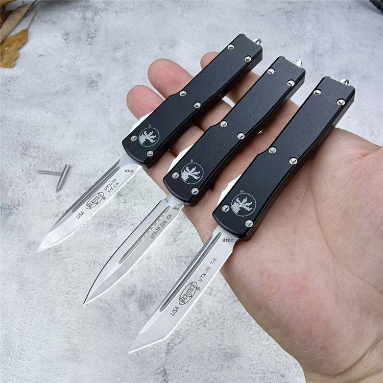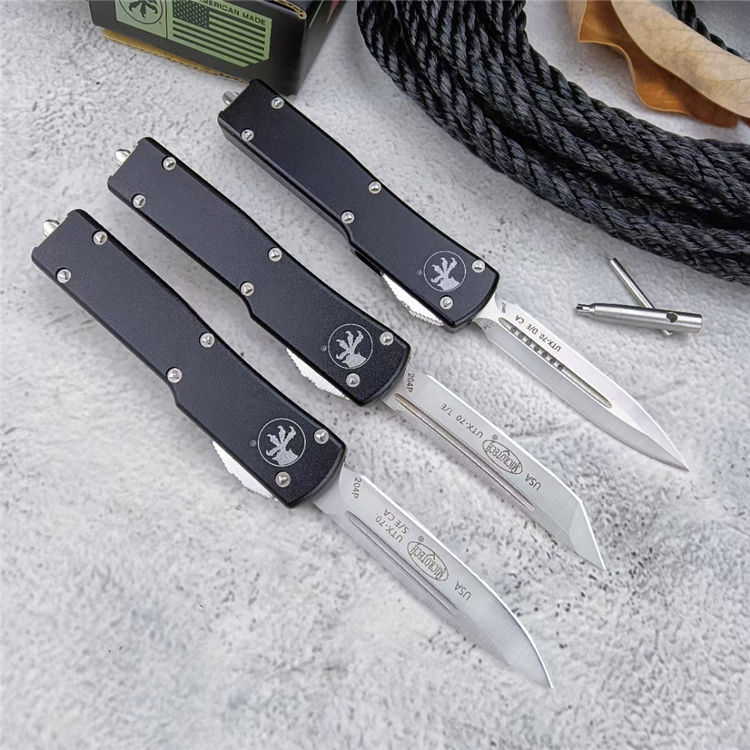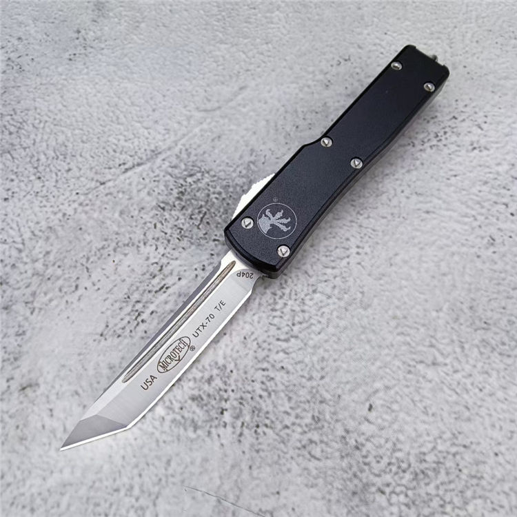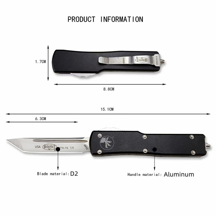 复刻版微技术UTX70直出跳刀 全长:148mm 刃长:61mm 闭合:87mm 刃厚:2mm 刃材:D2 柄材:航空铝 硬度:56-58HRC 净重:34g
