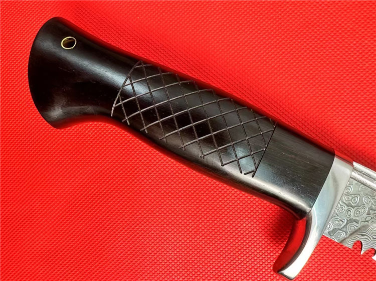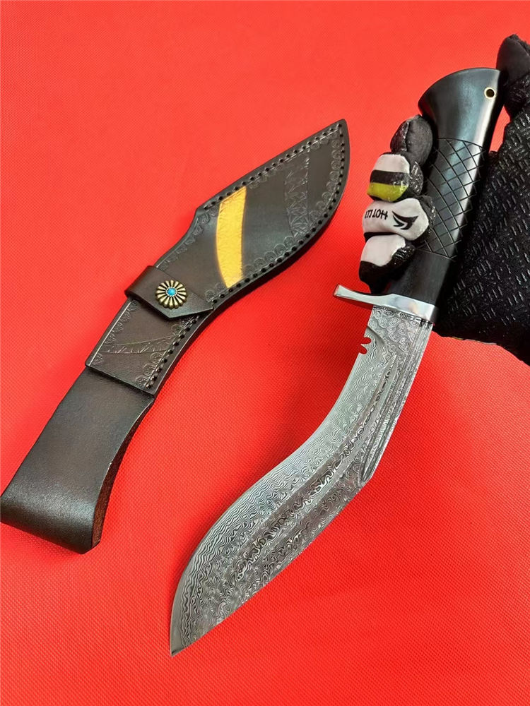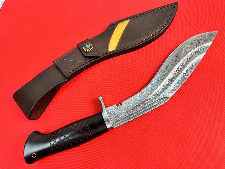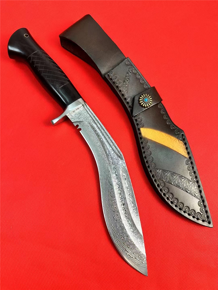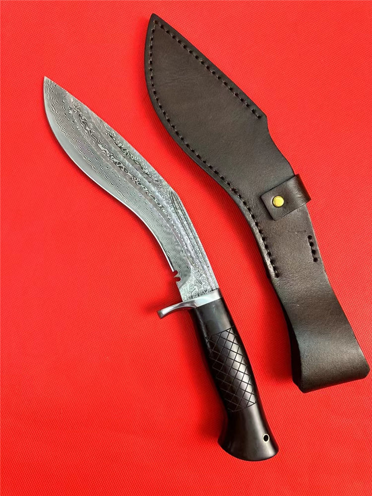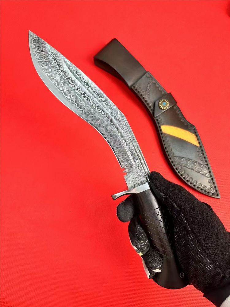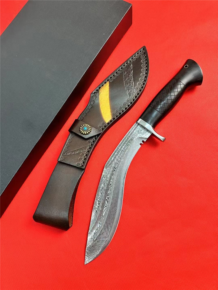 尼泊尔湾鳄狗腿弯刀 全长:330mm 刃长:185mm 柄长:125mm 刃宽:42mm 刃厚:4.5mm 刃材:进口107层大马士革夹VG10钢 刀重:277g/368g含皮套 毛重:710g含包装 硬度:60+HRC 表面:大马士革CNC雕刻+精光花纹 柄材:老树黑檀木 结构:一体龙骨 包装:进口牛皮套+EVA黑礼盒