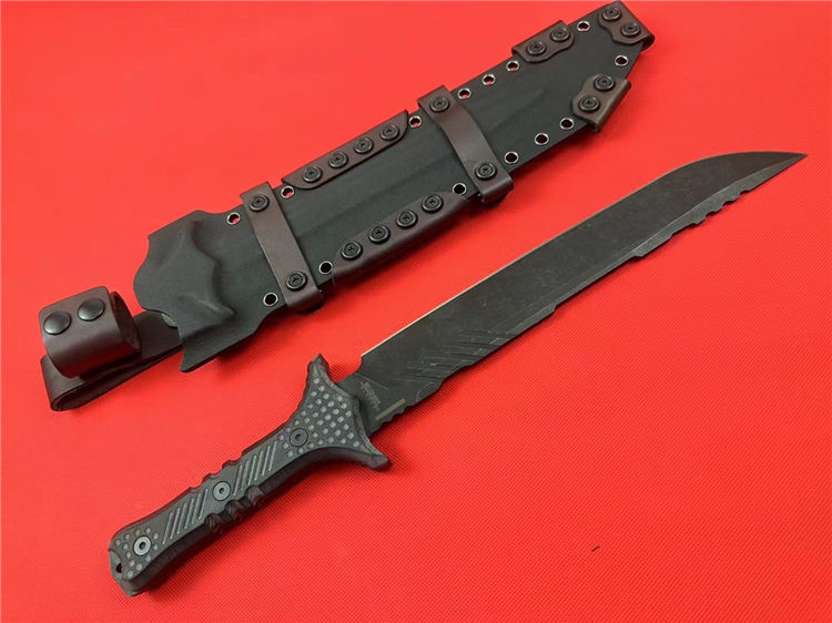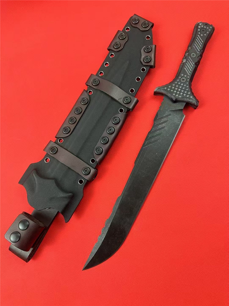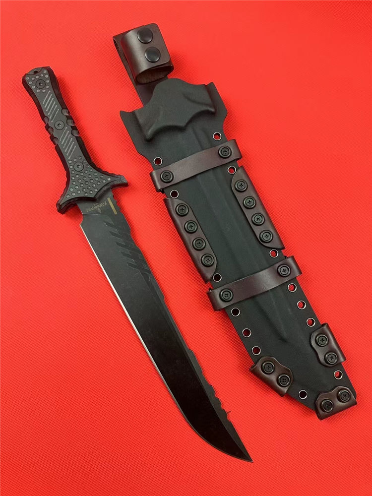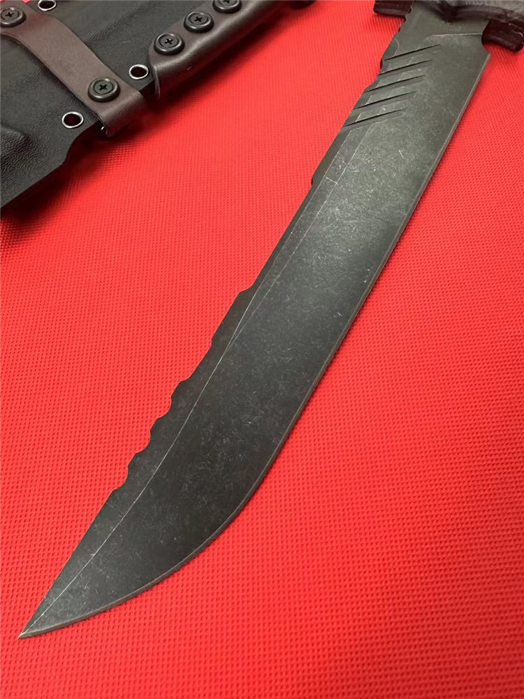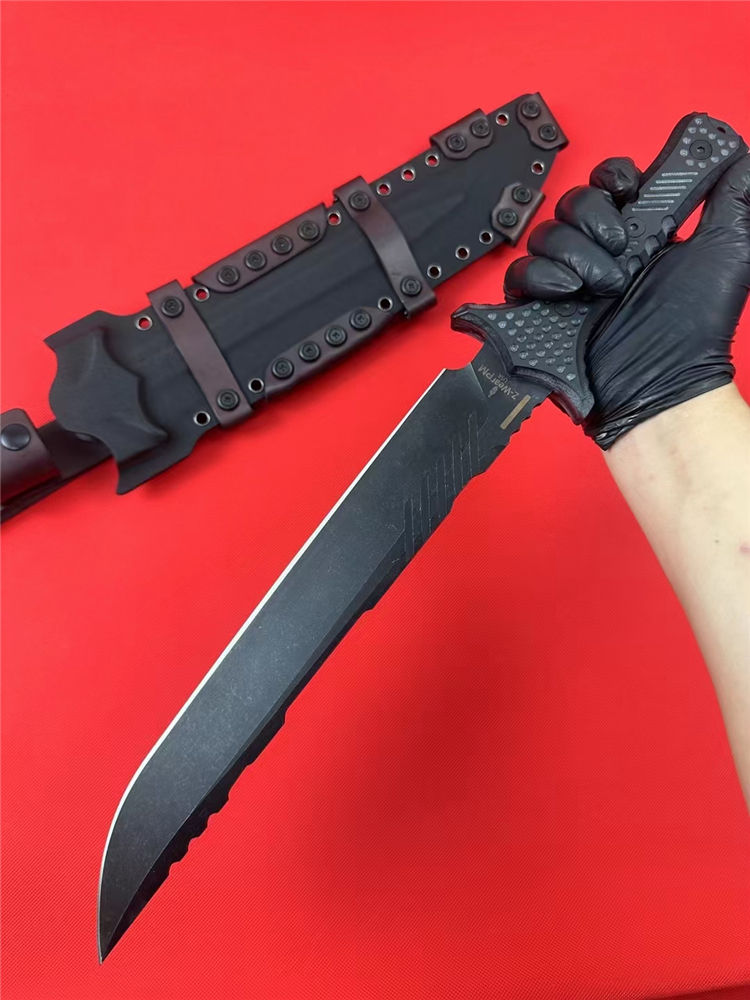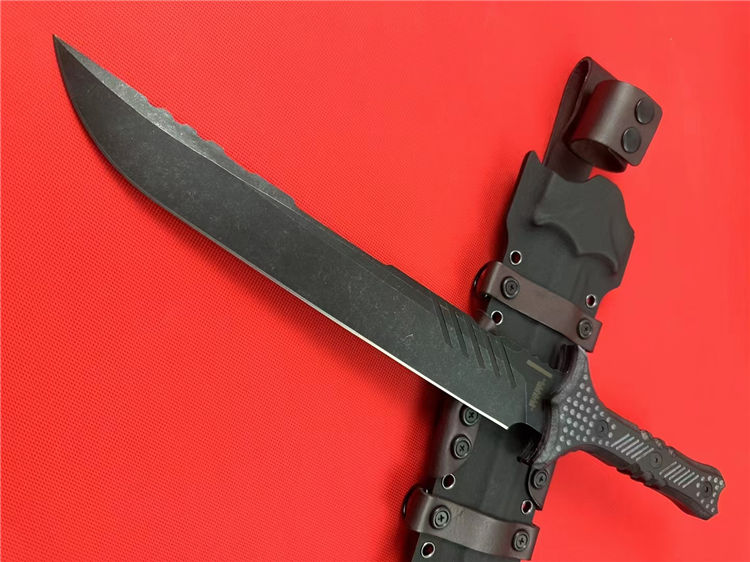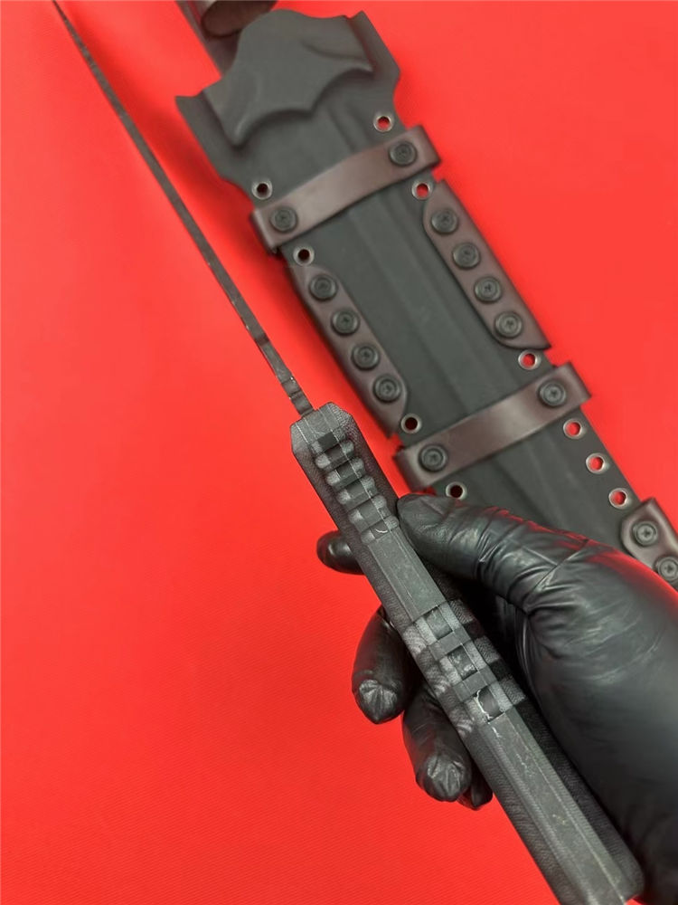 米勒M17武士直刀 全长:460mm 刃长:290mm(开刃部分) 柄长:155mm 刃宽:45mm 刃厚:5.2mm 刃材:公司提供进口A8钢 刀重:606g 毛重:948g (含鞘) 硬度:60+HRC 热处理:专业真空深冷让处理油淬 表面:阳极氧化钛涂层高级精密度石洗黑钛工艺 柄材:G10高密度碾压材料 结构:一体龙骨成形 配套:进口K鞘+进口意大利手工制作植鞣皮 包装:黑色手工盒子(合作代工出口版简包)