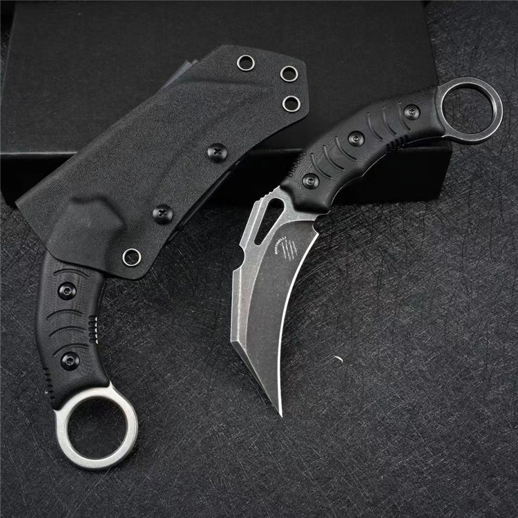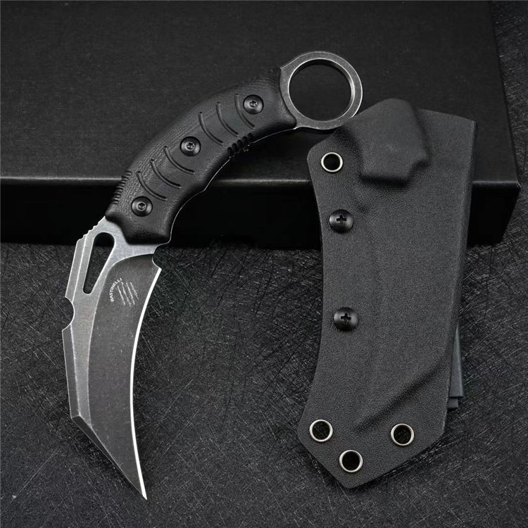巴斯重型爪刀 全长:19cm 刃长:8.7cm 柄长:11.6cm 刃厚:0.46cm 刃宽:3.4cm 刀重:205g 毛重:439g 钢材:DC53 柄材:G10 硬度:60-61HRC 表面:石洗/黑色石洗 包装:礼盒 刀鞘:Kydex鞘