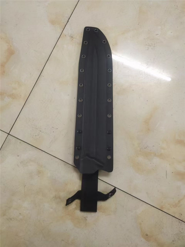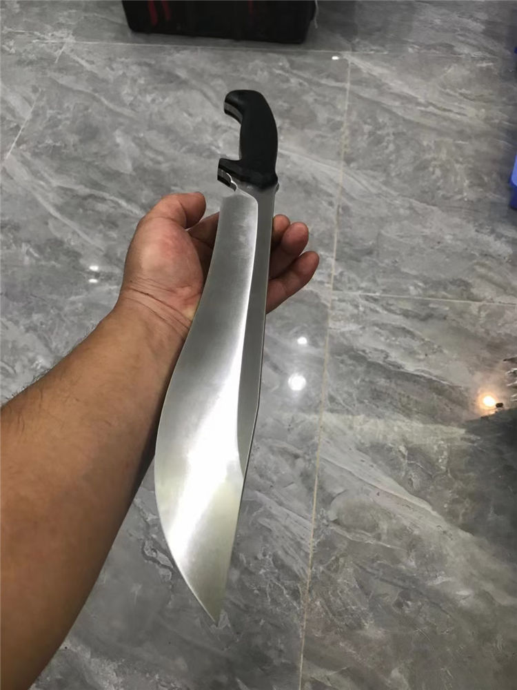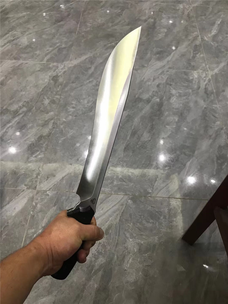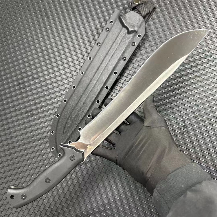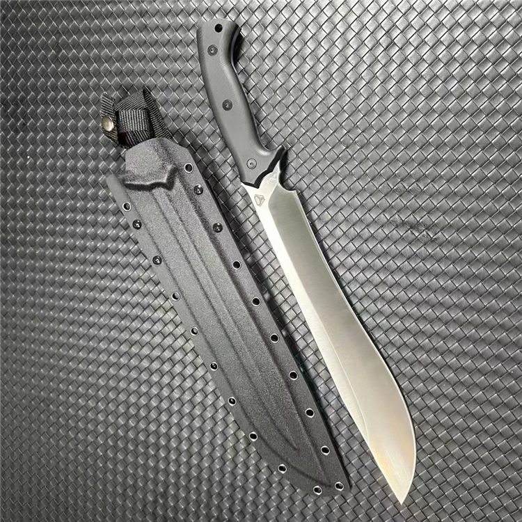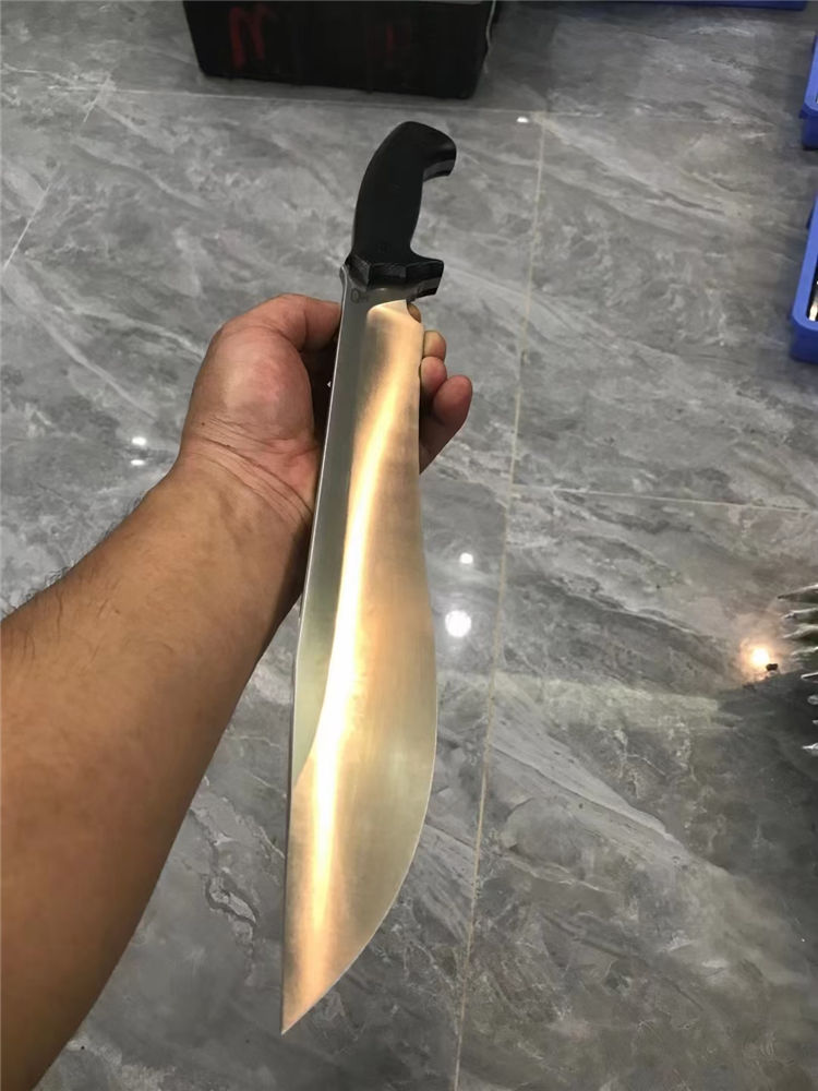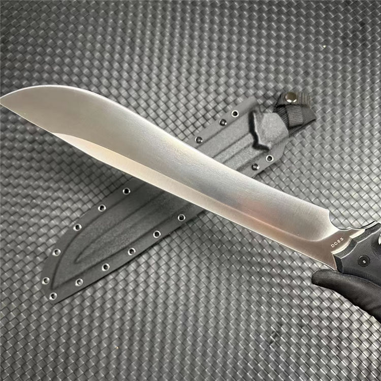 野牛魔王砍刀 全长:465mm 刃长:303mm 刃宽:40-50mm 柄长:130mm 刃厚:6.5mm 刃材:DC53钢 热处理:真空油淬热处理 硬度:59HRC 表面:砂光钢本色 柄材:G10 刀体:CNC精细加工+数控V磨 刀鞘:2.0美产K鞘