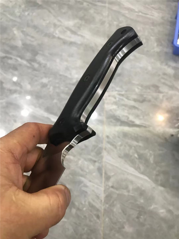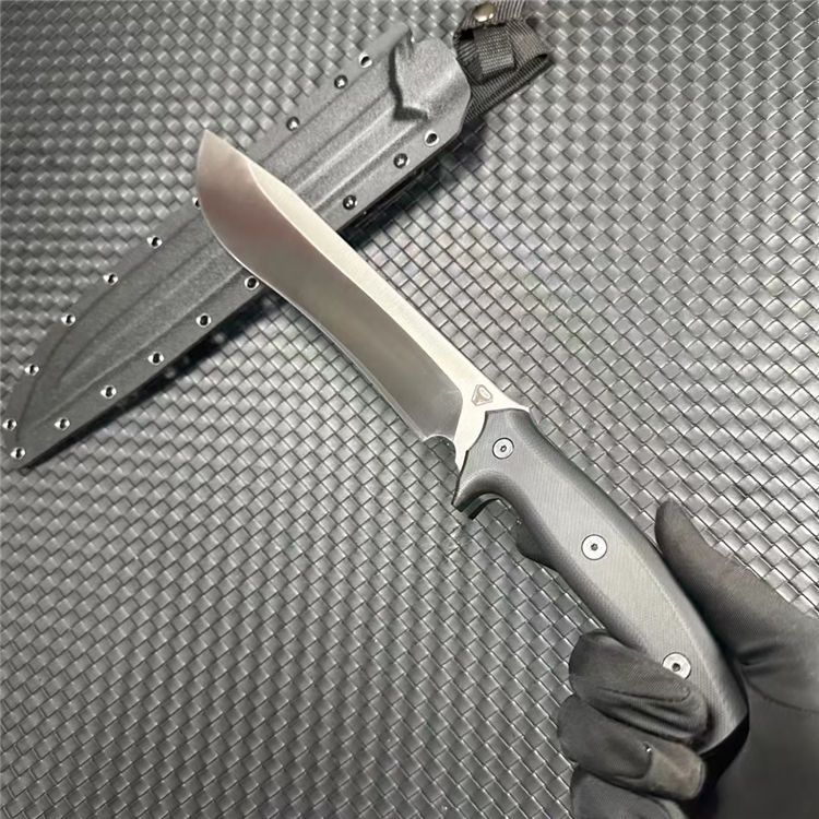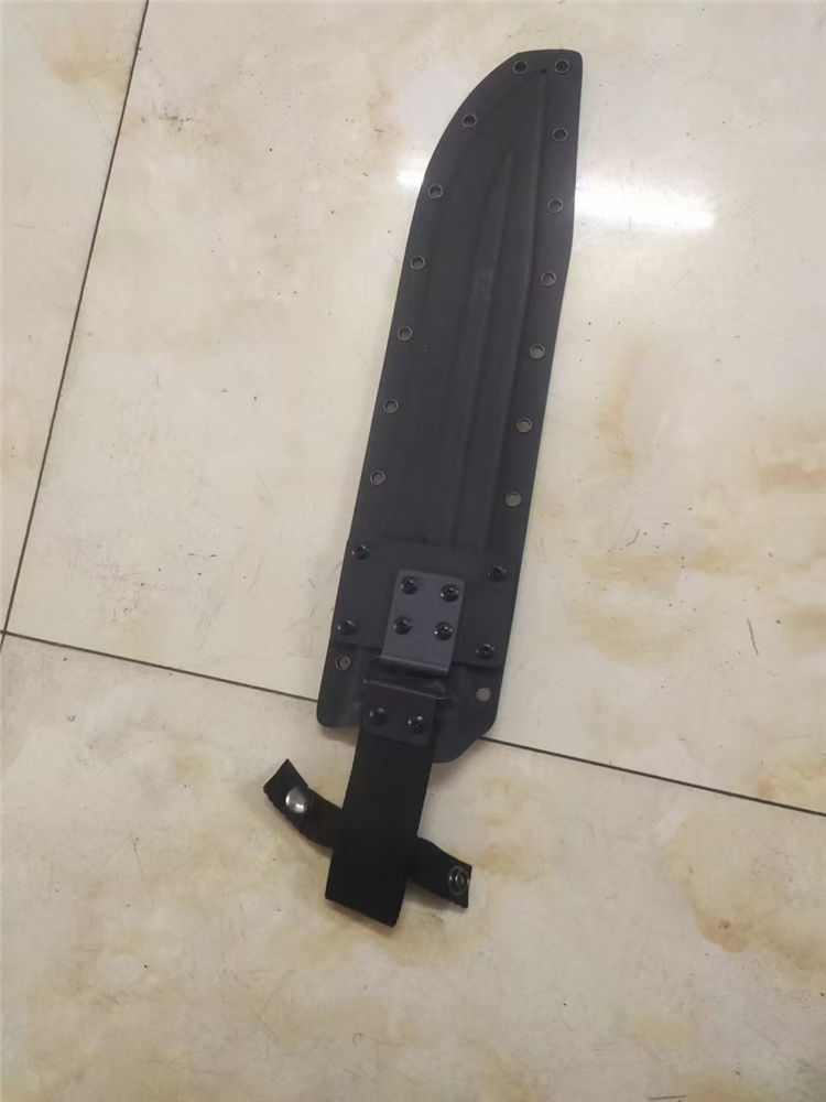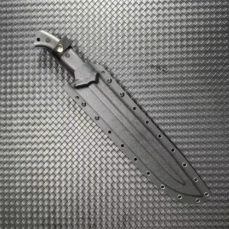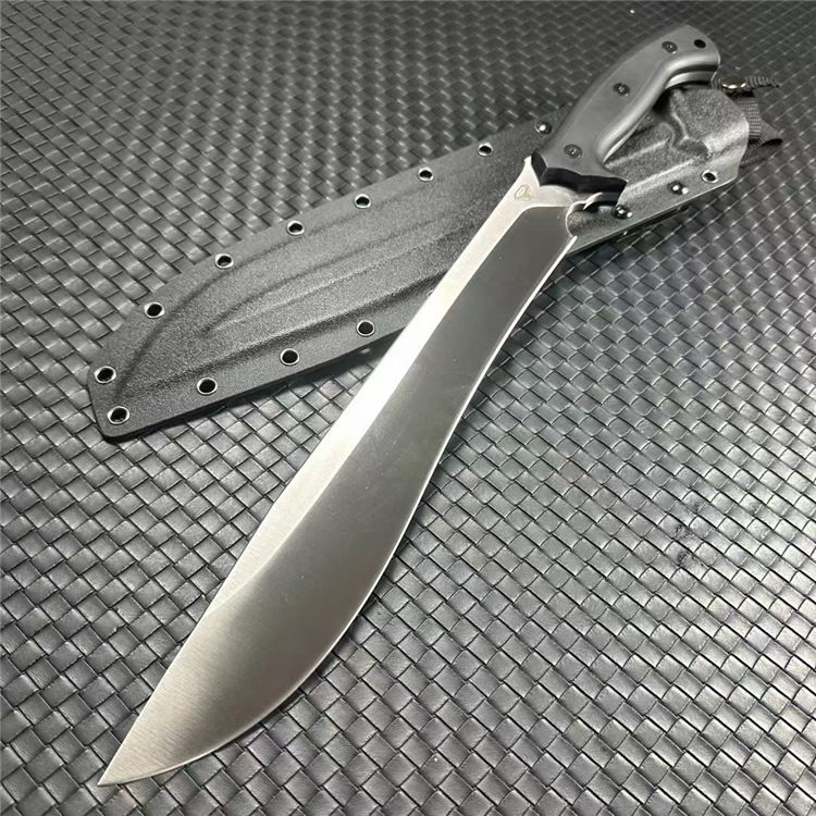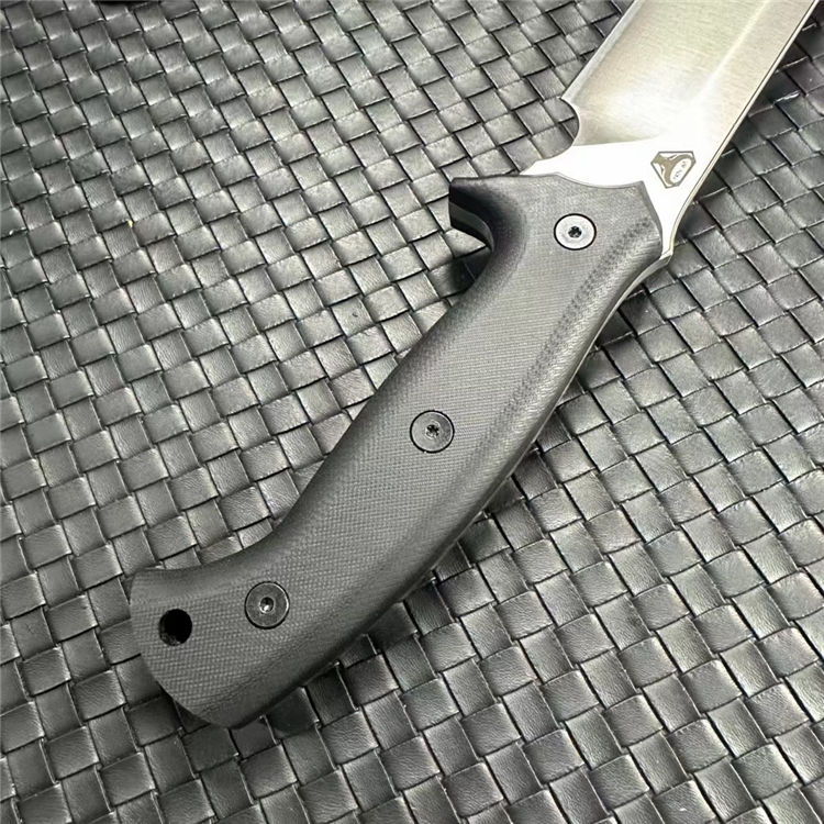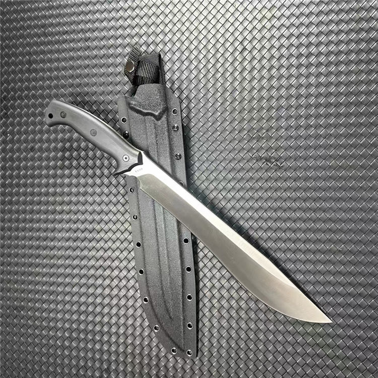 野牛魔王砍刀 全长:465mm 刃长:303mm 刃宽:40-50mm 柄长:130mm 刃厚:6.5mm 刃材:DC53钢 热处理:真空油淬热处理 硬度:59HRC 表面:砂光钢本色 柄材:G10 刀体:CNC精细加工+数控V磨 刀鞘:2.0美产K鞘