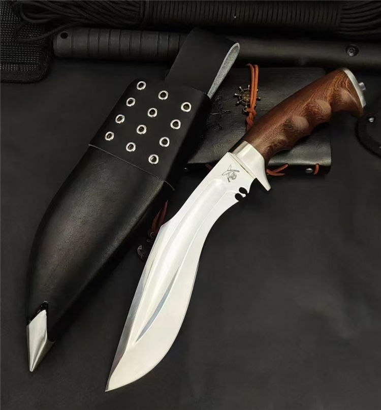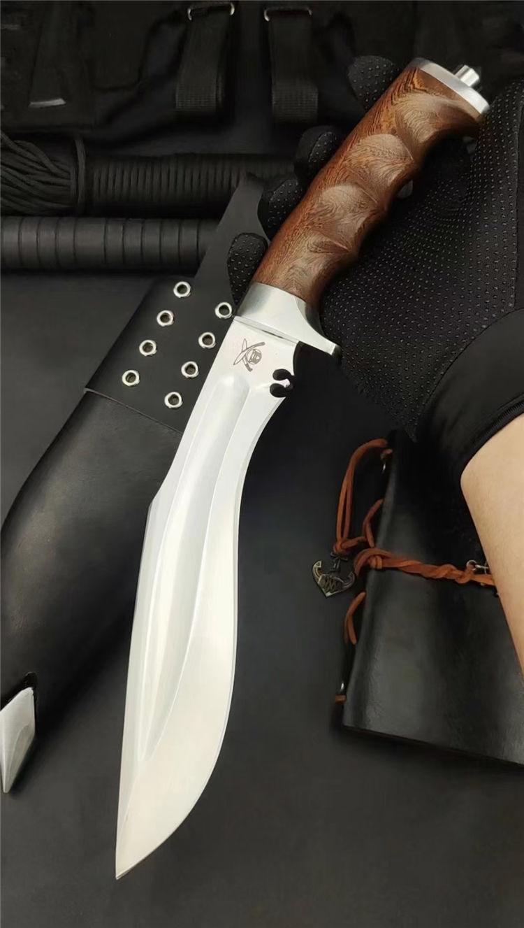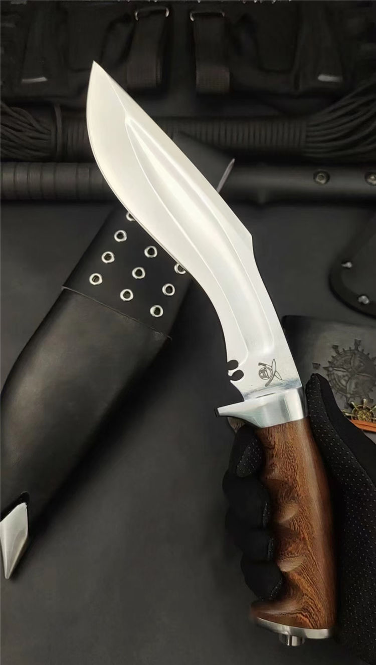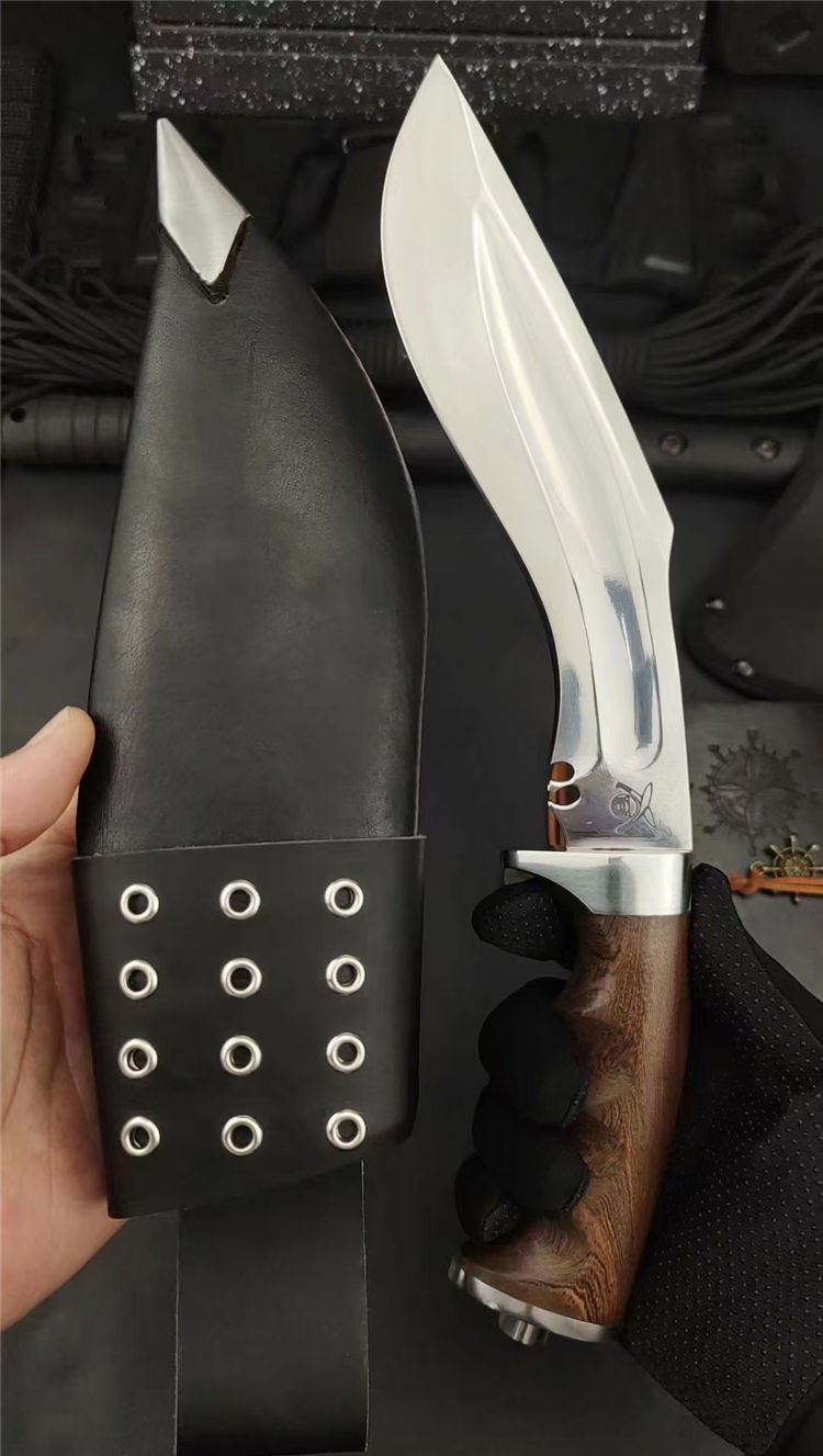 廓尔喀犀牛狗腿弯刀 全长:350mm 刃长:190mm开刃部分 柄长:140m 刃宽:43mm 刃厚:4.6mm 刃材:进口A8合金钢 刀重:440g 毛重:906g (含鞘) 硬度:60+HRC 表面:超镜光 柄材:进口颗粒黄檀木 结构:一体龙骨 配套:头层牛皮,高端皮包专用优质皮 包装:黑色礼品盒