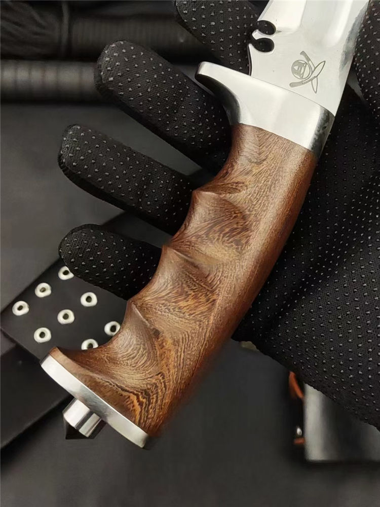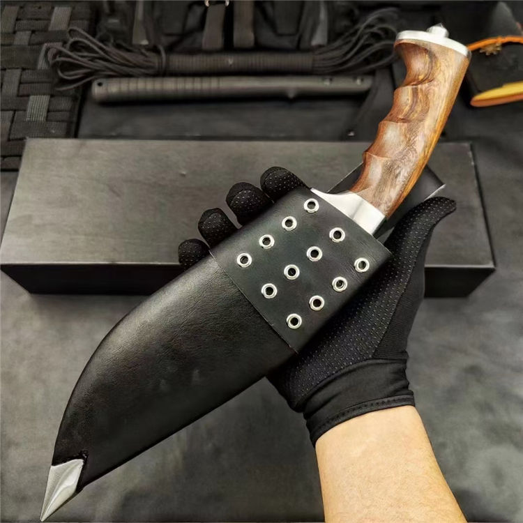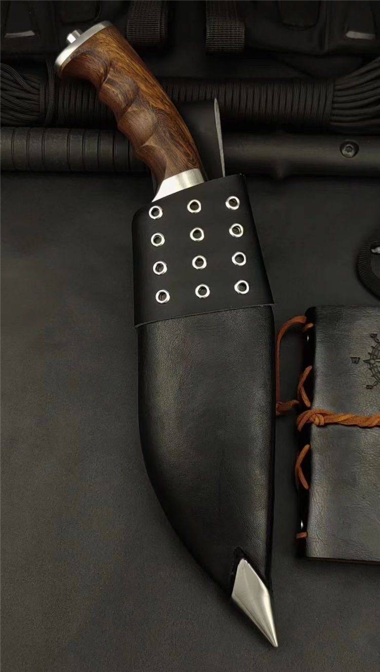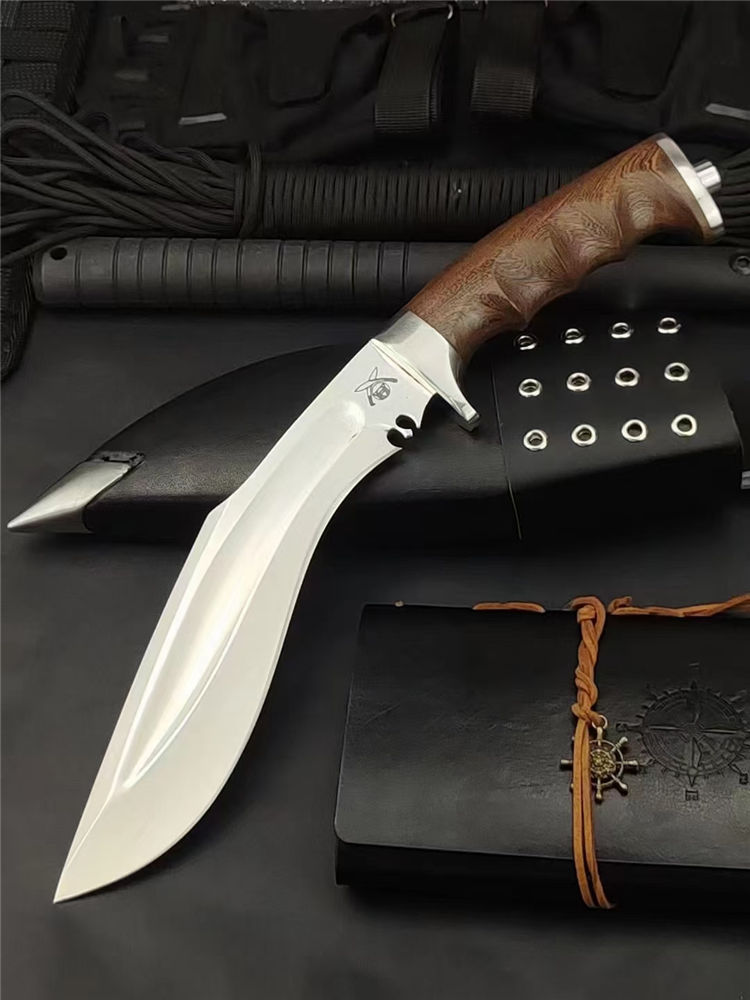 廓尔喀犀牛狗腿弯刀 全长:350mm 刃长:190mm开刃部分 柄长:140m 刃宽:43mm 刃厚:4.6mm 刃材:进口A8合金钢 刀重:440g 毛重:906g (含鞘) 硬度:60+HRC 表面:超镜光 柄材:进口颗粒黄檀木 结构:一体龙骨 配套:头层牛皮,高端皮包专用优质皮 包装:黑色礼品盒