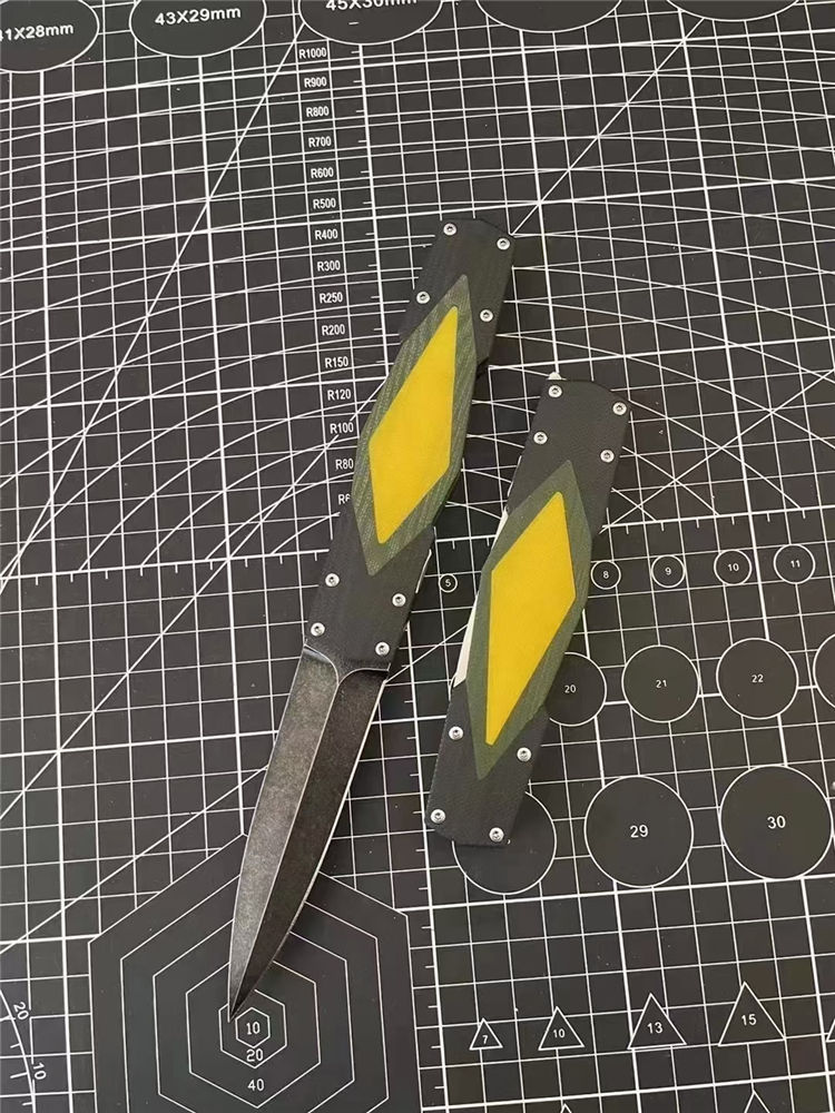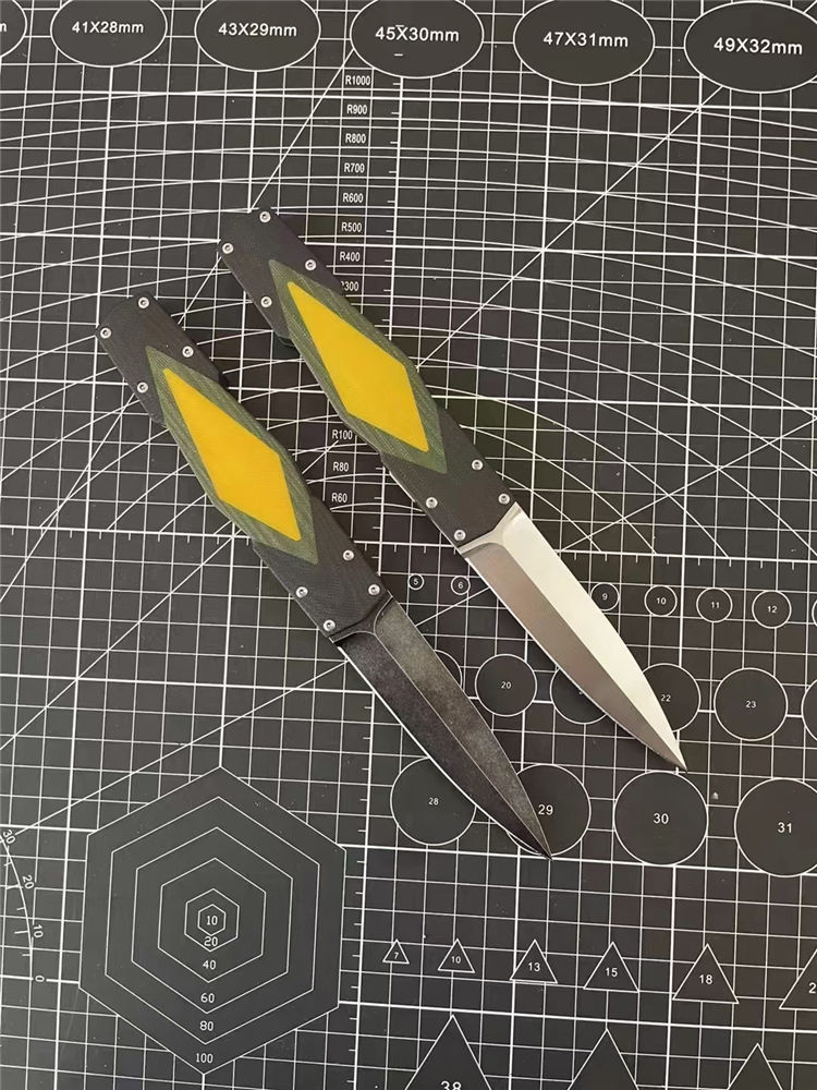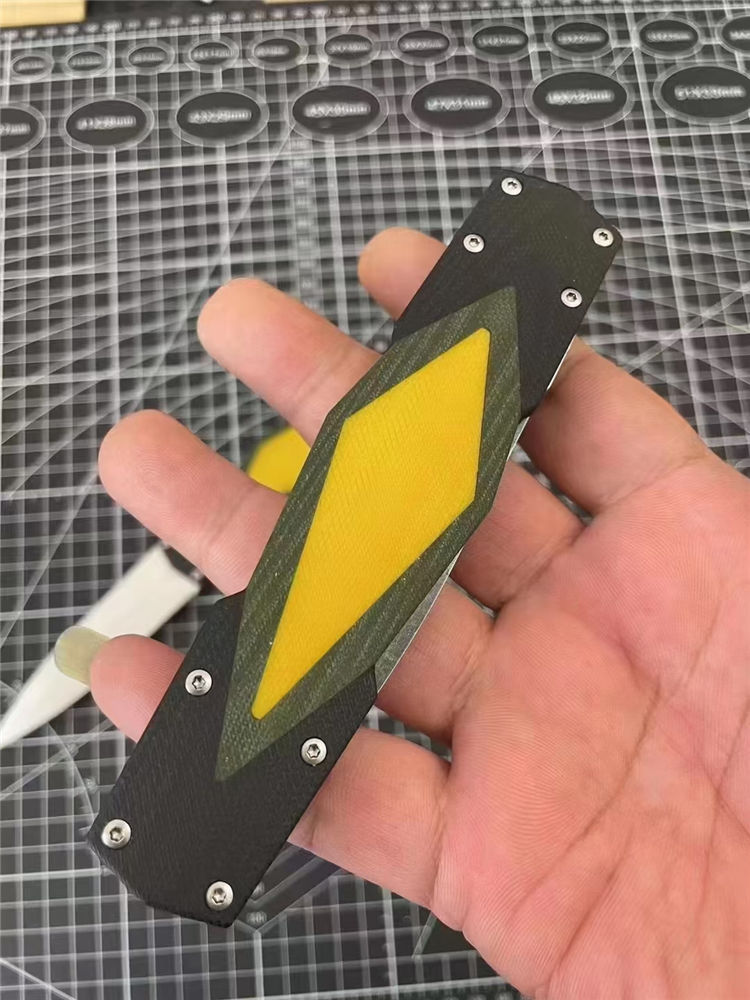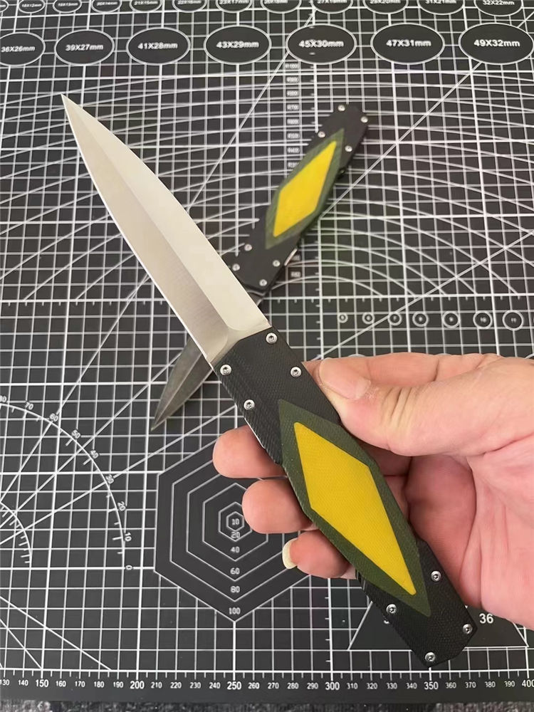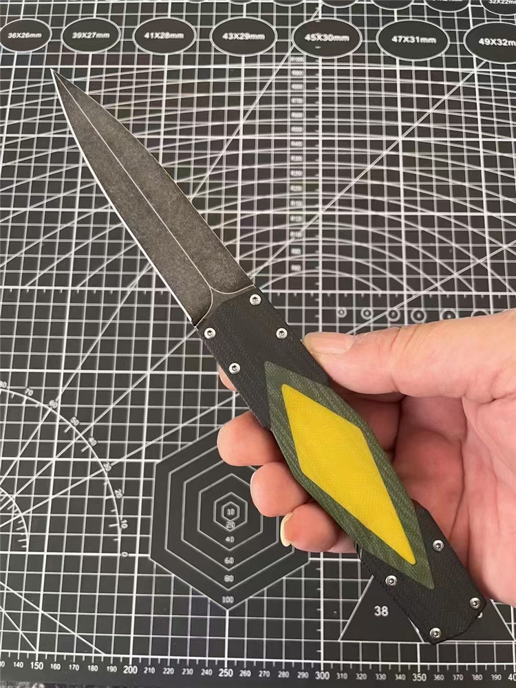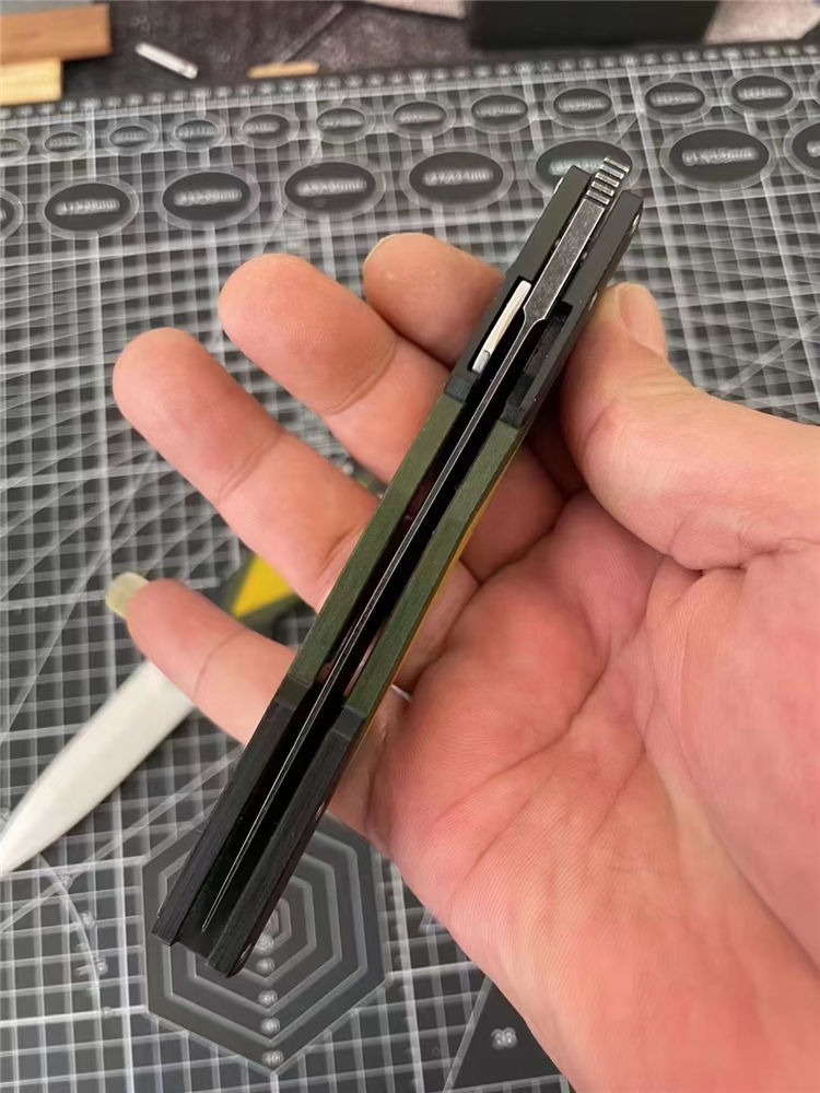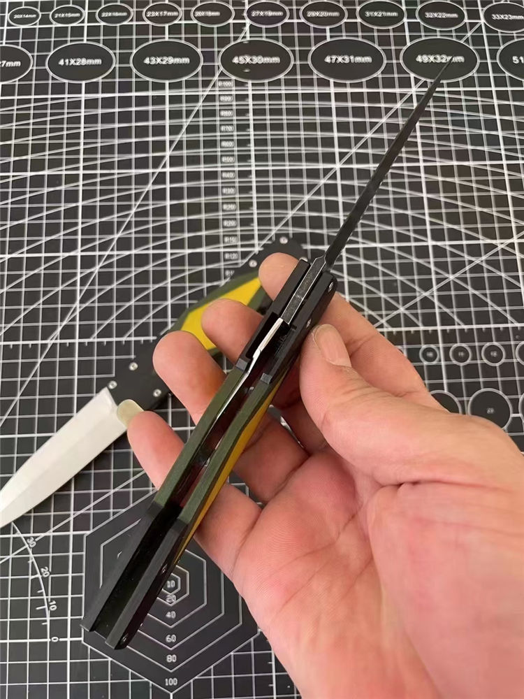 星剑D2钢折刀 全长:228mm 刃长:99mm 柄长:113mm 刃宽:24mm(最宽处) 刃厚:4mm 刃材:GB-D2 (标准D2钢) 净重:155克) 硬度:60HRC 表面:黑石洗、钢本色 柄材:G10 刀夹:不锈钢 螺丝:不锈钢 结构:陶瓷轴承,快开设计