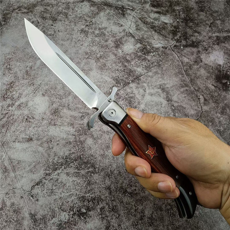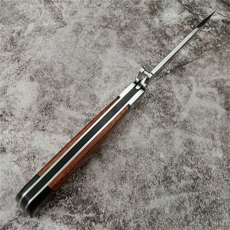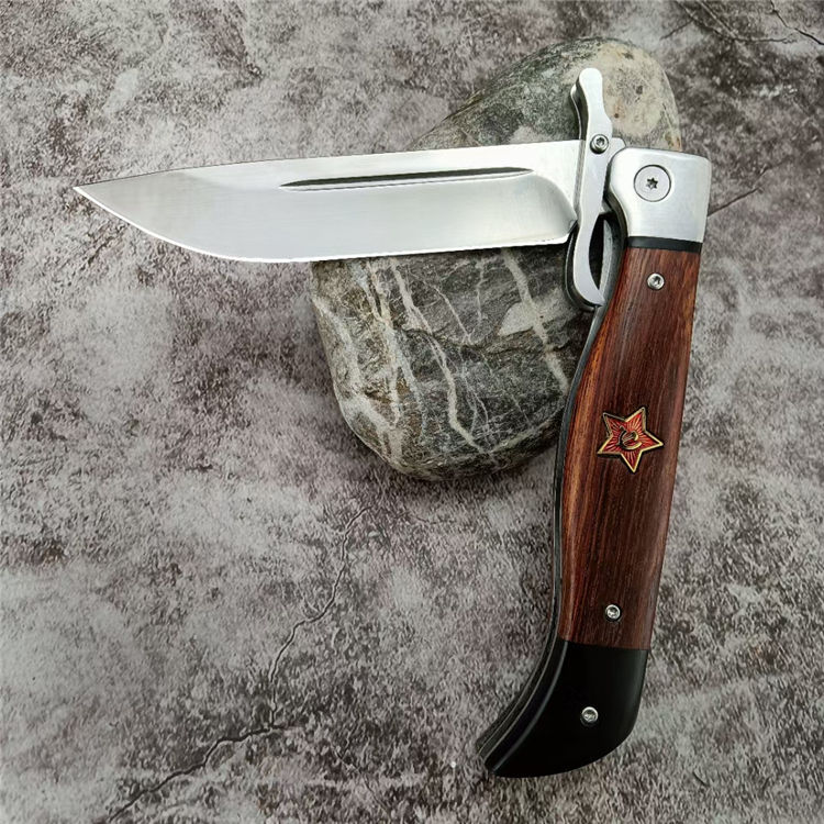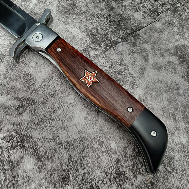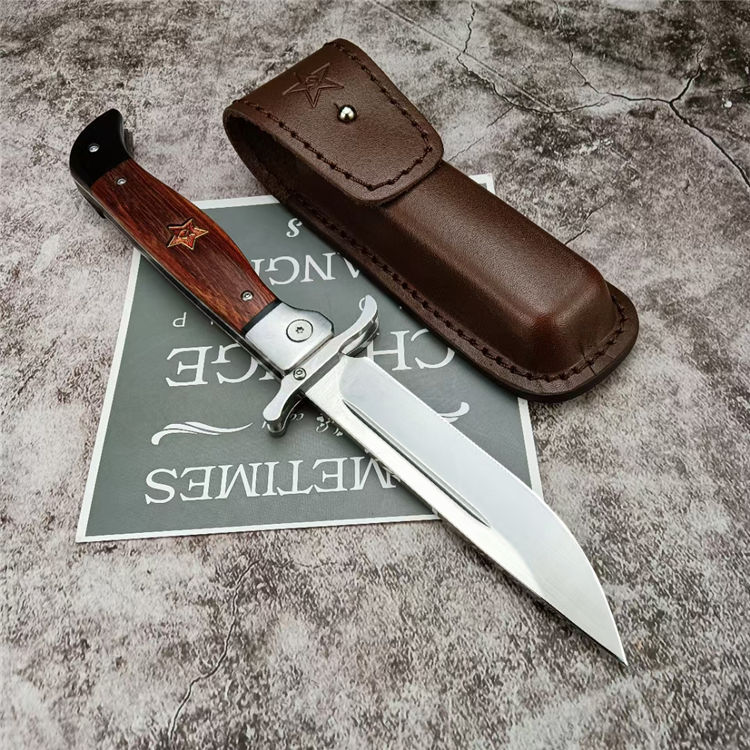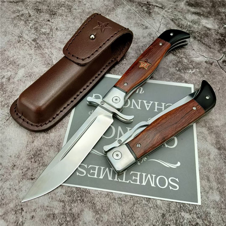 爱国者二代折刀 总长:24.5CM 刃长:11.2CM 刃宽:2.2CM 刃厚:3.5MM 刃材:440C 柄材:酸枝木 柄长:13.3CM 柄宽:23MM 柄厚:18MM 重量:170G 刀鞘:牛皮鞘