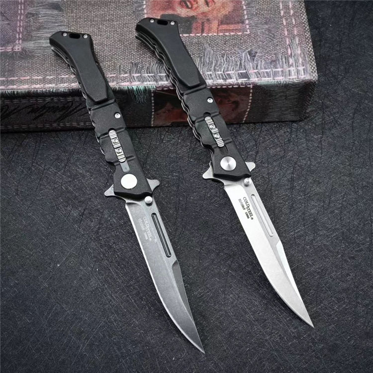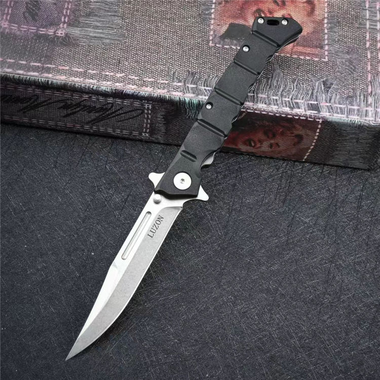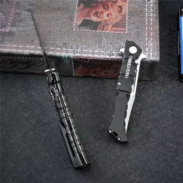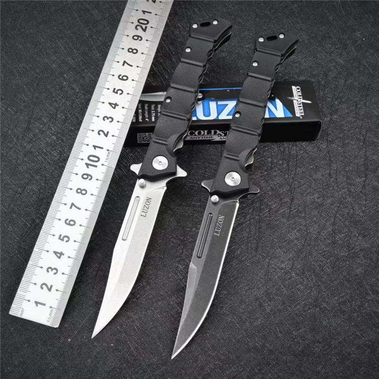 冷钢吕宋20NQL折刀 全长:22.6cm 刃长:9.9cm 柄长:12.9cm 刃厚:0.25cm 刃宽:1.8cm 刀重:94g 毛重:102g 钢材:8Cr13MoV钢 柄材:尼龙玻璃纤维 硬度:58-59HRC 表面处理:石洗/黑色石洗 包装:彩盒原厂包装 手柄侧面带安全锁