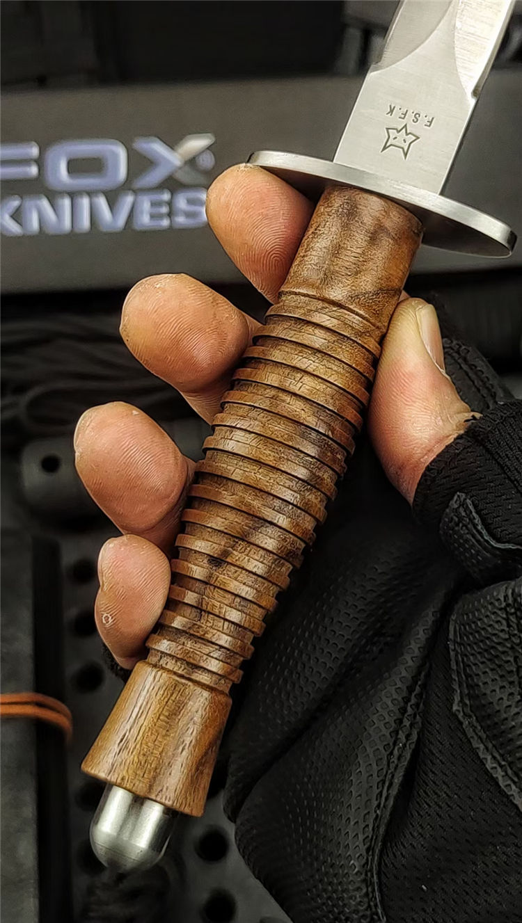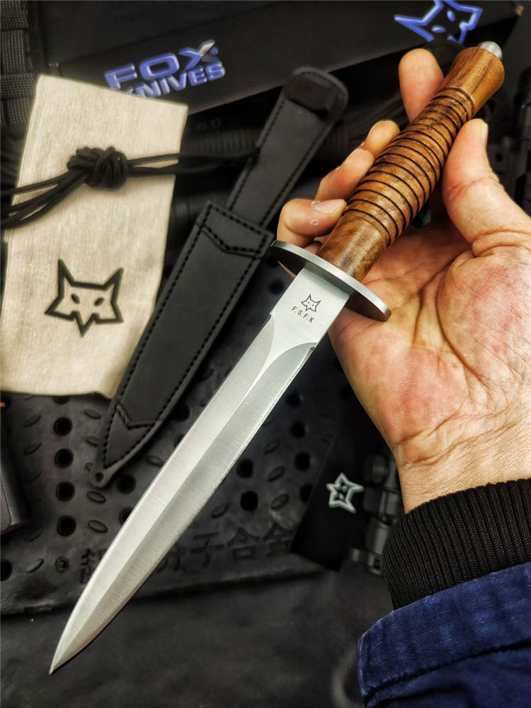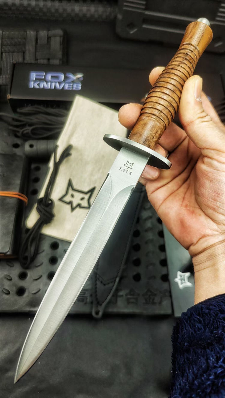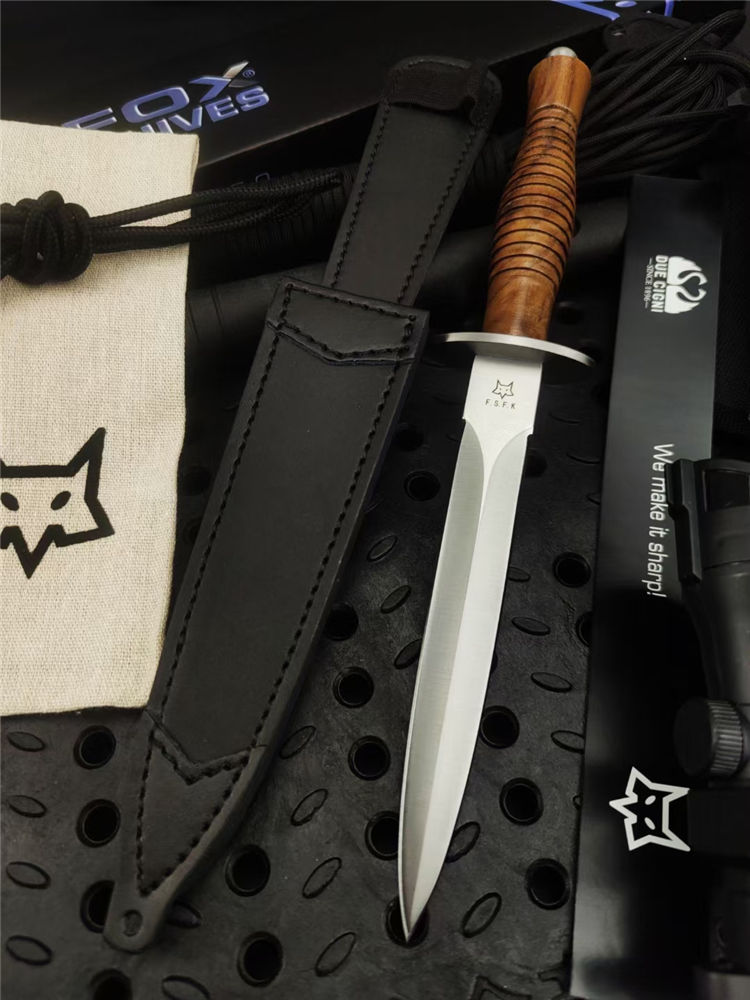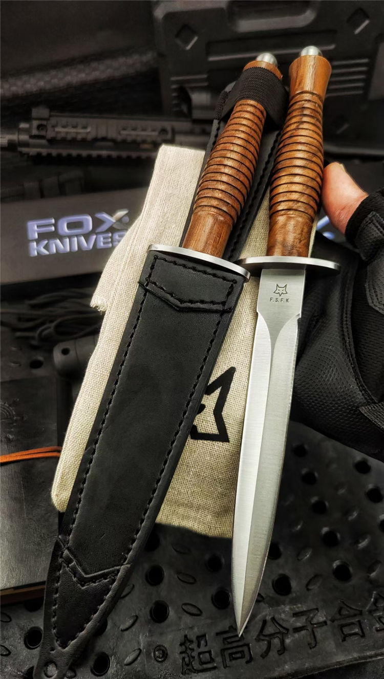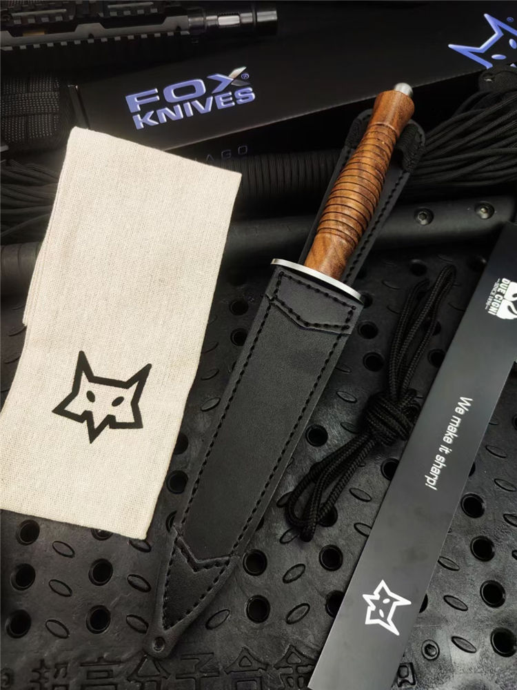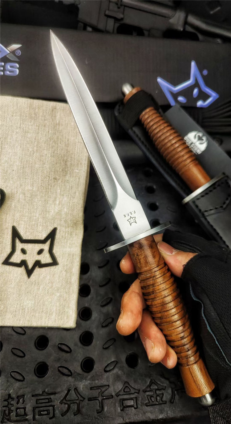 狐狸FX-593AF直刀 全长:305mm 刃长:170mm 柄长:135mm 刃宽:23mm 刃厚:4.8mm 刃材:N690Co钢公司提供 刀重:153g 毛重:215g (含鞘) 硬度:60±HRC 热处理:专业真空深冷让处理油淬二次 表面:精细砂光手工拉丝 柄材:进口胡桃木CNC精雕 结构:一体龙骨成形 配套:进口手工皮套+伞绳+狐狸布袋 包装:原装礼盒(合作代工出口版简包)