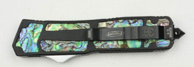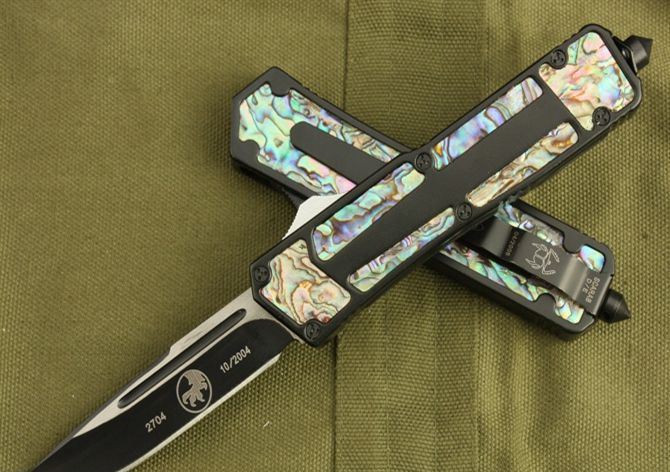 开启长度:22CM 合起长度:13.5CM 刃 厚:0.3CM 硬 度:57 HRC 刃 材:440c 表 面:发黑 把 手:航空铝合金+鲍鱼壳 净 重:220克(整刀) 毛 重:300克(含包装物) 开 合:双动作,直推开关,自动弹出和收回(刀头比较牢固,只有很轻微的摇动) 包 装:耐磨专用战术尼龙套。 口袋刀夹:弹簧刀夹玻璃敲击器:钨质玻璃敲击器。