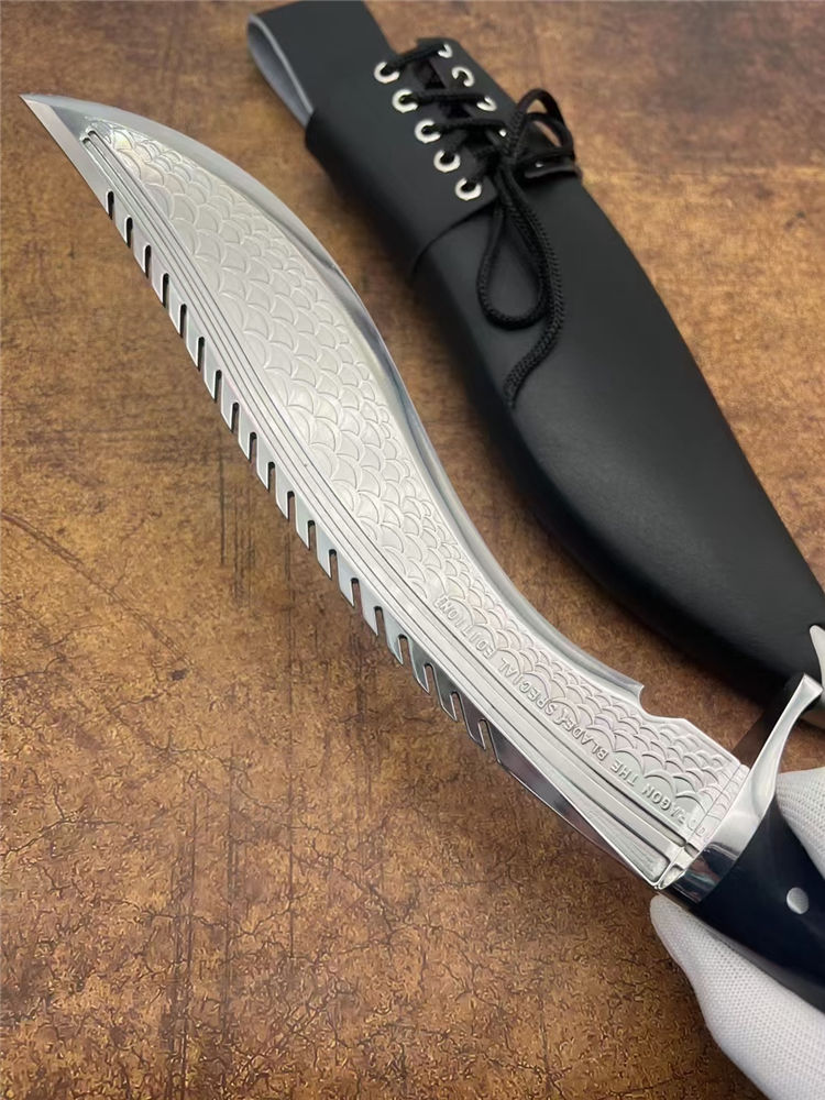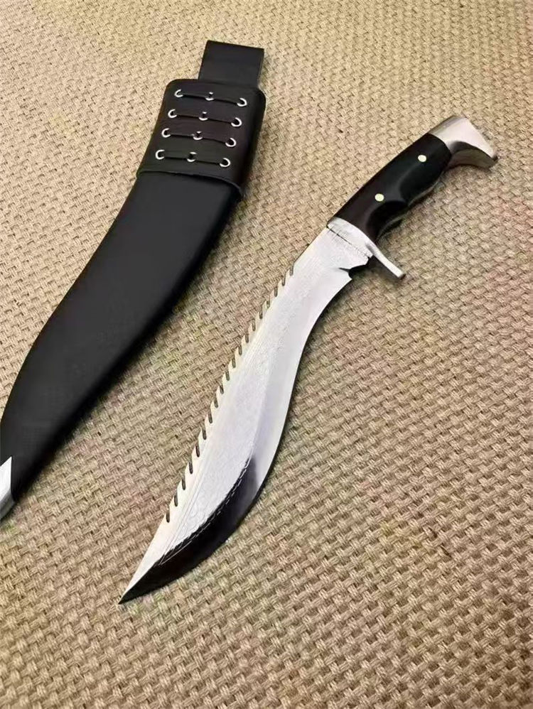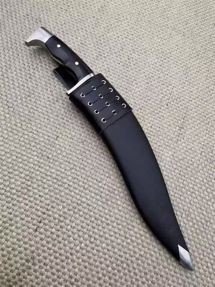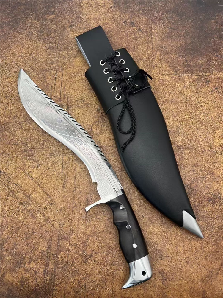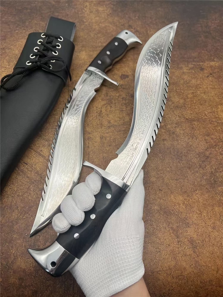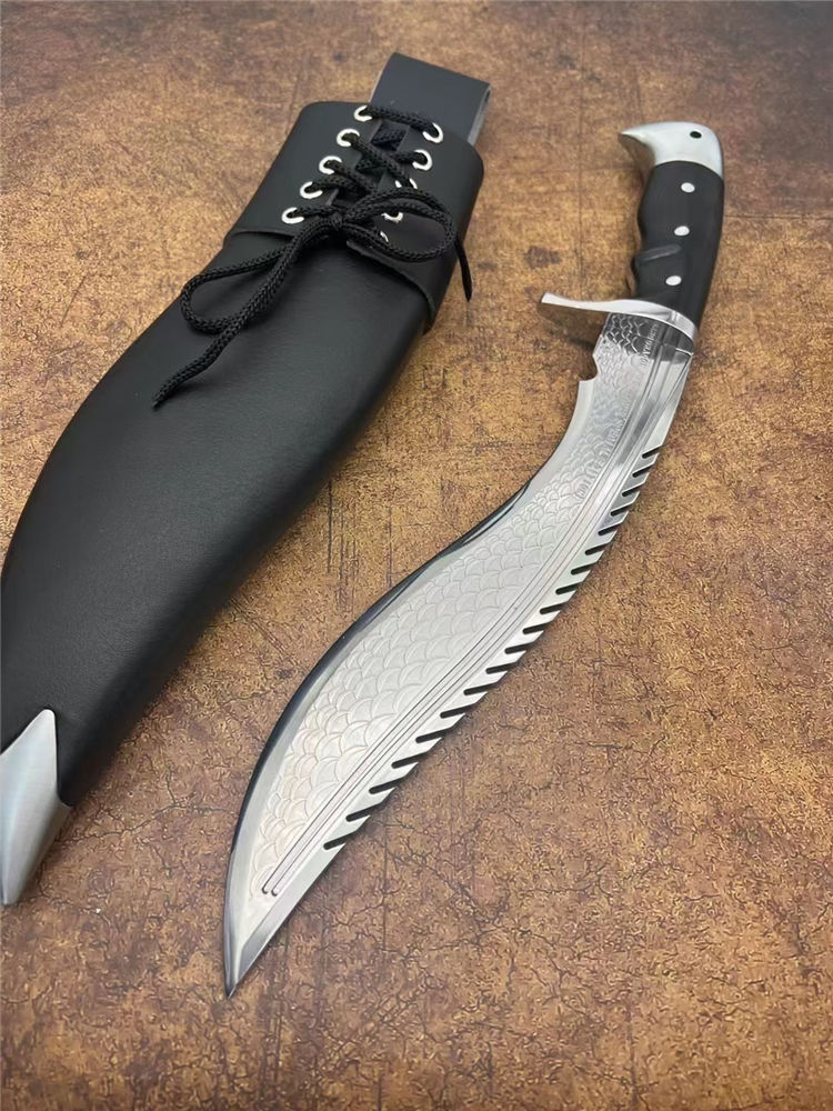复刻版尼泊尔龙之刃狗腿弯刀 全长:37.5cm 刃长:25.5 柄长:12.m 刃宽:45mm 刃厚:6mm 刃材:A8合金钢 刀重:745g含鞘1160g 硬度:60+HRC 表面:超镜光 柄材:进口紫光檀木 结构:一体龙骨 配套:刀鞘头层包牛皮,皮带人革 包装:黑色礼品盒