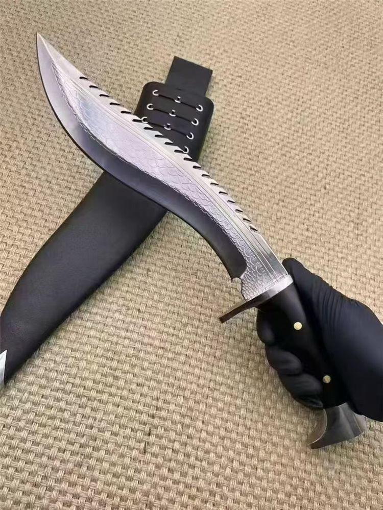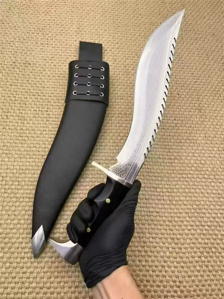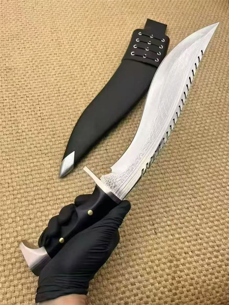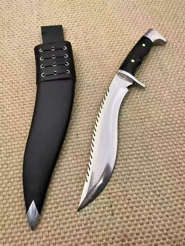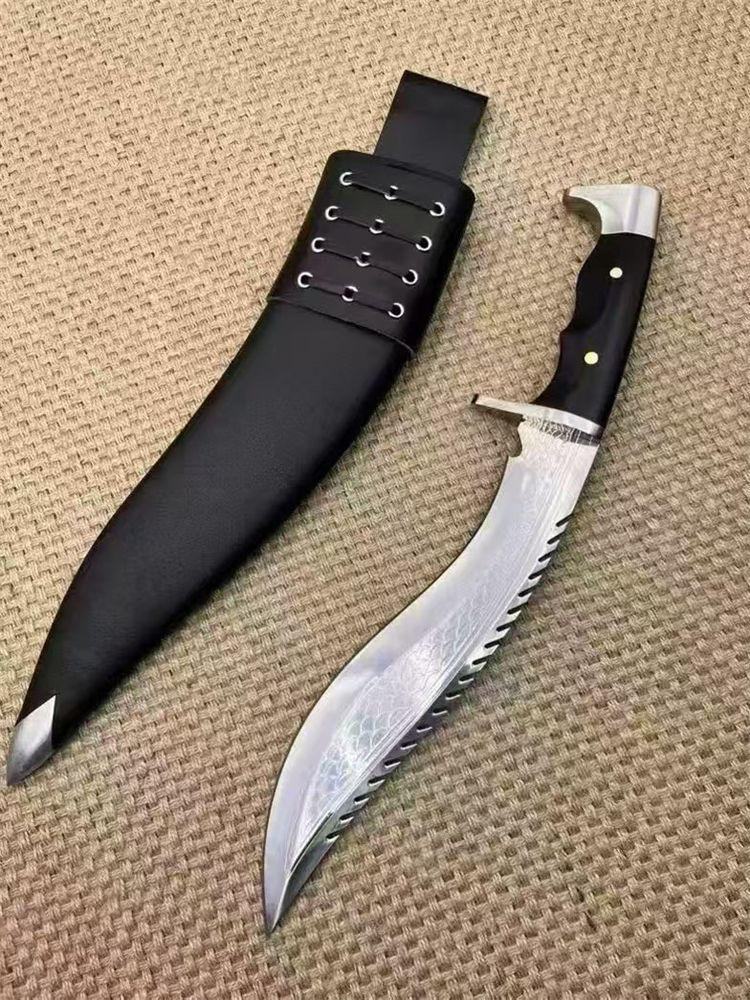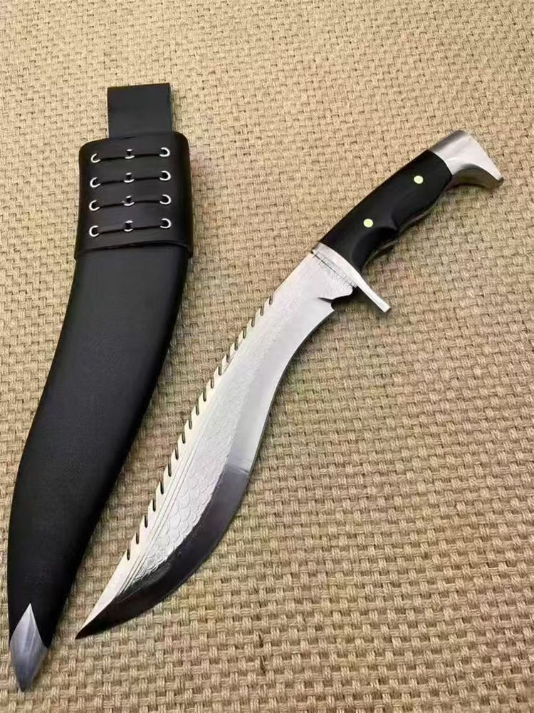 复刻版尼泊尔龙之刃狗腿弯刀 全长:37.5cm 刃长:25.5 柄长:12.m 刃宽:45mm 刃厚:6mm 刃材:A8合金钢 刀重:745g含鞘1160g 硬度:60+HRC 表面:超镜光 柄材:进口紫光檀木 结构:一体龙骨 配套:刀鞘头层包牛皮,皮带人革 包装:黑色礼品盒