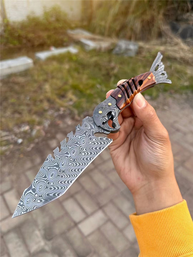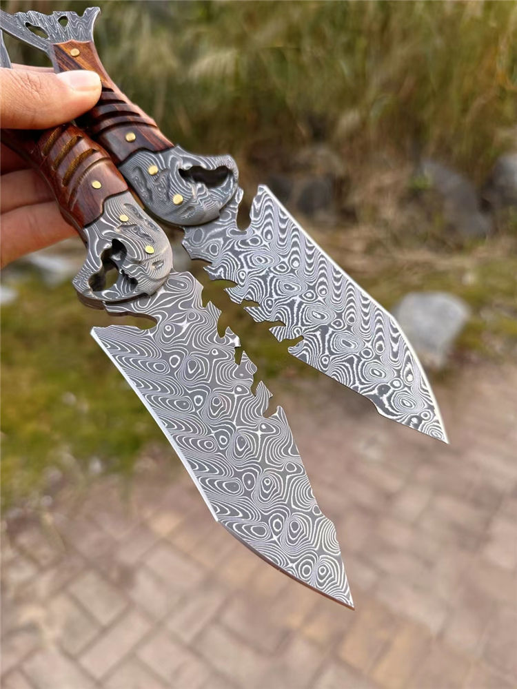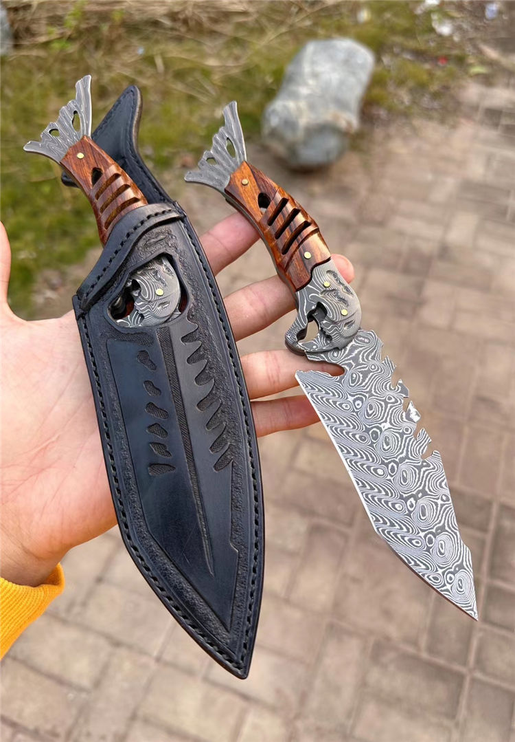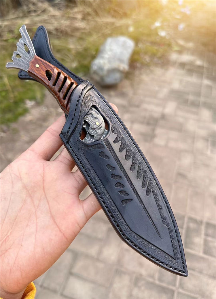 大马士革远古鱼骨直刀 总长:25.3cm 刀刃:12.3cm 手柄:13cm 厚度:3.3MM 宽度:3.7cm 钢材:进口美国一体大马士革钢(95层) 表面:原大马士革云眼纹 硬度:60-61HRC 热处理:真空热处理, 柄材:95层锻造大马士革钢头+进口美国沙漠铁木 皮套:意大利进口植鞣皮/手工雕花缝线制作 包装:黑色手工盒