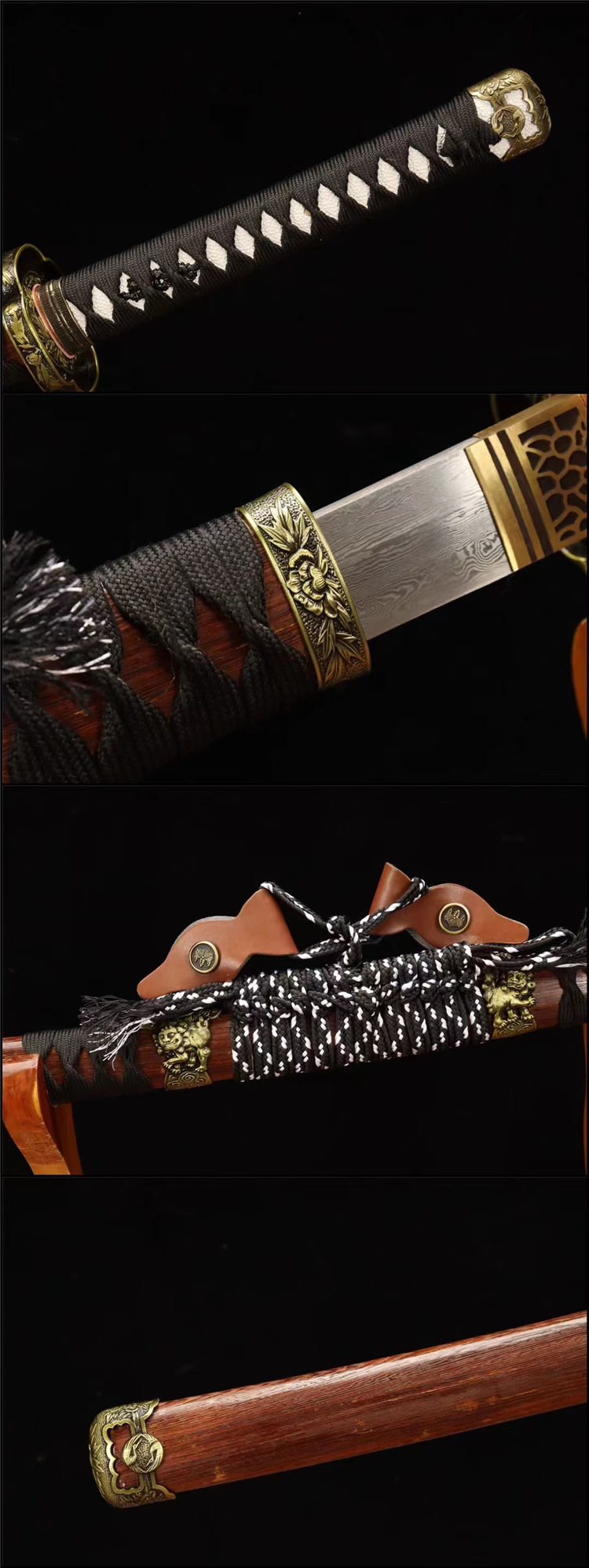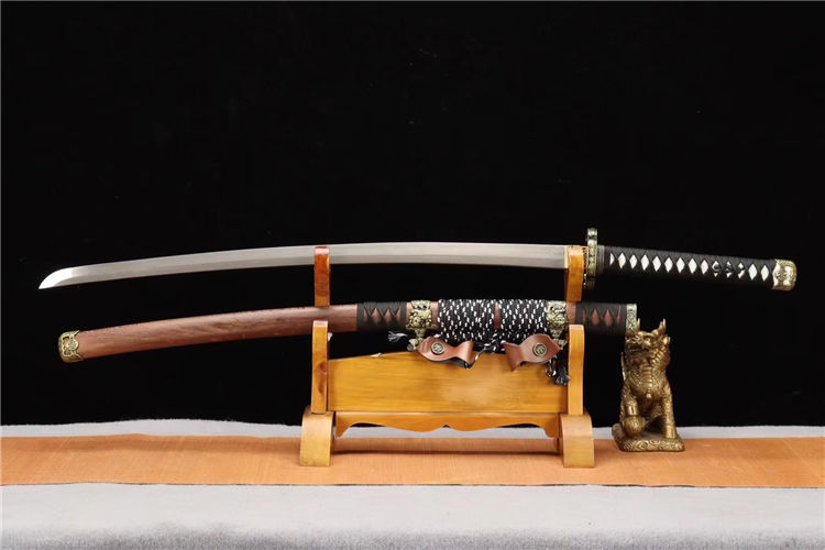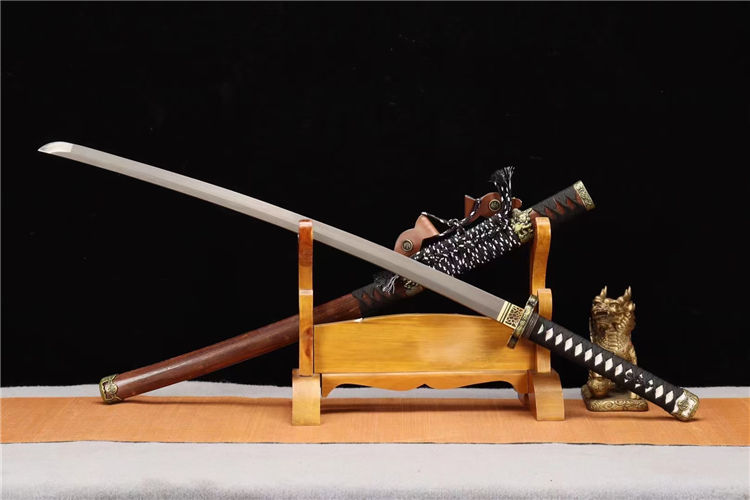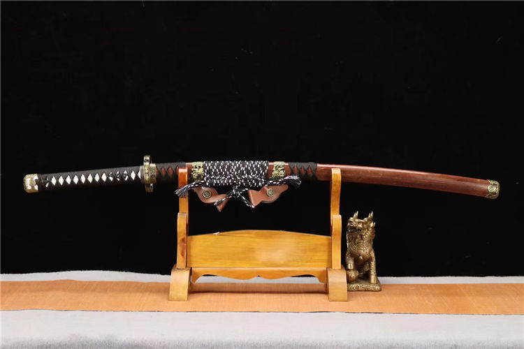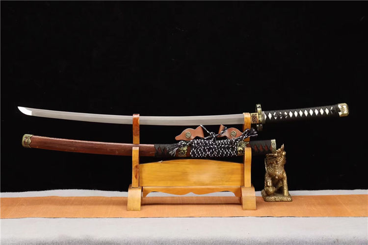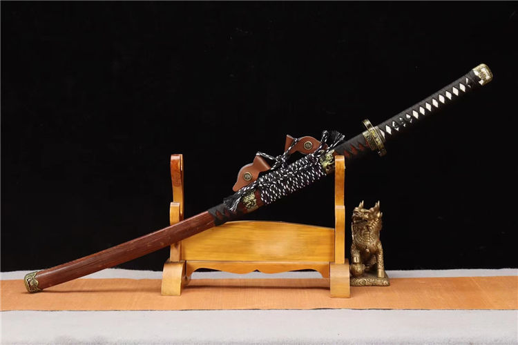 26寸狮子太刀 总长:103cm 刃长:72cm 柄长:27cm 刃宽:3.2-2.8cm 刃厚:0.7-0.5cm 刃材:折叠锻打花纹钢,十四道手工研磨 硬度:刃区硬度58 鞘材:进口花梨木 装具:狮子太刀简装 总重:约1300克 净重:约1050克 刃身:一体锻打刀身 工艺:刃身手工锻造,经过打坯、热煅、铲、锉、研磨、粹火,回火、手工研磨等龙泉刀剑古法制造工序制作而成 性能:砍铁丝或过竹子消纸 注:刀剑为纯手工产品存在误差