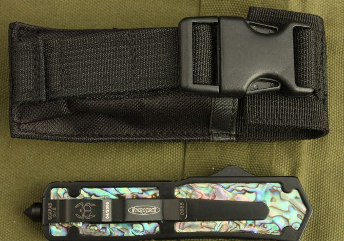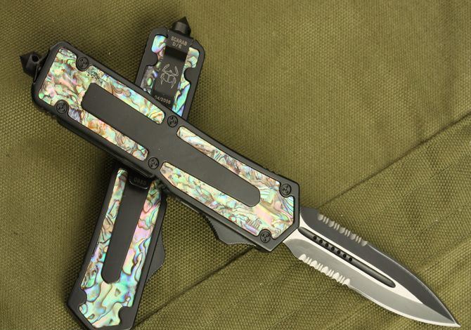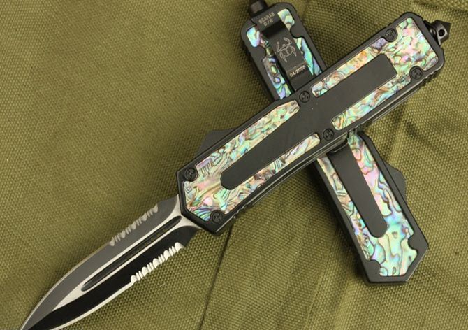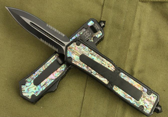双锋半齿圣甲虫-鲍鱼壳珍藏版(黑色) 开启长度:22CM 合起长度:13.5CM 刃 厚:0.3CM 硬 度:57 HRC 刃 材:440c 表 面:发黑 把 手:航空铝合金+鲍鱼 壳净 重:220克(整刀) 毛 重:300克(含包装物) 开 合:双动作,直推开关,自动弹出和收回(刀头比较牢固,只有很轻微的摇动) 包 装:耐磨专用战术尼龙套。 口袋刀夹:弹簧刀夹玻璃敲击器:钨质玻璃敲击