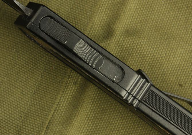 开启长度:22CM 合起长度:13.5CM 刃 厚:0.3CM 硬 度:57 HRC 刃 材:440c 表 面:发黑 把 手:航空铝合金+鲍鱼 壳净 重:220克(整刀) 毛 重:300克(含包装物) 开 合:双动作,直推开关,自动弹出和收回(刀头比较牢固,只有很轻微的摇动) 包 装:耐磨专用战术尼龙套。 口袋刀夹:弹簧刀夹玻璃敲击器:钨质玻璃敲击