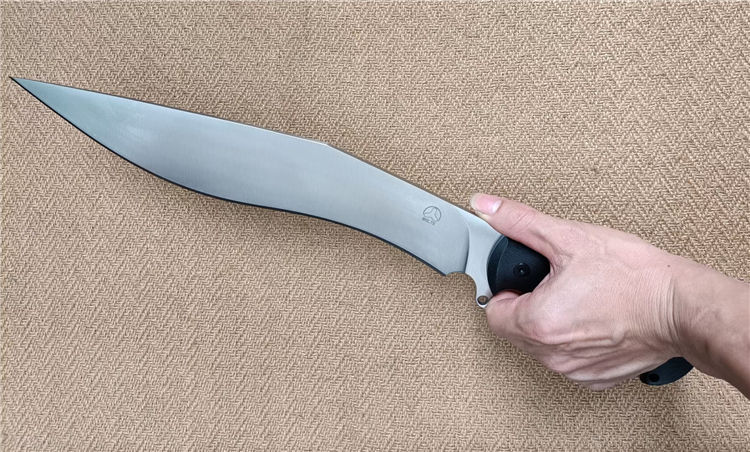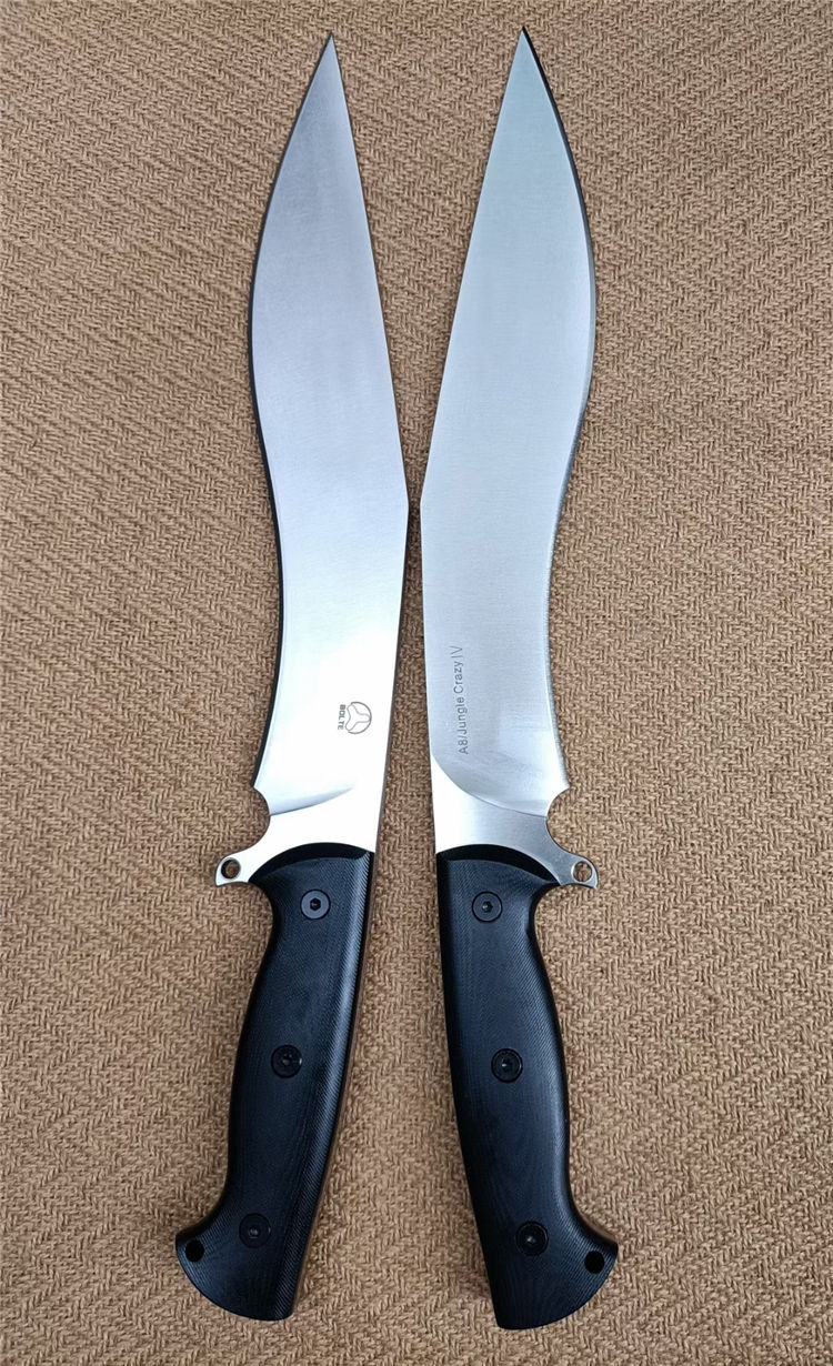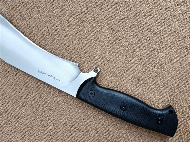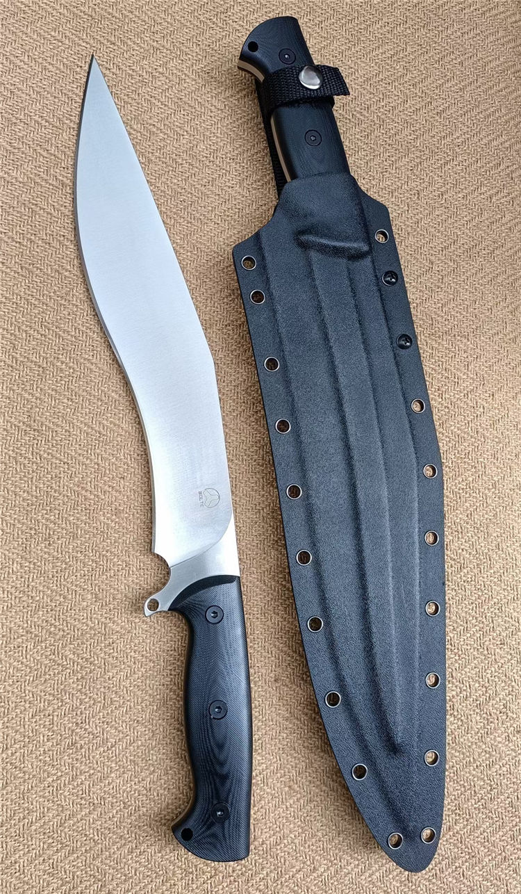 博尔特丛林狂lV狗腿弯刀 全长:470mm 刃长: 324mm 柄长:146mm 刃宽:55mm 刃厚:5.7-5.8mm 刃面:精细幼砂光钢本色 类型:以锋利度,重砍度,韧性保持度最出色.防锈性更佳 开刃方式:二次开刃 刃材:A8钢 热处理:真空淬油热处理和2次回火处理使钢材韧性保持性更佳 硬度:60+0.5HRC 柄材:黑色G10+对锁螺丝钉,一体全柄、握感更舒服、性能更强悍 包装:精美黑纸盒+护刀油+伞绳 净重:720克 刀鞘:配置美国进口K板鞘+万能夹和带扣