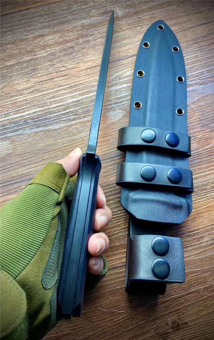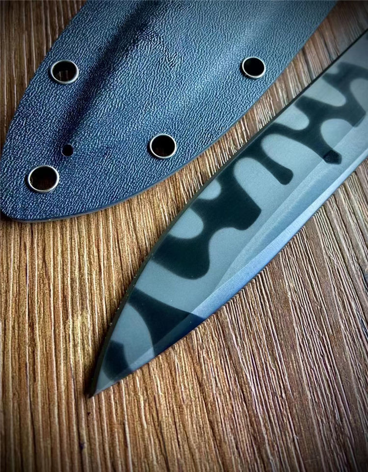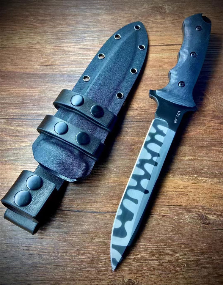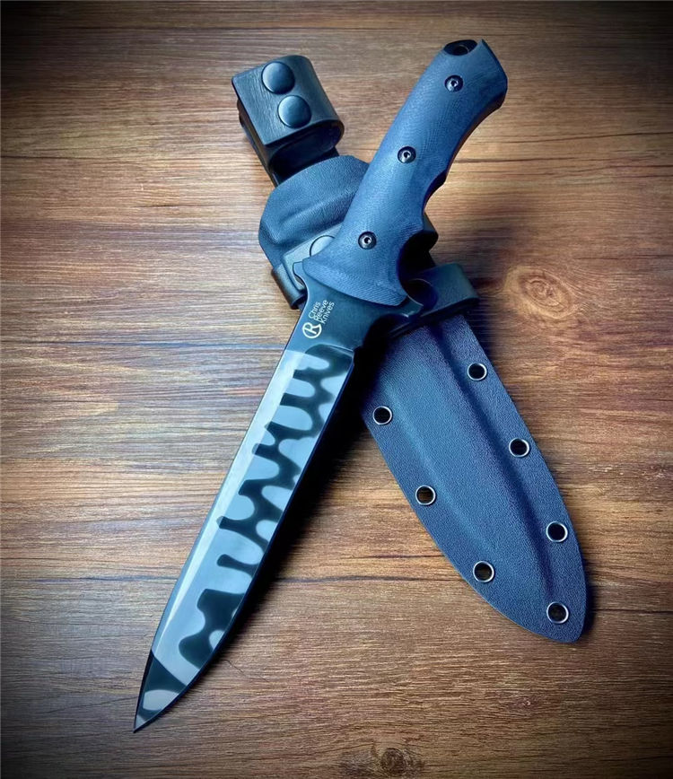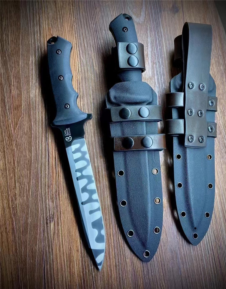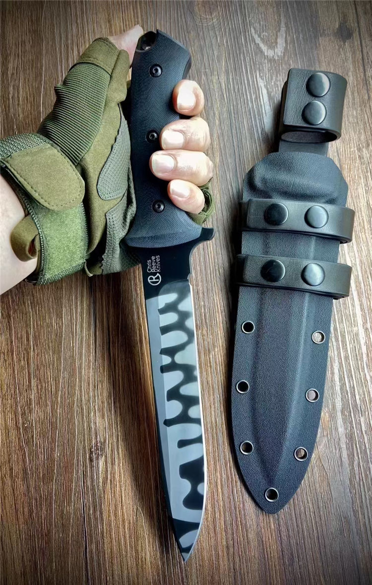 克里斯里夫虎纹直刀 全长:320mm 刃长:190mm 柄长:130mm 钢材:进口A8.电脑锣周边 柄材:G10柄材+钢钉非常牢固.好手感完美 硬度:60RHC 热处理:真空热处理 表面:虎纹效果 净重:500克 刃厚:8.2mm 刀鞘:进口K鞘+牛皮带 包装:精美合子 收藏户外一把好刀