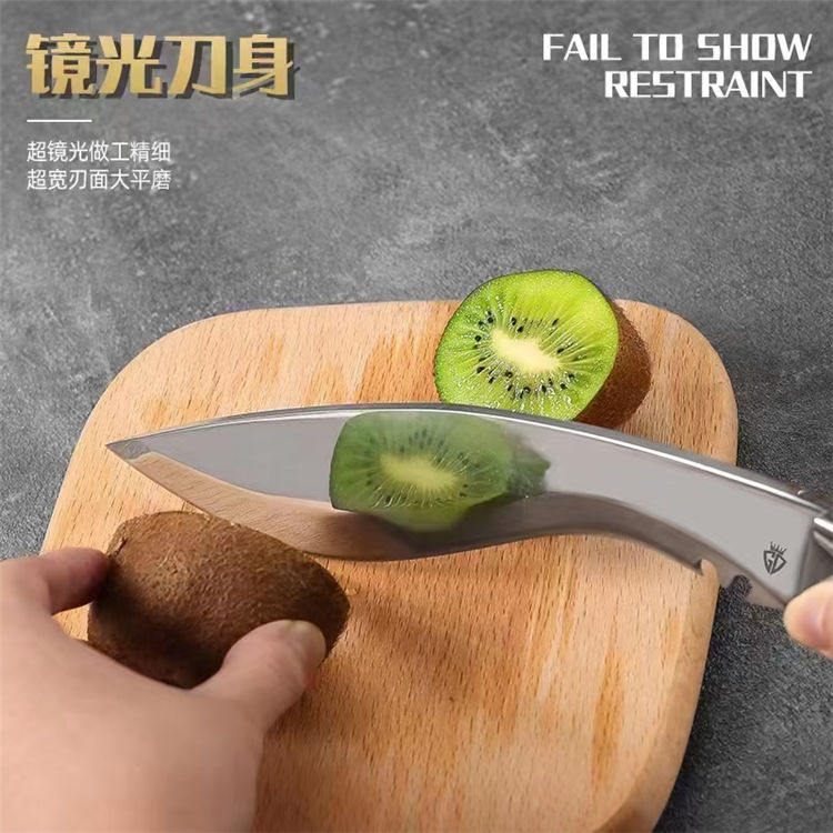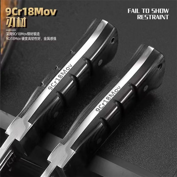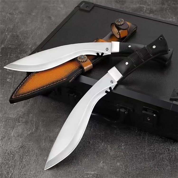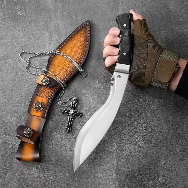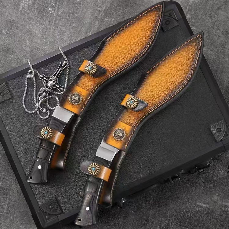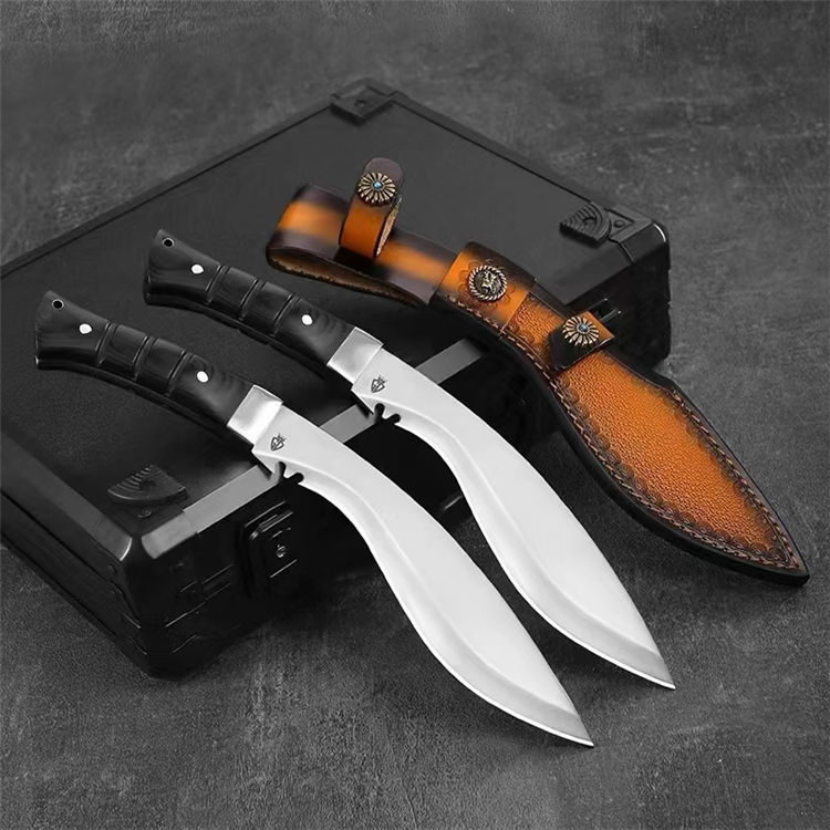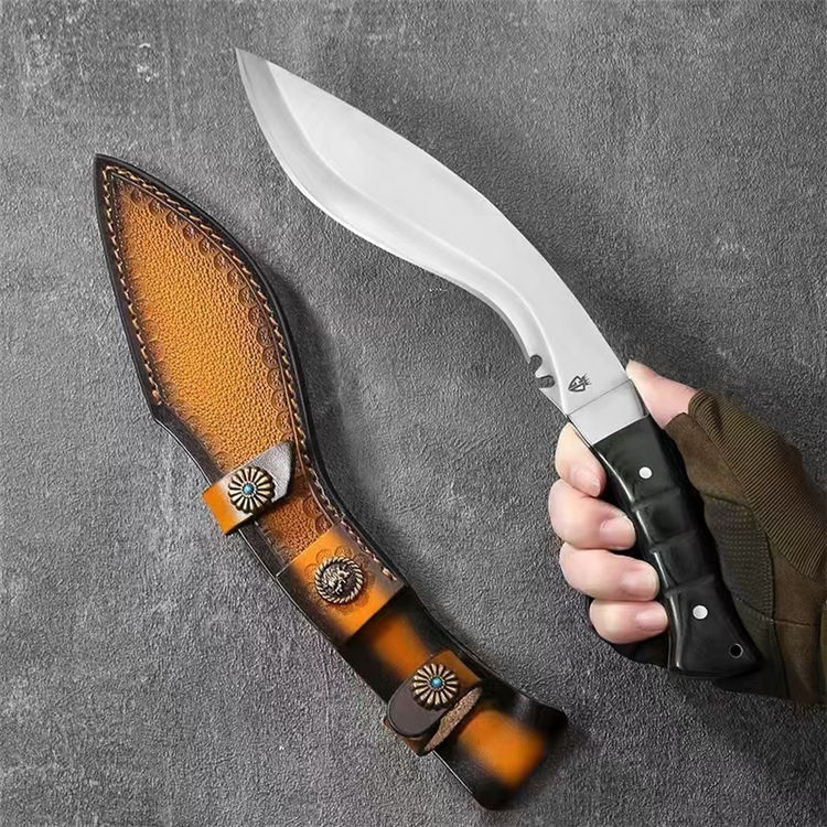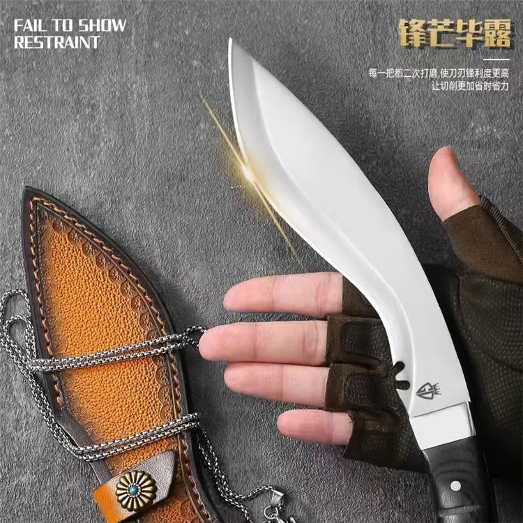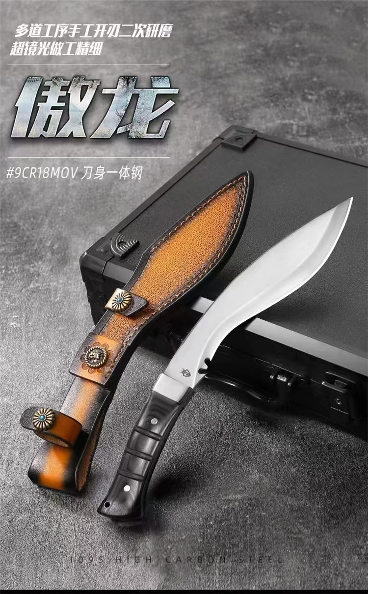 尼泊尔廓尔喀傲龙狗腿弯刀 全长:310mm 刃长:185mm 柄长:125mm 刃宽:45mm 刃厚:5mm 刃材:9Cr18Mov钢 深冷处理 刀重:360g 毛重:440g (含鞘) 硬度:60HRC 表面:超镜光 柄材:进口黑彩木 结构:一体龙骨 配套:手工压花牛皮套 包装:黑色礼品盒