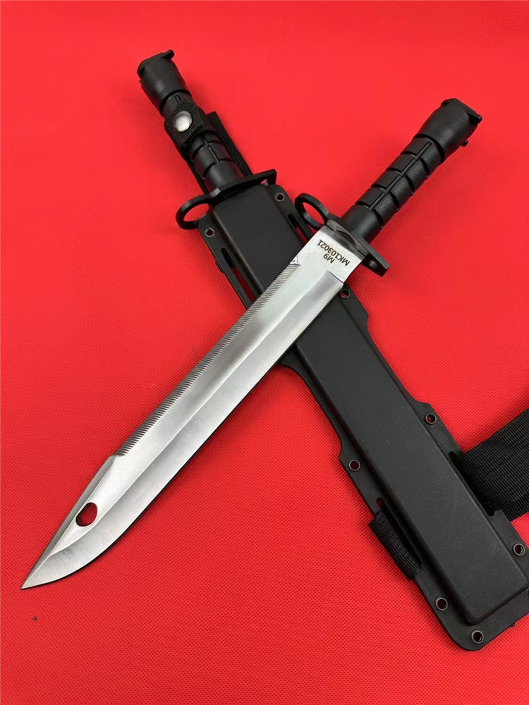 加长版D80-M9军刺 全长:44cm 刃长:33cm 柄长:14cm 刃厚:5.8mm 刃材:5CR17 柄材:ABS 硬度:58HRC 净重:390g 毛重:710g 表面:钢本色