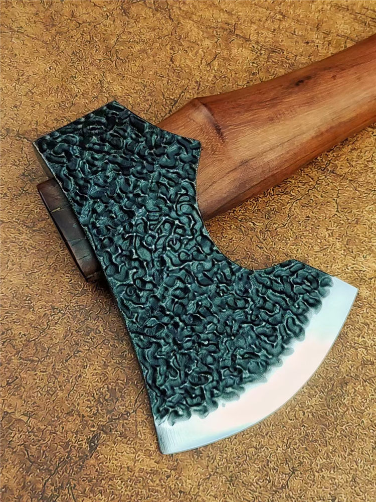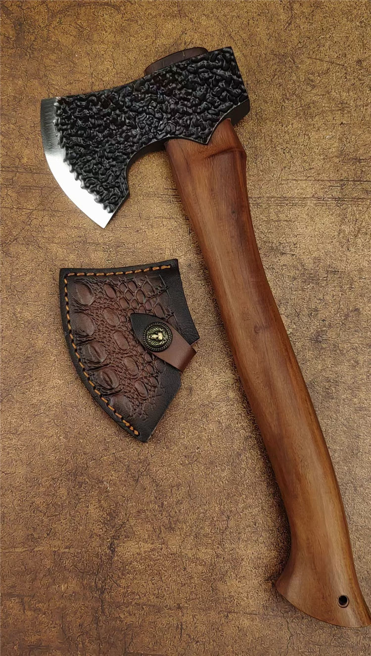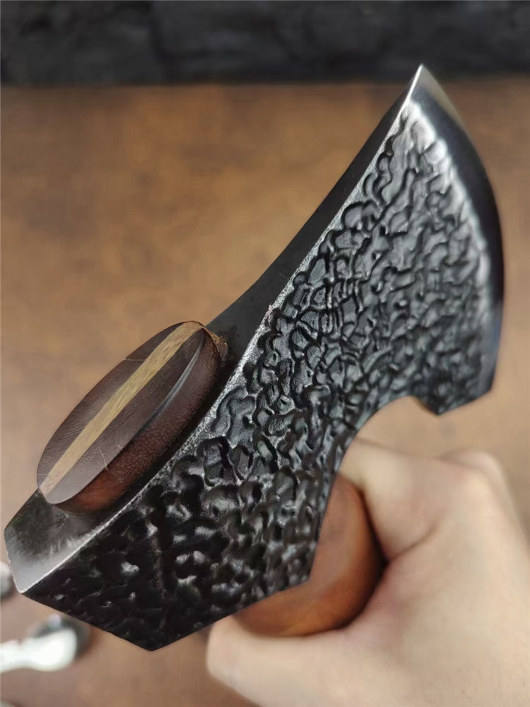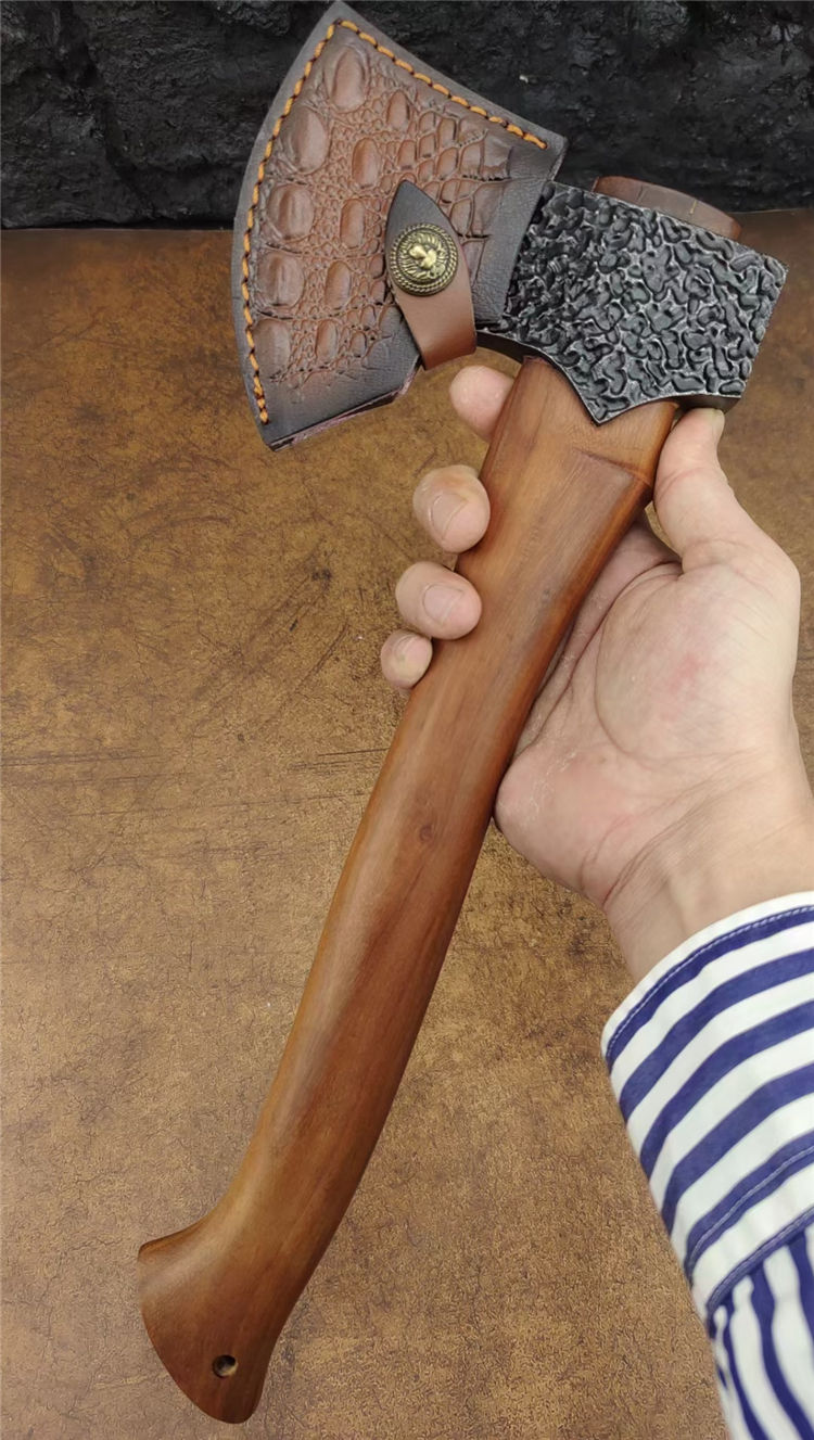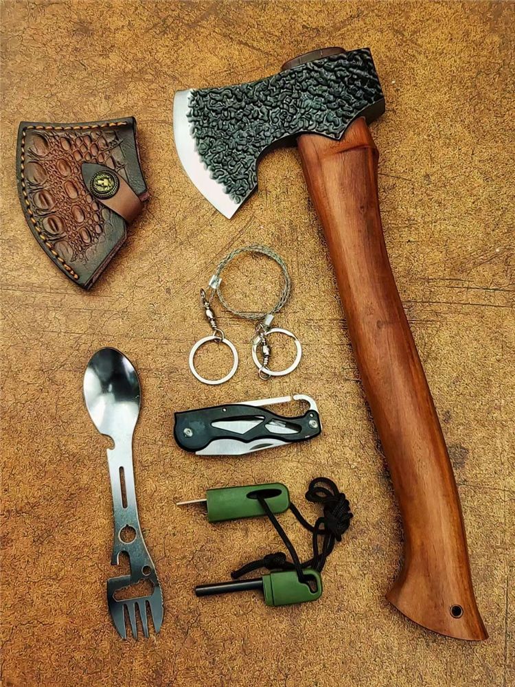 下山·斧 柄长:38cm 斧头刃长:10.3cm 斧头宽度:145mm 钢材:进口CPM-D2合金钢 最大厚度:30mm 硬度:硬度61-62HRC 热处理:上海专业真空深冷热处理 表面:锻打锤纹发黑+镜光效果手 柄材:微粒黄檀木光滑无比人体工学手感一流!爱不释手 包装:手工雕花皮套+黑色手工盒装 配套:打火石、线锯、多功能勺子,折叠刀,牛皮套