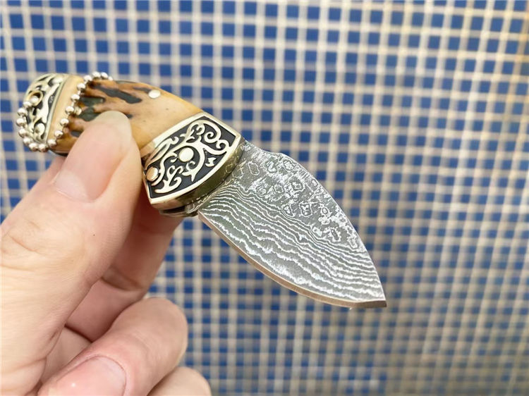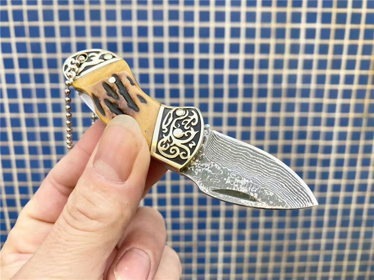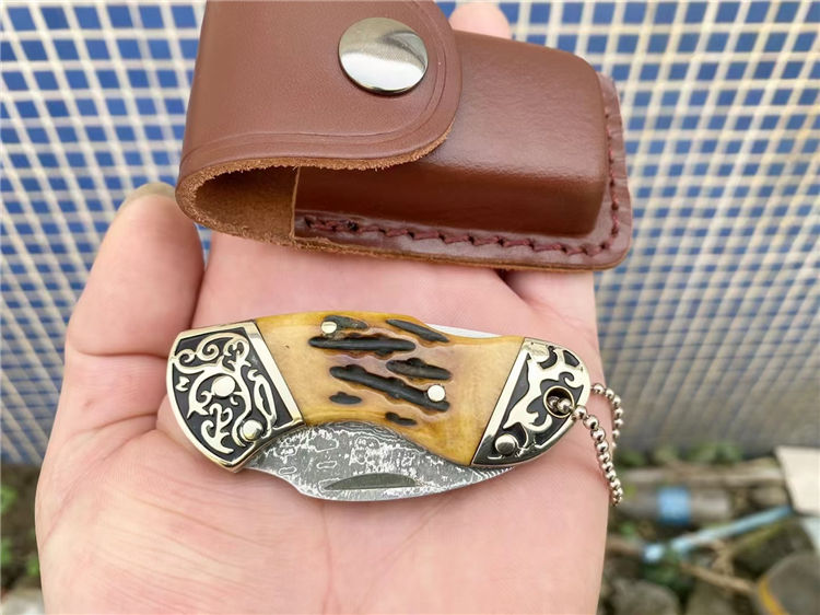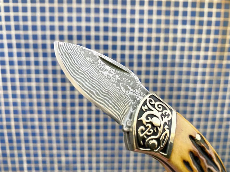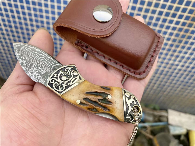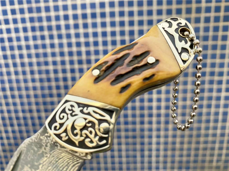 大马士革骆驼骨折刀 全长:11.1cm 刃长:4.1cm 柄长:6.8cm 刃宽:2.2cm 刃厚:2.8mm 刃材:大马士革 重量:105g(含包装) 硬度:57-58HRC 表面:大马士革纹 柄材:双雕花钢头+骆驼骨 锁型:背锁 其他:牛皮套